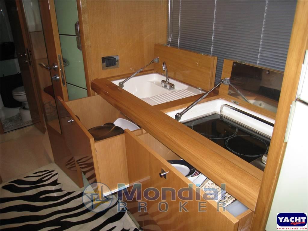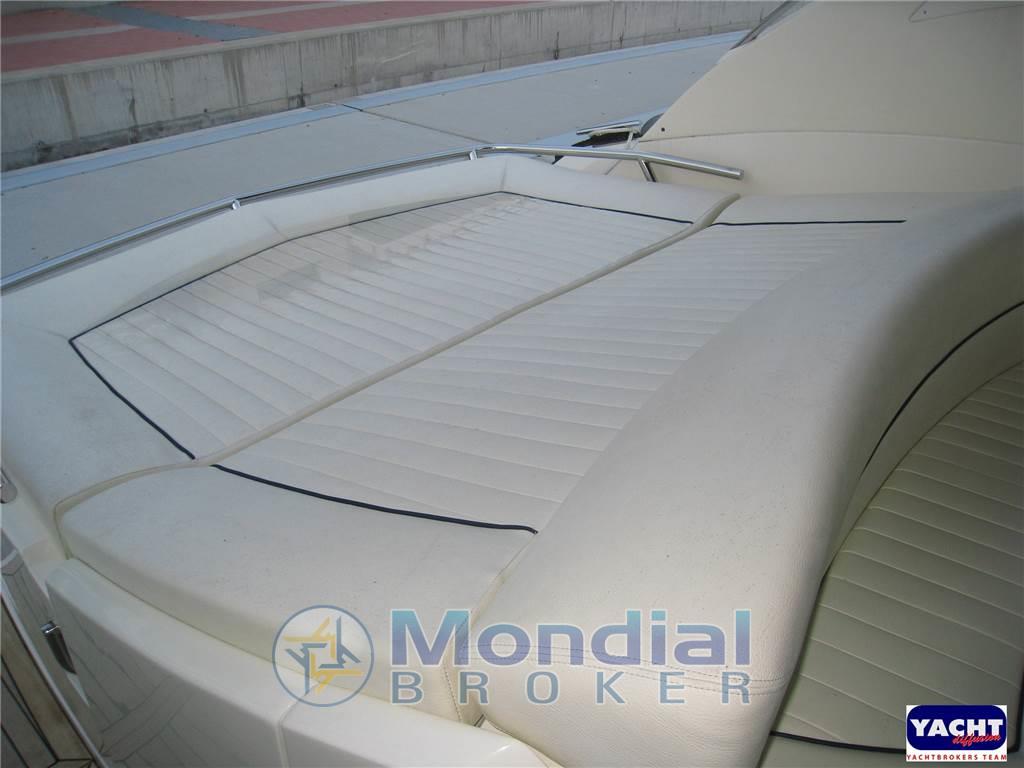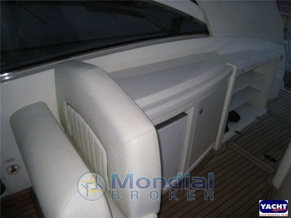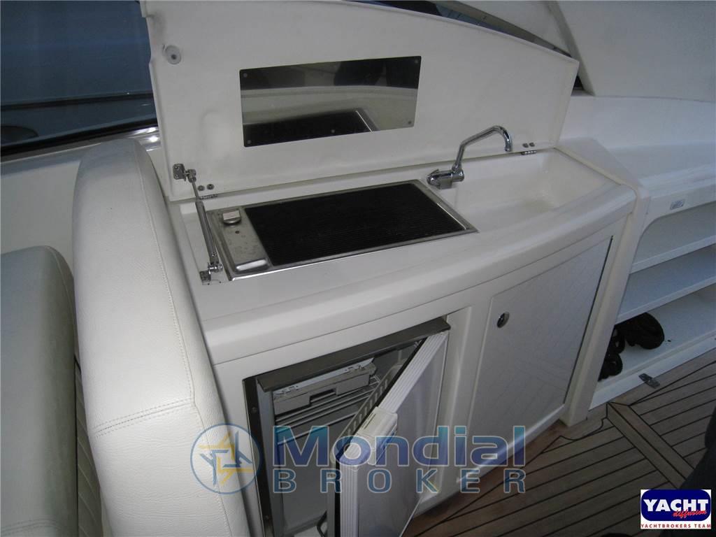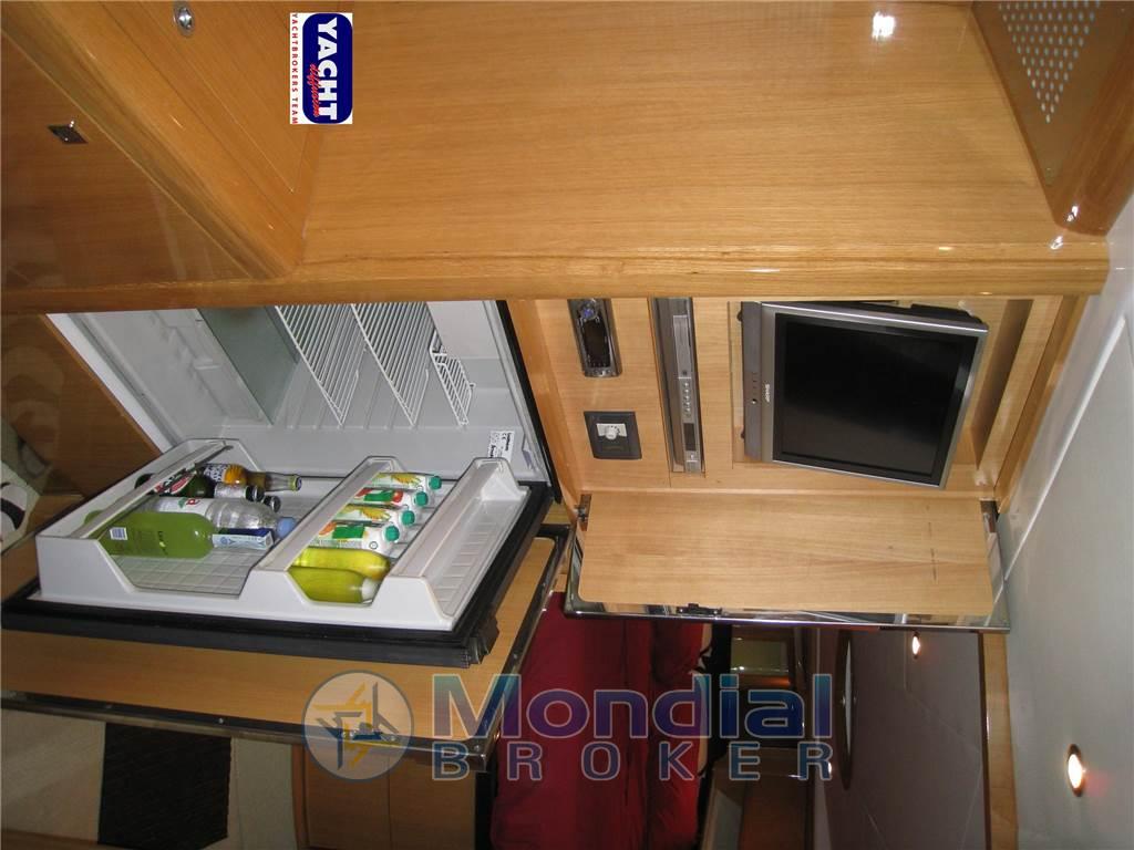 Notas internasNotas de la instrumentaciónAngolo barra, Bussola, Computer di bordo, Contametri catena, Contamiglia, Display, Ecoscandaglio, GPS (Garmin), Pilota automatico, Plotter, Radio VHF.Notas de armamentoAllestimento tecnico e di coperta:Allarme motore, Allarme sentina, Apertura Vano Motore Elettrica, Autogonfiabile, Doccia esterna, Elica di prua - bow thruster, Faro orientabile, Flap idraulici, Garage per tender, Impianto antincendio, Indicatori Flaps, Luci di cortesia, Luci subacquee, Passerella (Idraulica), Piattaforma, Pompa di sentina automatica, Pompa di sentina manuale, Pozzetto Teak, Presa 220V banchina, Presa acqua banchina, Raddrizzatore, Rollbar, Salpa Ancore Elettrico, Scaletta da bagno, Sistema Depurazione acque nere, Tavolo pozzetto, Tavolo Salone Abbattibile, Tromba. Dotazioni domestiche di bordo: Aria condizionata, BBQ/ Grill, Clima reversibile, Impianto acque nere, Prese interne 12v, Prese interne 220v, Serbatoio Acque Nere, 2 WC marino elettrico. Dotazioni di sicurezza: Giubbetti di salvataggio. Intrattenimento: Altoparlanti, Decoder satellite, Impianto TV, Meccanismo saliscendi per TV, Radio AM/FM, Stereo, TV. Cucina ed elettrodomestici: Cucina, Frigorifero esterno, Frigorifero interno (LT 145), Ghiacciaia, Macchina caffè, Microonde, Piastra in vetroceramica. Tappezzerie: Cappottina, Cuscineria completa, Cuscineria di poppa, Cuscineria di prua, Cuscineria Pozzetto, Oscuranti, Teli copri finestra, Telo copriconsolle, Tendalino, Zanzariere. |