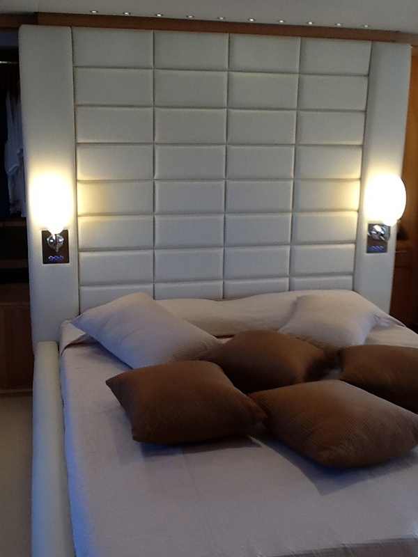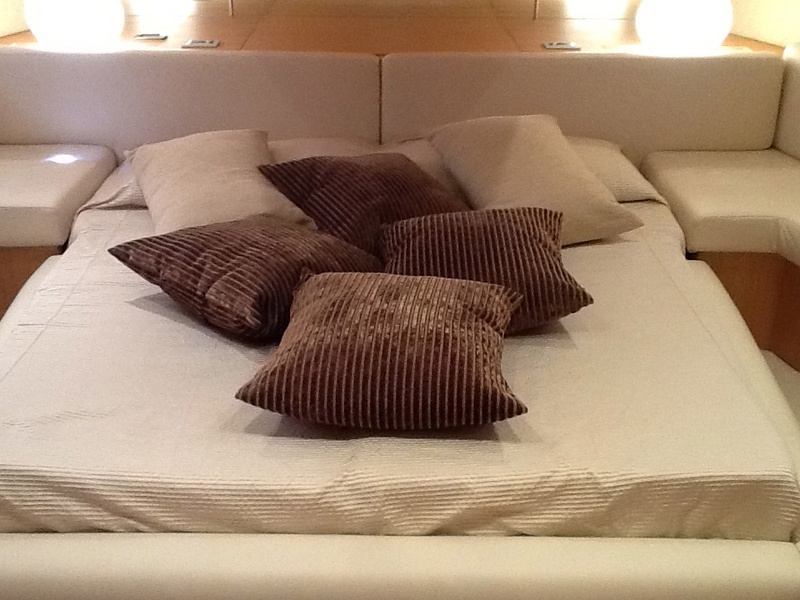 LA BARCA E' PERFETTE IN TUTTI SUOI PARTICOLARI GESTITA CON CURA DAL COMANDANTE E MARINAIO, PRONTA PER VOI PER QUALSIASI PROVA ......... LEGGETE I SUOI DETTAGLI......: Dal pozzetto si accede direttamente al salone, dove si respira subito l'atmosfera da loft che caratterizza un po' tutti gli interni firmati Aicon. Immancabile, quindi, la netta sensazione di aria e di luce che si prova in ogni angolo dell'ambiente, grazie anche alle separazioni più virtuali che reali. Sul lato sinistro si trova subito il salotto, con due divani posti a "L" e un tavolo costituito da quattro pouf che, all'occorrenza, possono essere distribuiti come sedute aggiuntive. Proseguendo verso prua, separata da un elemento divisorio che nasconde il televisore a lcd retrattile, la zona pranzo è formata da un tavolo stondato che permette di accomodare 6-8 persone. Benché sia anch'esso opportunamente attrezzato, il lato dritto del salone è sfruttato più che altro come via di comunicazione con gli altri ambienti dello stesso ponte: la bella cucina separata, che si sviluppa a "U" sul lato sinistro, perfettamente a mezzanave, e la plancia. Composta da una timoneria di taglio tecnico, posta sulla sinistra, e da una piccola dinette in funzione di quadrato, sul lato opposto, essa costituisce il cuore del quartiere dedicato all'equipaggio, che si sviluppa poi fino all'estrema prua, su quota inferiore. Al personale sono destinate due cabine (una doppia e una singola), una toilette, un salottino e una cucina. Attraverso una scala curva, posta in prossimità del salone, si scende al piano delle cabine. Secondo una tendenza ormai consolidata, l'armatoriale è nella posizione più arretrata, laddove cioè i movimenti dello scafo sono meno sensibili e la separazione dagli altri alloggi risulta più marcata. L'ambiente è assai ampio e luminoso (sono di sua competenza i quattro grandi oblò circolari che si stagliano sulle fiancate), con un grande letto matrimoniale centrale, angolo scrittoio, salottino, bagno con vasca angolare. Verso prua, ai lati del corridoio |