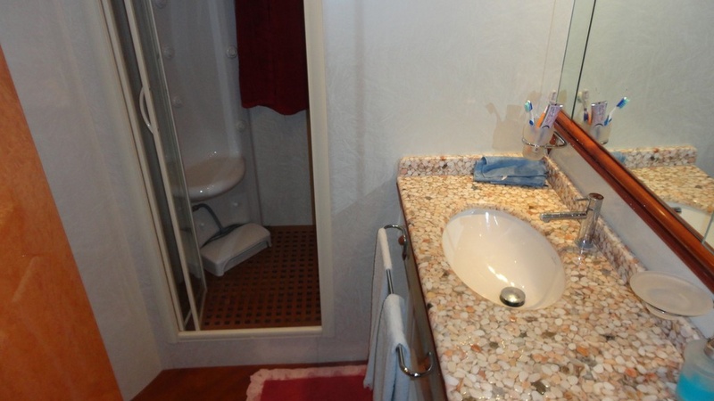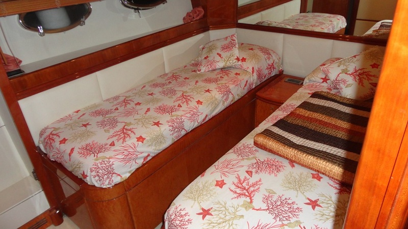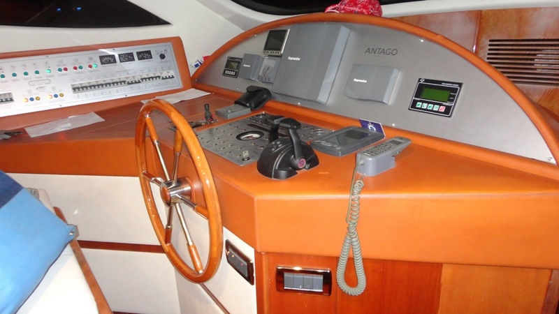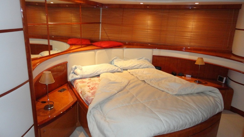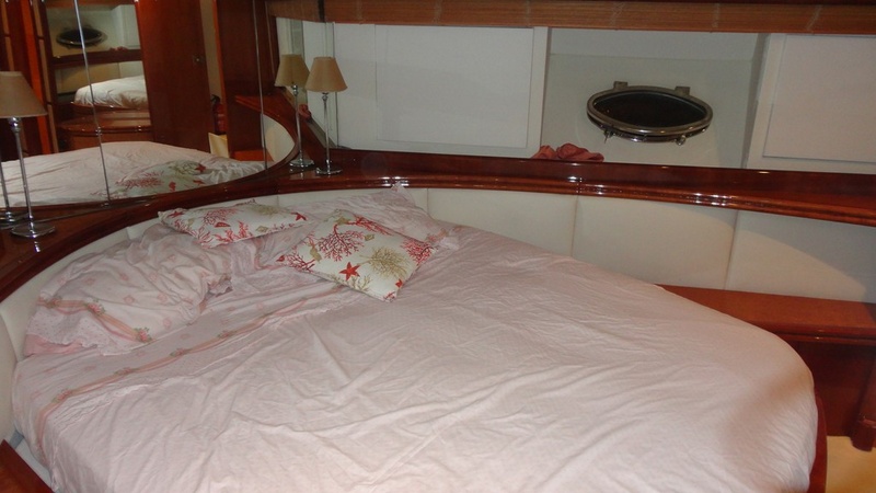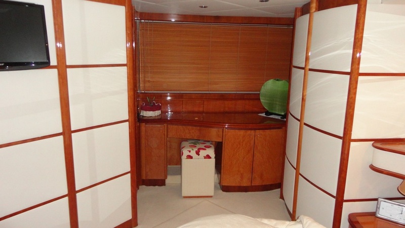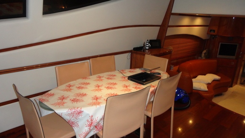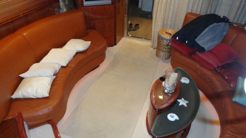 Notas internasCentro de barco de cabina del propietario con doble VESTIER + baño con cabina de ducha-doble VIP en el arco con baño + ducha doble cabina con camas planas + cuarto de baño con cabinas de ducha + servicio con acceso a terraza-amplio LIVING COMEDOR con sofás y mesa + oposición comedor con mesa y sofá, mesa de comedor + 6 sillas cristal separado cocina completa con estufa + nevera + congelador + lavado lavavajillas máquina brillante lacado cereza madera INTERIOR -