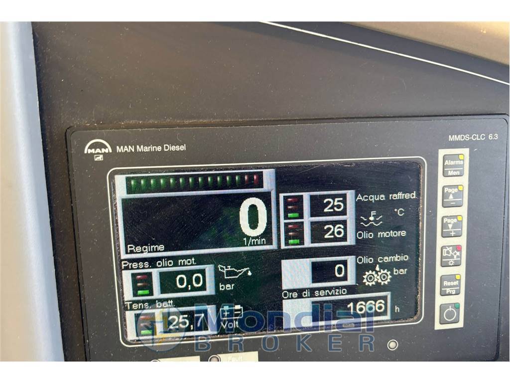 Notas internasCucina: Ad induzione Frigo: Presente Freezer: Presente TV E INTRATTENIMENTO Tv dinette: Presente Tv in tutte le cabine: Solo Impianto HI-FI: Presente Casse interne ed esterne: Presenti SERVIZI Cabine: 3 + equipaggio Bagni: 2 Ospiti: 6+ Notas de la instrumentaciónCONSOLEBussola: Presente Radio VHF: Presente Comandi salpa ancora: Presente Ecoscandaglio: Presente Pilota automatico: Presente Radar: Presente Notas de armamentoSCAFO ED EQUIPAGGIAMENTOScafo: Planante Materiale: VTR Ancora: Presente (Inox) Catena: Zincata Passerella: Telescopica, esterna Teak: Presente Luci di fonda: Presente Elica di prua: Presente |