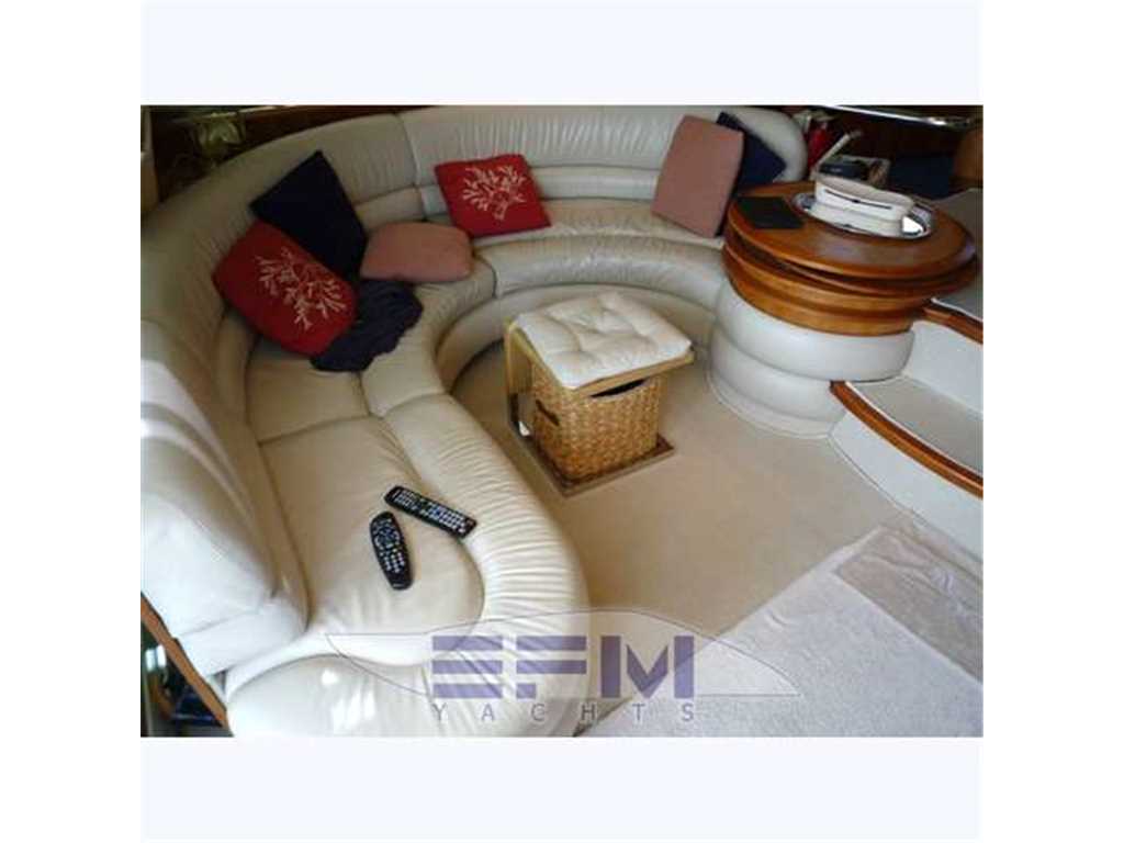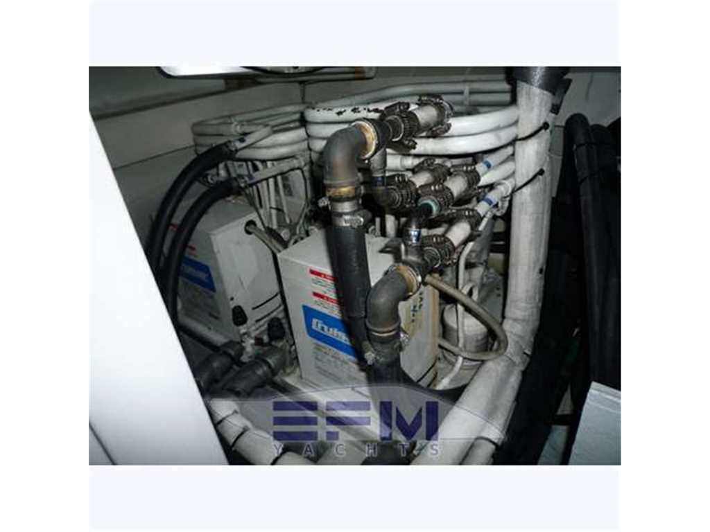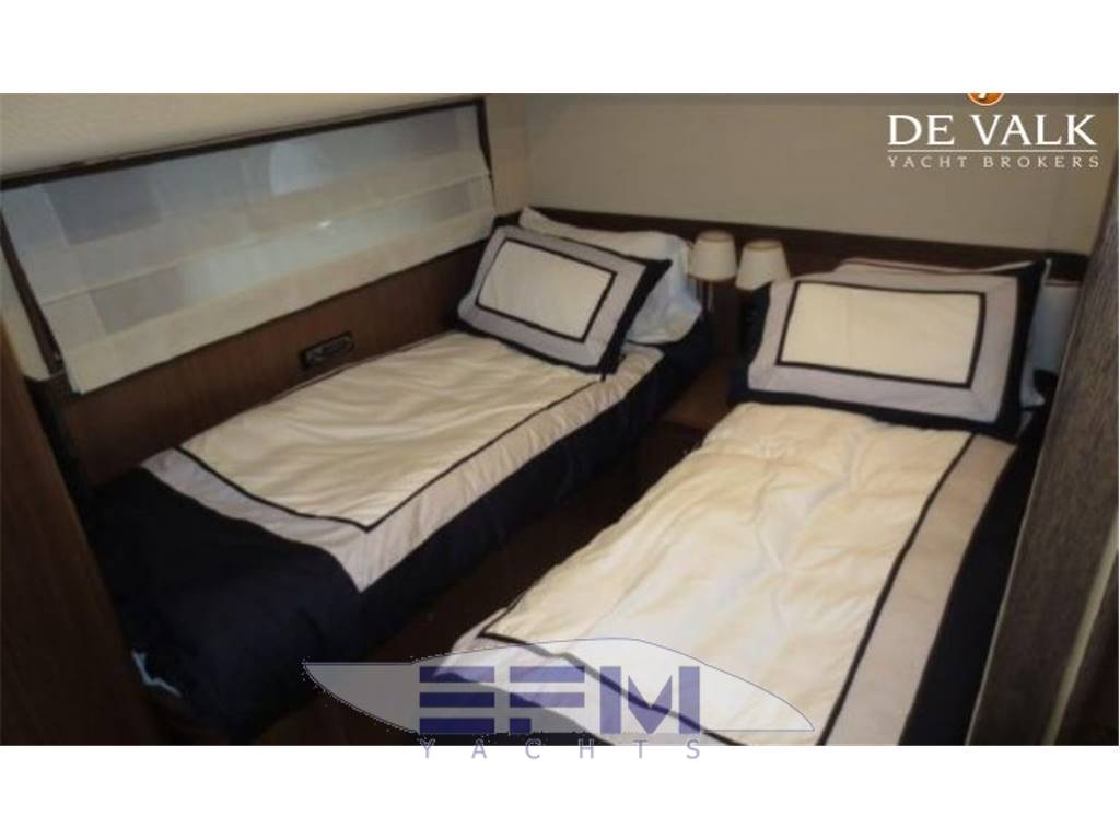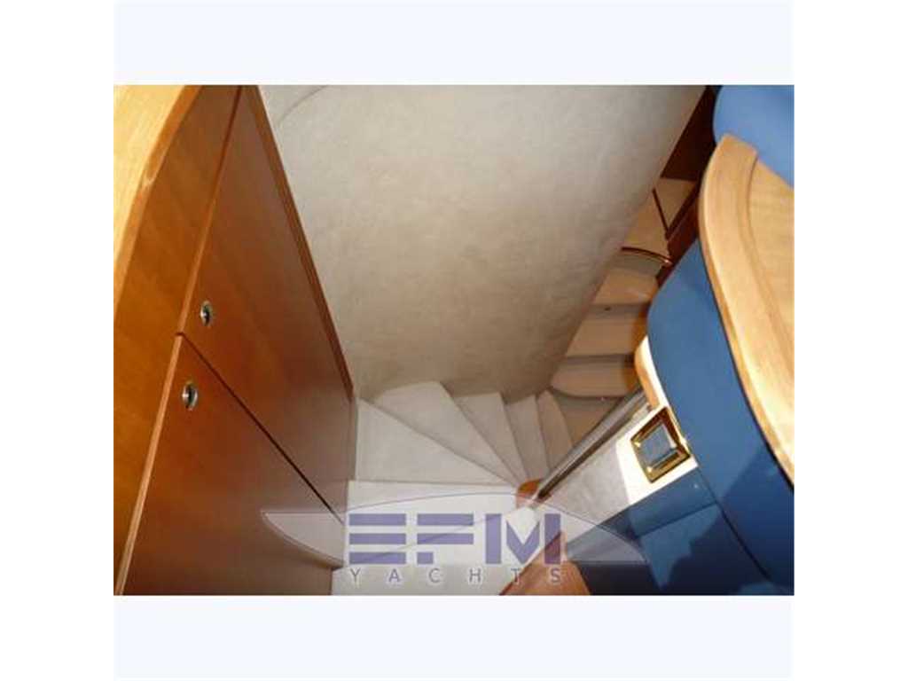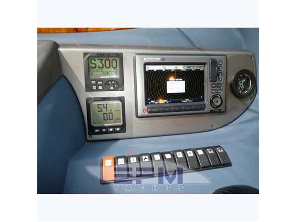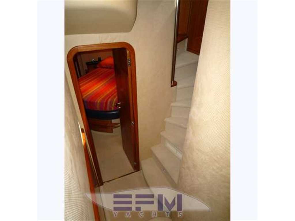 Notas internas1 Master cabin ensuite 1 VIP cabin ensuite 1 Twin cabin 1 Day head 1 crew cabin (2 beds) She can accommodate up to 6 guests overnight in three elegant cabins, distributed on the lower deck: a Master stateroom, a VIP stateroom, a Twin cabin with direct access to the day head The full-beam Master stateroom is located at the stern of the ship and features large closets, a generous double bed, flat-screen TV and an en-suite bathroom with shower. On the other side of the hallway there is the VIP stateroom, positioned in front of the Master, and it features a double bed, built-in wardrobes, a flat-screen TV and an en-suite bathroom with shower. Between the Master and the VIP staterooms, we find the Twin cabin; it features two single beds and direct access to the day head with shower Notas de la instrumentaciónDrive shaft Engine controls electricalEngine controls at Stern deck Bowthruster & Sternthruster Propeller shaft material stainless steel Electric bilge pump Electrical installation 12/24/230v Ssecond Generator Mase 12 KW Battery charger Inverter Shorepower with cable Winder Insulation transformer Gyroscopic Mitsubishi Stabilizers Trimtabs Third drive station on cockpit NAVIGATION INSTRUMENTS REPETED ALSO ON FLYBRIDGE Depth sounder ,Log ,VHF , Autopilot, Radar, GPS, Plotter . Notas de armamentoBimini on flybridegeSun awning retractable at cockpit Cockpit cushions Cockpit table Bathing Platform Boarding ladder Transom door Gangway Retractable Hyd. Deck shower Anchor Anchor chain Windlass 2000 W Capstan 2 x 700 W Deck wash Deck crane on Fly Sea railing stainless steel Life raft Horn Fenders yes Mooring lines 3 flat TV (40',26',20') TV receiver Direct HD Satellite KHV Trac Vision DVD player Surround Sound System BOSE Cockpit speakers Speakers in salon Speakers in cabin Extinguisher in engine room yes tender garage Swim Platform electric openening |