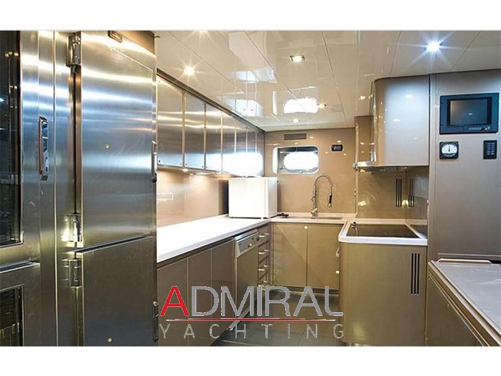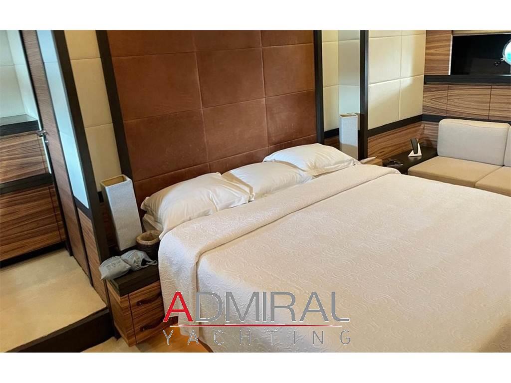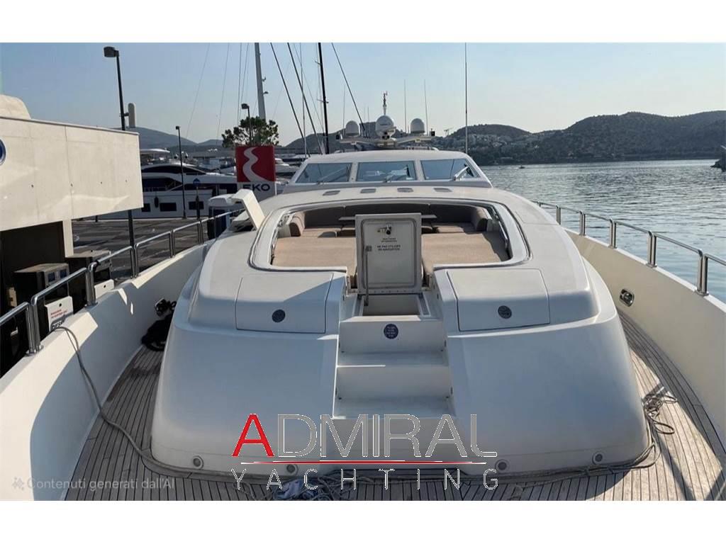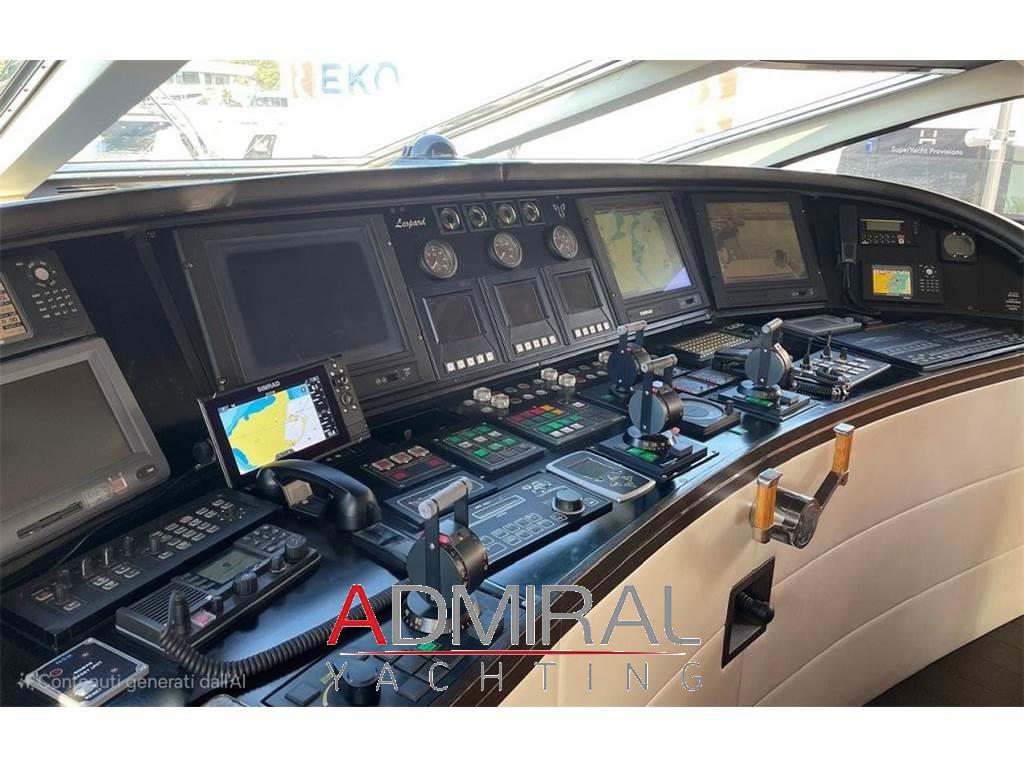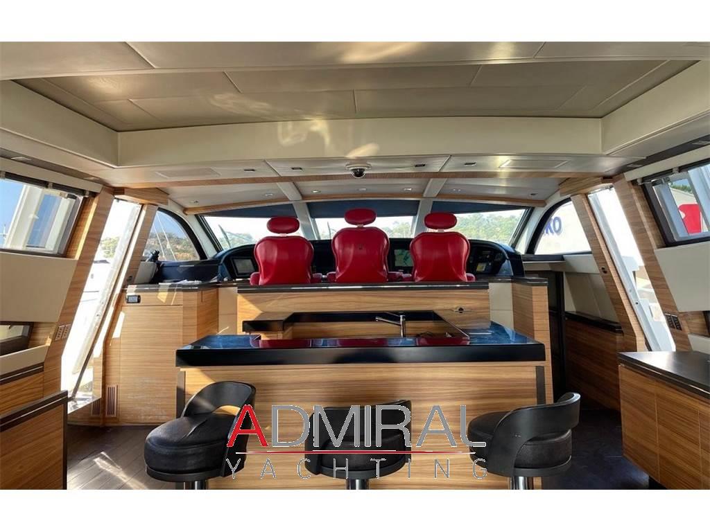 Notas internasIngresso con zona lounge, divano ad L sulla sinistra e divano con tavolini pieghevoli a dritta Angolo bar centrale dietro la timoneria con tetto panoramico Sala home cinema a prua con TV 60" 3D convertibile in una 5° cabina doppia con divani-letto e bagno Ponte inferiore Suite armatoriale a centro nave a tutto baglio, con letto king size, area lounge, TV widescreen e bagno privato Cabina VIP a prua con letto king size, area lounge, TV widescreen e bagno privato Cabina ospiti con letto matrimoniale, TV widescreen e bagno privato a dritta, tra la cabina VIP e quella armatoriale Cabina ospiti con letti in piano, pullman opzionale, TV widescreen e bagno privato a sinistra Cabina equipaggio con letti in piano e bagno privato con ingresso indipendente dal gavone di prua Cabina comandante con letto singolo, cabina equipaggio con letti a castello, cucina e lavanderia a centro nave e sala macchine a poppa Antistante l'ingresso al salone principale sono presenti divani angolari su entrambi i lati con due tavolini e un divano che si unisce ad un ampio prendisole lungo la poppa. Una scala su entrambi i lati conduce alla piattaforma da bagno del ponte inferiore. Camminamenti laterali conducono lungo il ponte principale fino al ponte di prua, dove si trova un altro divano a C con due tavolini ed ampi lettini prendisole Notas de la instrumentaciónAIS, Angolo barra, Antenna radar, Bussola, Comandi motori elettronico, Computer di Bordo, Contametri catena, Contamiglia, Display, DSC vhf, Ecoscandaglio, GPS, Luci di navigazione, Pilota automatico, Plotter, Plotter con antenna GPS, Radar, radio VHF, Sedile copilotaNotas de armamentoAllestimento tecnico e di copertaAllarme fumo/gas, Allarme motore, Allarme sentina, Ancora, Autoclave, Auto-Trim, Batterie, Camminamenti laterali in teak, Caricabatterie, Doccia esterna, Elica di poppa - Stern thruster, Elica di prua - Bow thruster, Faro orientabile, Flap idraulici, Garage per tender, Gruette per moto d'acqua, Gruette per tender, Hard top, Impianto antincendio, Indicatori Flaps, Lavandino nel pozzetto, Luci di cortesia, Moto d'acqua (Seadoo 155 Hp), Passerella, Piattaforma, Pompa di sentina automatica, Pompa di sentina elettrica, Pompa di sentina manuale, Ponte in teak, Porta ingresso, 2 Porta laterale, Pozzetto Teak, Presa 220V banchina, Presa acqua banchina, Salpa Ancore Elettrico, Scaletta da bagno, Tavolo pozzetto, Tavolo Salone Abbattibile, Tender, Tetto panoramico, Tromba, Winch tonneggio di poppa Dotazioni domestiche di bordo Aria condizionata, Boiler, Clima reversibile, Controllo Domotica, Dimmer per Luci, Dissalatore, Impianto acque nere, Inverter, Pavimento interno in legno, Prese interne 12v, Prese interne 220v, Riscaldamento, Serbatoio Acque Nere, WC marino elettrico Intrattenimento Altoparlanti, Home Theater (Home Cinema con schermo 3D 60" 3D), Impianto TV, iPod nel salone di coperta, nella sala TV, nella cabina armatoriale e nella cabina VIP, Radio AM/FM, Sistema AV Crestron, Stereo (Impianto stereo surround B&O), 6 TV (42" salone, 60" 3D home cinema e nelle cabine) Cucina ed elettrodomestici Congelatore, Cucina, Forno, Frigorifero esterno, Frigorifero interno, ICE Maker, Lavasciuga, Lavastoviglie, Macchina caffè, Piastra in vetroceramica, Winecooler Tappezzerie Cuscineria completa, Cuscineria di poppa, Cuscineria di prua, Cuscineria pozzetto, Teli copri finestra |