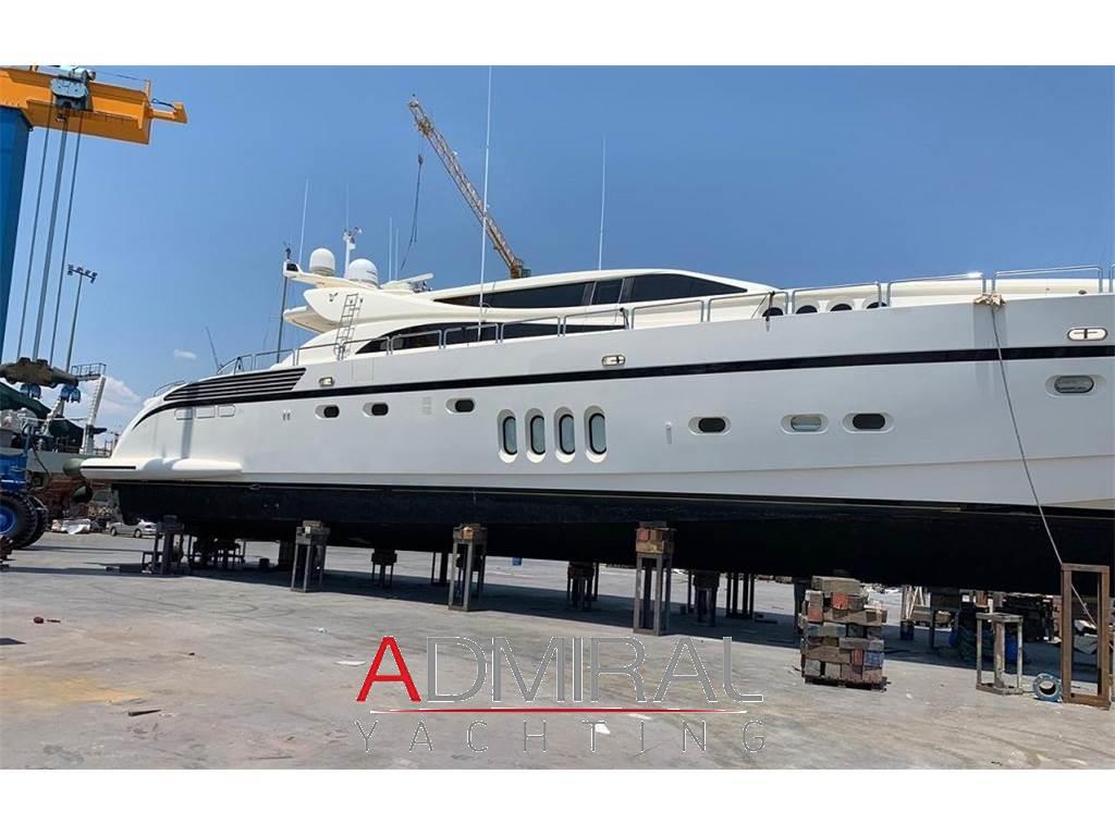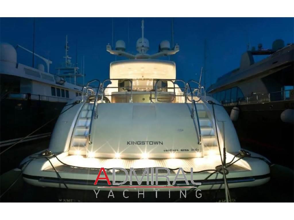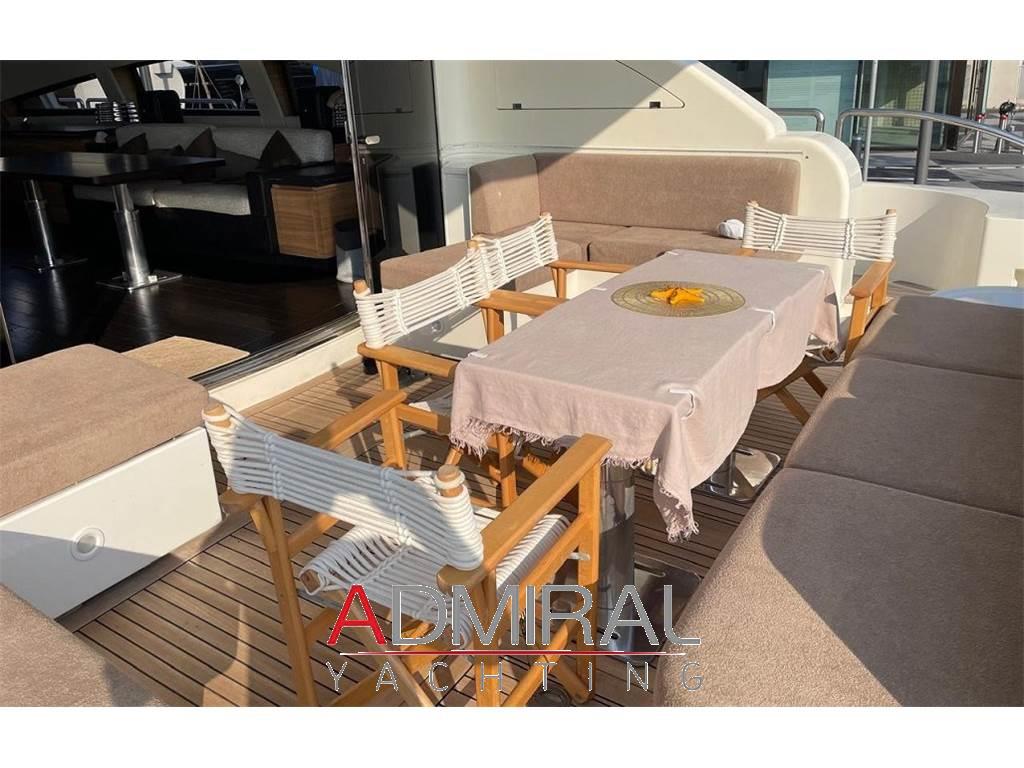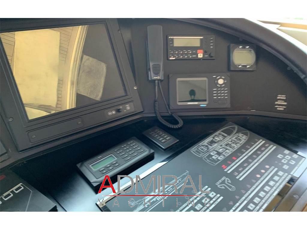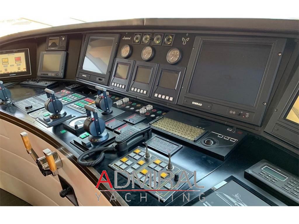 Notas internasIngresso con zona lounge, divano ad L sulla sinistra e divano con tavolini pieghevoli a dritta Angolo bar centrale dietro la timoneria con tetto panoramico Sala home cinema a prua con TV 60" 3D convertibile in una 5° cabina doppia con divani-letto e bagno Ponte inferiore Suite armatoriale a centro nave a tutto baglio, con letto king size, area lounge, TV widescreen e bagno privato Cabina VIP a prua con letto king size, area lounge, TV widescreen e bagno privato Cabina ospiti con letto matrimoniale, TV widescreen e bagno privato a dritta, tra la cabina VIP e quella armatoriale Cabina ospiti con letti in piano, pullman opzionale, TV widescreen e bagno privato a sinistra Cabina equipaggio con letti in piano e bagno privato con ingresso indipendente dal gavone di prua Cabina comandante con letto singolo, cabina equipaggio con letti a castello, cucina e lavanderia a centro nave e sala macchine a poppa Antistante l'ingresso al salone principale sono presenti divani angolari su entrambi i lati con due tavolini e un divano che si unisce ad un ampio prendisole lungo la poppa. Una scala su entrambi i lati conduce alla piattaforma da bagno del ponte inferiore. Camminamenti laterali conducono lungo il ponte principale fino al ponte di prua, dove si trova un altro divano a C con due tavolini ed ampi lettini prendisole Notas de la instrumentaciónAIS, Angolo barra, Antenna radar, Bussola, Comandi motori elettronico, Computer di Bordo, Contametri catena, Contamiglia, Display, DSC vhf, Ecoscandaglio, GPS, Luci di navigazione, Pilota automatico, Plotter, Plotter con antenna GPS, Radar, radio VHF, Sedile copilotaNotas de armamentoAllestimento tecnico e di copertaAllarme fumo/gas, Allarme motore, Allarme sentina, Ancora, Autoclave, Auto-Trim, Batterie, Camminamenti laterali in teak, Caricabatterie, Doccia esterna, Elica di poppa - Stern thruster, Elica di prua - Bow thruster, Faro orientabile, Flap idraulici, Garage per tender, Gruette per moto d'acqua, Gruette per tender, Hard top, Impianto antincendio, Indicatori Flaps, Lavandino nel pozzetto, Luci di cortesia, Moto d'acqua (Seadoo 155 Hp), Passerella, Piattaforma, Pompa di sentina automatica, Pompa di sentina elettrica, Pompa di sentina manuale, Ponte in teak, Porta ingresso, 2 Porta laterale, Pozzetto Teak, Presa 220V banchina, Presa acqua banchina, Salpa Ancore Elettrico, Scaletta da bagno, Tavolo pozzetto, Tavolo Salone Abbattibile, Tender, Tetto panoramico, Tromba, Winch tonneggio di poppa Dotazioni domestiche di bordo Aria condizionata, Boiler, Clima reversibile, Controllo Domotica, Dimmer per Luci, Dissalatore, Impianto acque nere, Inverter, Pavimento interno in legno, Prese interne 12v, Prese interne 220v, Riscaldamento, Serbatoio Acque Nere, WC marino elettrico Intrattenimento Altoparlanti, Home Theater (Home Cinema con schermo 3D 60" 3D), Impianto TV, iPod nel salone di coperta, nella sala TV, nella cabina armatoriale e nella cabina VIP, Radio AM/FM, Sistema AV Crestron, Stereo (Impianto stereo surround B&O), 6 TV (42" salone, 60" 3D home cinema e nelle cabine) Cucina ed elettrodomestici Congelatore, Cucina, Forno, Frigorifero esterno, Frigorifero interno, ICE Maker, Lavasciuga, Lavastoviglie, Macchina caffè, Piastra in vetroceramica, Winecooler Tappezzerie Cuscineria completa, Cuscineria di poppa, Cuscineria di prua, Cuscineria pozzetto, Teli copri finestra |
