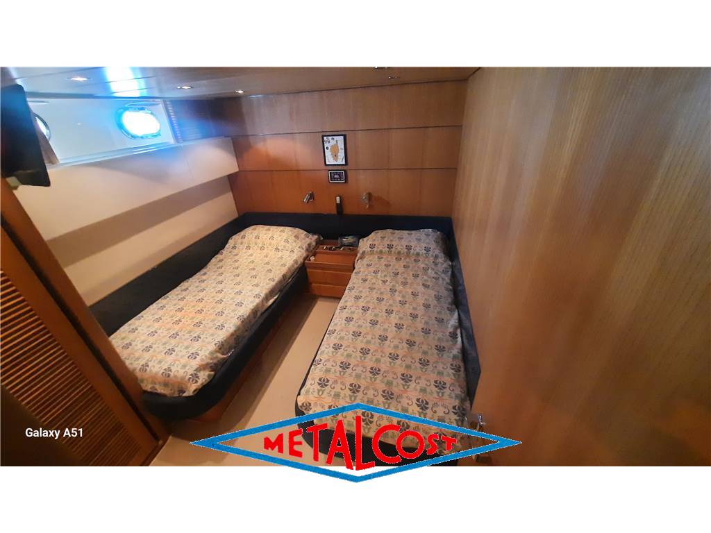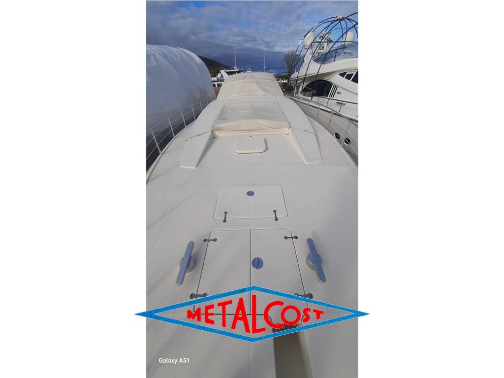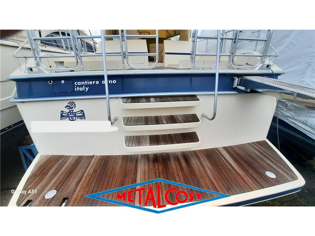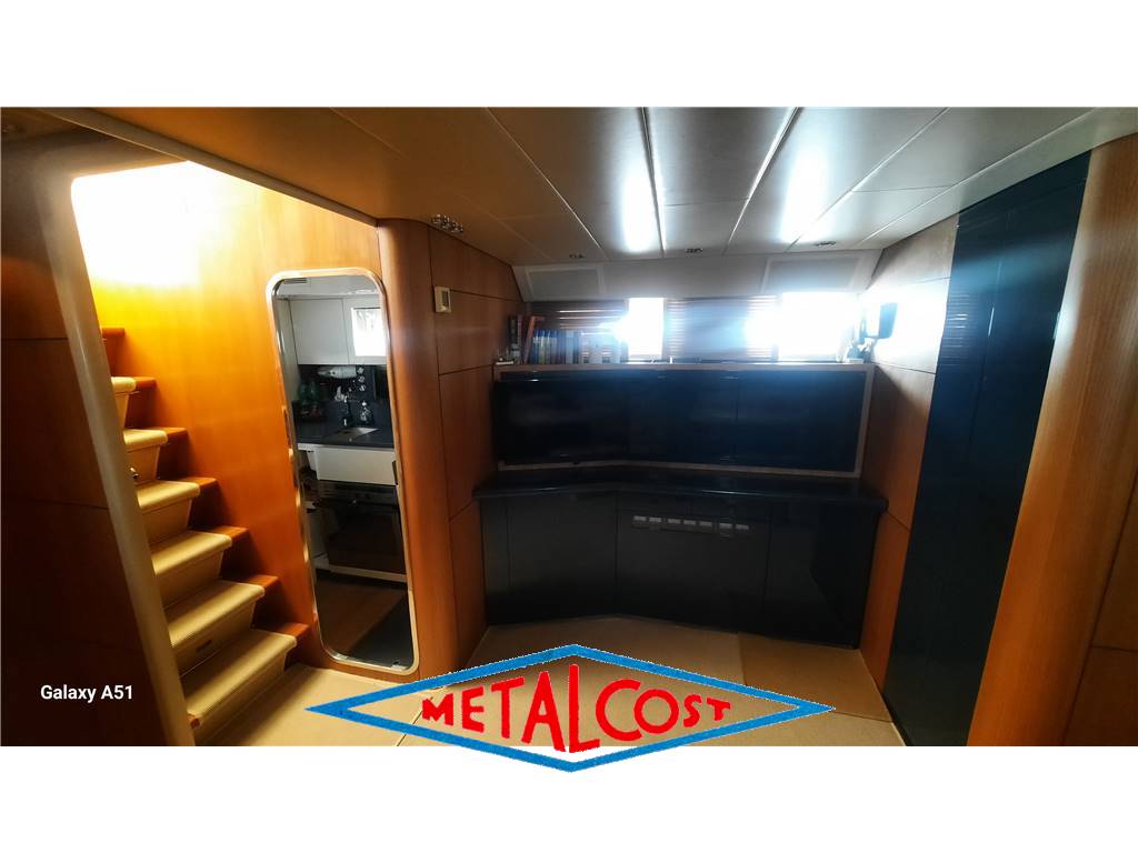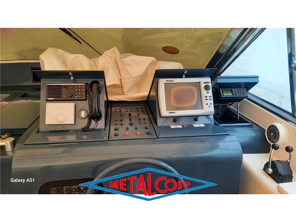 Notas internas1 Doppia in piano, 1 Matrimoniale italiana, 1 Cabina equipaggio, 3 Toilette. Notas de la instrumentaciónAngolo barra, Antenna radar, Bussola, Comando motori elettronico, Contamiglia, Ecoscandaglio, Fax, GPS, Interfono, Log, Pilota automatico, Plotter, Radar, Radio VHF.Notas de armamentoAllestimento tecnico e di coperta:Allarme fumo/gas, Allarme motore, Allarme sentina, Apertura Vano Motore Elettrica, Asse di rispetto, Autogonfiabile scaduto , Colorazione speciale (scafo colore crema), Doccia esterna (calda e fredda), Elica di prua - bow thruster, Faro orientabile, Flap elettrici, Flap idraulici, Garage per tender (con gruette besenzoni elettrica), Impianto antincendio, Indicatori Flaps, Lavaggio catena, Lavandino nel Pozzetto, Luci di cortesia, Luci subacquee, Passerella (idraulica), Piattaforma, Pompa di sentina automatica, Pompa di sentina elettrica, Pompa di sentina manuale, Pozzetto Teak, Presa 220V banchina, Raddrizzatore, Rollbar, Salpa Ancore Elettrico, Scaletta da bagno, Tavolo pozzetto, Winch tonneggio di poppa, Winch tonneggio di prua. Dotazioni domestiche di bordo: Aria condizionata (calda e fredda anche nel pozzetto), Cassaforte, Impianto acque nere, Prese interne 12v, Prese interne 220v, Serbatoio Acque Nere, 2 Telecamera (pozzetto e sala macchine), Telefono Interno, 3 WC marino elettrico. Dotazioni di sicurezza: Dotazioni di sicurezza oltre 50 miglia, E.P.I.R.B.. Intrattenimento: Altoparlanti, Impianto TV, Meccanismo saliscendi per TV (nel pozzetto), Radio AM/FM, Stereo, 3 TV (pozzetto dinette e cabina di prua). Cucina ed elettrodomestici: Congelatore, Cucina, Fornello, Forno, Frigorifero esterno, Frigorifero interno, Ghiacciaia, ICE Maker (in pozzetto), Lavastoviglie, Lavatrice, Microonde. Tappezzerie: Bimini, Cappottina, Copripozzetto, Cuscineria completa, Cuscineria di poppa, Cuscineria di prua, Cuscineria Pozzetto, Teli copri finestra, Telo copriconsolle, Tendalino. |