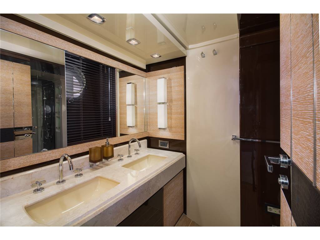 Notas internasNumero letti matrimoniali: 2 Numero letti doppi: 2 Numero cabine: 4 Numero di bagni: 3 Notas de la instrumentaciónMain Deck - Helm Station•MAN display: •Rev. counter •Hour counter steering wheel/ rudder •Engine pressure gauges •Marine gear pressure gauges •Ammeter •Marine gear thermometers •Engine thermometers •Alarm indicator •Fuel tank level indicator •Water tank level indicator •Grey water tank drainage •Multitask display: Alarm LEDs for: bow bilge, engine bilge, helm compartment bilge, grey water high level, black water high level, Racor filters, navigation lights, shore Sockets, low battery voltage, engine room fans, low fuel level. •Direct access to the side walkways •Rudder angle indicator •MAN indicators •Cigarette lighters •Autopilot •Levers •Manual depth light •Remote controlled light •Pilot seat (for 2 people: pilot and copilot) •Adjustable steering wheel in stainless steel and cherry wood •Peaks and handrails •Computer support on the left side •Chain meter counter •Magnetic compass •Joystick for encoder •Joystick for trim tabs •Joystick for wipers •24V + 220V electric panel •12V cigarette lighter socket •Controls for: Activation of: bow anchor winch, navigation lights, bow & stern thruster, windshield wiper and washer, trim tabs, fire fighting pump •Engine ignition (synchronism function) •Engine electronic remote controls (levers) Side window opening Notas de armamentoInside Equipment•Heating •Bow thruster •Air conditioning •Fresh water maker •Manual bilge pump •Washing machine •Oven •Sea water pump •Refrigerator •Deep freezer •Electric bilge pump •Battery charger •Hot water Optional Equipment •2 Seakeeper, active gyro stabilizer •Bow Thrusters •Factory installed Sofabed in Salon •Chairs for Lazarette •Aft Lights on Bridge Central Vac •Deluxe Curtain •Double Cable Master •Engine Controls in Chrome •(2) Ray Marine G Series Package •Hardtop •Head Tops in Marble •Joystick •Teak Cutting Board •Two Lamps •Underwater Lights •Wooden Floor in Galle •Helm Flybridge •Horn and navigation light controls •Bow thruster •Rudder angle indicator •Steering wheel control •Fire fighting pump controls •12v cigarette lighter socket •Electric searchlight control •Navigation lights •Electric searchlight •Access hatch opening: hinged opening with deck hatch made in aluminum and Plexiglas •Height adjustable aluminum steering wheel •Teak table •4 watertight speakers •Sunbathing cushions at bow •Stern seat •Glass-holders for pilot and passenger •Plexiglas windshield with stainless steel frame •Engine control instrumentation (MAN terminal): •Engine ignition •Rev. counter/hour counter •Engine pressure gauges •Marine gear pressure gauges •Ammeters •Engine thermometers •Marine gear thermometers •Alarm LEDs •The pilot dashboard includes: •Engine electronic remote controls – throttles •10 Carling buttons •Compass •Trim tab and indicators •New trim tab joystick •Engine and marine gear instrumentation Bow •2500W Lofrans anchor winch •Anchor winch controls •Anchor peak with drainage and fender compartment •Chain washdown •Fairleads •Anchor chain: 12mm diameter, 200mlength, 520 kg weight •Hawse hole (anchor passage at stern) •2 wipers on the fore windshield •2 stainless steel cleats (one on each bulkhead) •Anchor chain compartment •Deck hatch •2 fore handrail bars for sunbathing cushions •Side windows and windshield net covers •Sunbathing cushions and glass holders Stern •Access to the cockpit from the bathing platform by 2 GPR ladders and the gangway Cleats •Saloon access door with 2 stainless steel-crystal glass shutters •Cockpit bench •Engine room access •Wooden facings •Lighting: spots on the ceiling •Two electric warping winches •Wood-faced bathing platform with 750kg maximum capacity •2 stainless steel fairleads (one on each side) •Side peaks and compartments (under the cleats) •Lights on the bathing platform •Wooden cockpit table •Shore water intake •Shower with hot and cold water mixer •Manual bathing ladder |