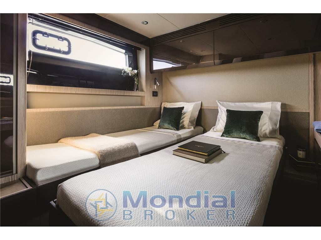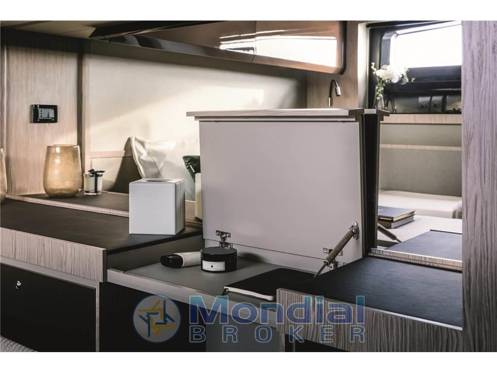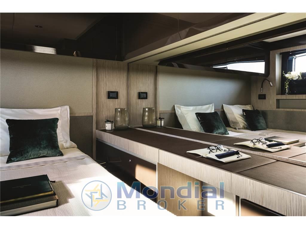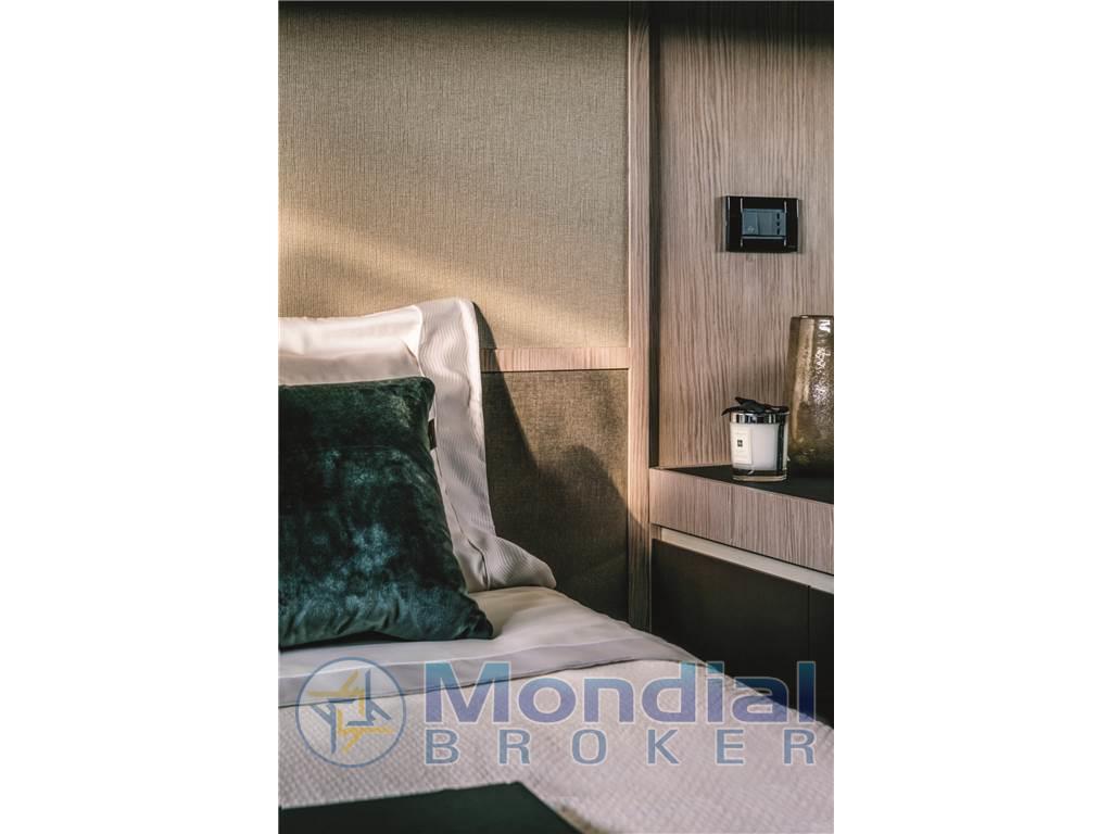Notas de armamentoAltoparlanti, Aria condizionata (60.000 BTU), Boiler (bivalente), Cassaforte (in cabina armatore), Clima reversibile, Congelatore, Cucina (Miele), Cuscineria di poppa, Cuscineria di prua, Forno (MIele), Frigorifero interno, Impianto acque nere, Lavasciuga, Lavastoviglie, Meccanismo saliscendi per TV, Microonde, Piastra in vetroceramica (Miele), Prese interne 12v, Prese interne 220v, Radio AM/FM, Serbatoio Acque Nere, Stereo, 2 WC marino elettrico (con Tecma bidet), Pacchetto Advance Azimut - Poltroncine pozzetto removibili - Bitte di ormeggio a poppa - Mobile pozzetto verniciato Urals Grey - Tappezzerie esterne in Batyline, grigio chiaro -