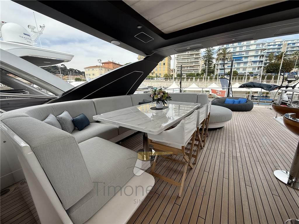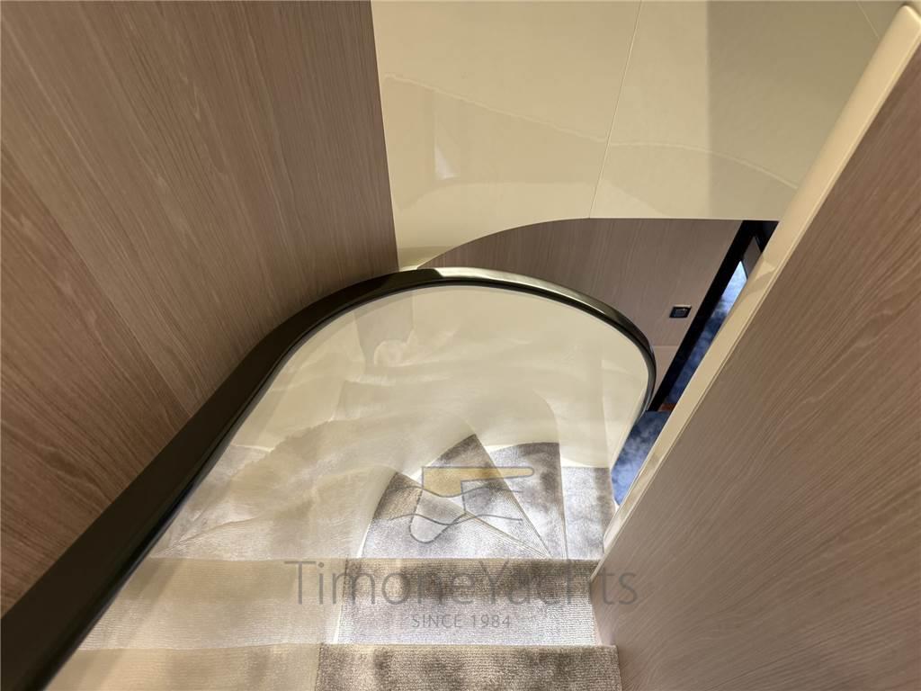 Notas de armamentoAllestimento tecnico e di coperta: Allarme fumo/gas, Allarme motore, Allarme sentina, Ancora, Camminamenti laterali in teak, Doccia esterna, Doppia timoneria, Elica di poppa - stern thruster, Elica di prua - bow thruster, Faro orientabile, Flap idraulici, Hard top, Indicatori Flaps, Lavaggio catena, Lavandino nel Pozzetto, Luci subacquee, Passerella, Piattaforma, Pompa di sentina automatica, Pompa di sentina elettrica, Pompa di sentina manuale, Ponte in teak, Porta ingresso, Pozzetto Teak, Presa 220V banchina, Presa acqua banchina, Stabilizzatori (Zero speed), Tavolo pozzetto, Tientibene con cancelletti, Tromba, Winch tonneggio di poppa, Winch tonneggio di prua.