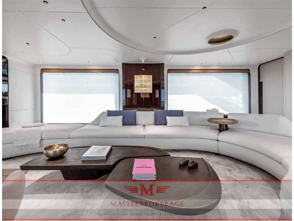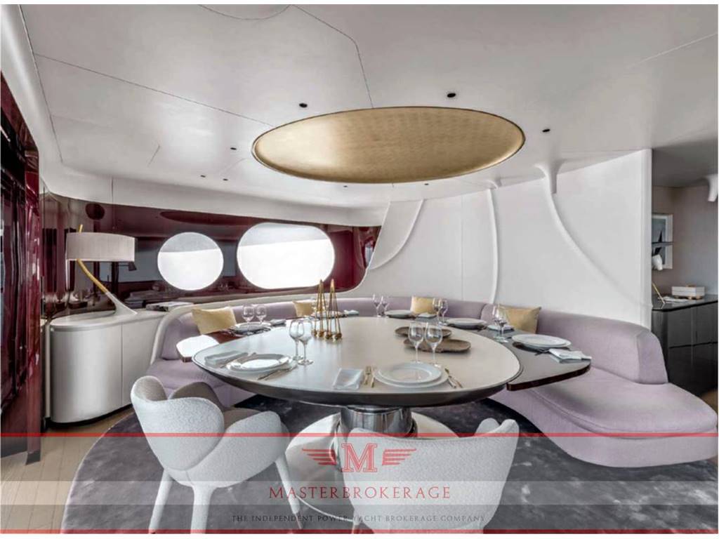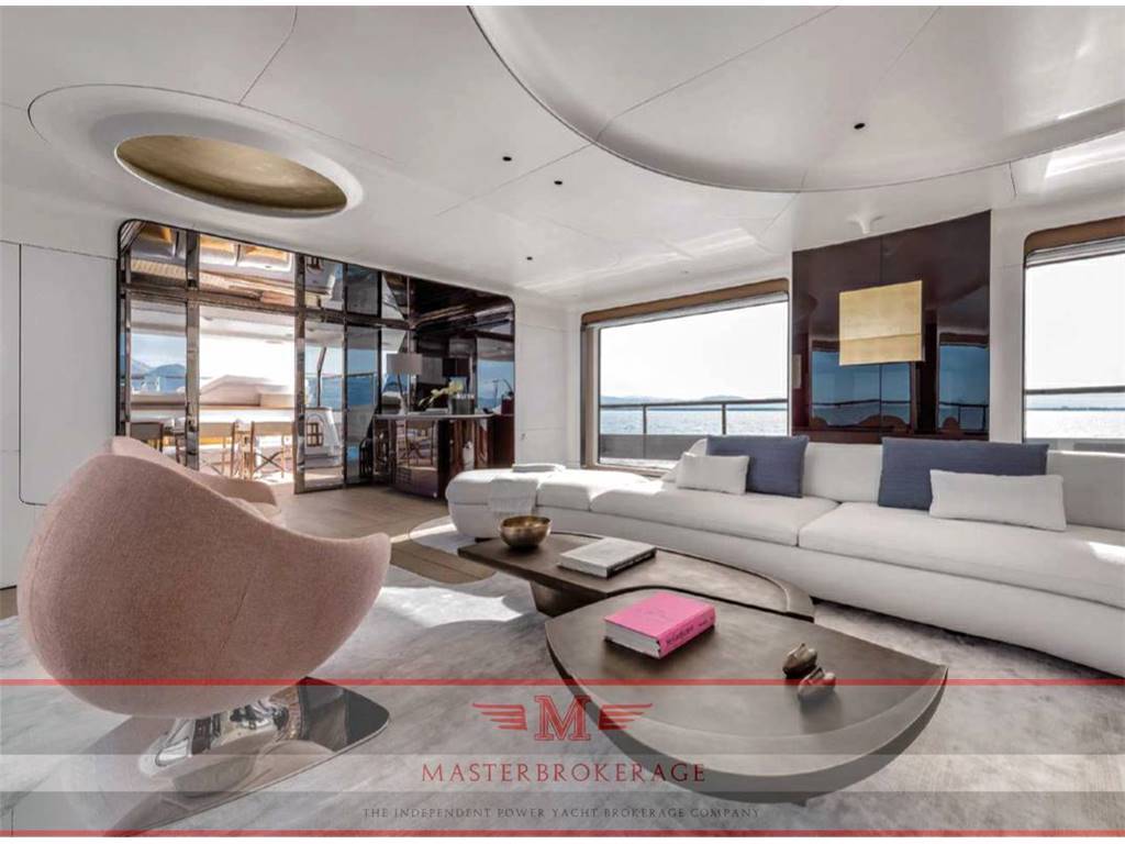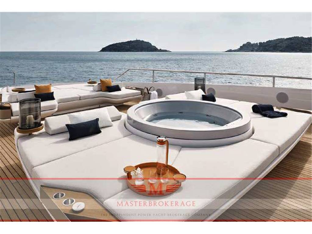 Notas internasThe novel ‘three decks + one’ ideal integrates a breathtaking half-raised aft deck, providing an ensemble of four cascading terraces for a uniquely and dynamic effect. The superior sundeck makes for a perfectly relaxing sunbathing area, while the upper deck below it boasts the main outdoor dining area. Last but not least, the beach area naturally connects the guests with the water and their natural surroundings. The main deck delivers another particularly surprising space: the refined and reserved private patio. An extension of the indoor living ambience as well as a protected outdoor zone, this creative and intimate environment encourages conviviality whith easy-going lunching, dining or lounging moments. All exterior and interior living areas are conceived as light-filled and airy settings. The upper deck presenting a full-width sky lounge is designed to unfold lifestyle freedom. This convertible area can quickly be transformed into a formal but cozy indoor dining area for up to 12 guests or be used for an exciting cinema soirée as it is also equipped with a 55” pop-up flatscreen. The sense of openness suggested by the seamless spaces continues also the sleeping quarters. The harmony rules the master suite. In a specially curated concoction, the atmosphere gently combines a warmly accommodating area embellished by a polished feel and suspended furnishings with an evolved concept of wellness. As a natural extension of the cabin, the bathroom evolves the idea of comfort and relaxation. The flexibility permeating the Grande Trideck concept, also allows for a 6-cabin layout which unexpectedly positions a VIP cabin on the upper deck. -------- . |
