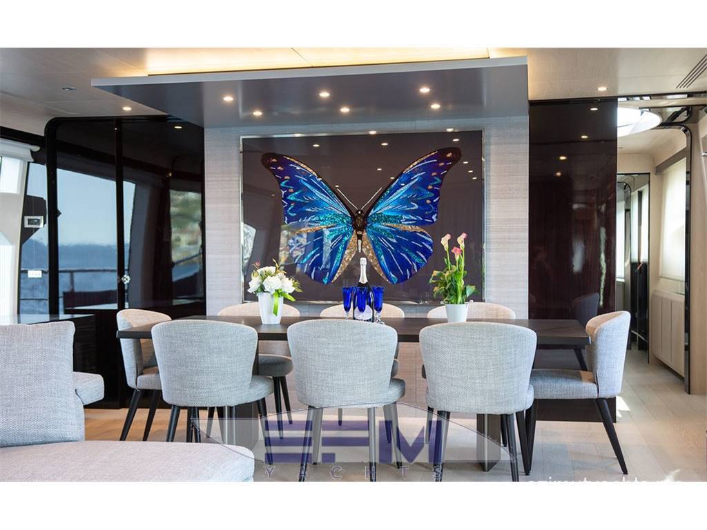 Notas internasBerths 10 + 4 crew Head compartments 6 + 2 crew Interior Designer Carlo Galeazzi Exterior styling & concept Stefano Righini Master Cabin ensuite 34 mq • Safe • Fridge Twin Vip cabins ensuite • Safe • Fridge Twin Guest cabins ensuite • Additional folding bed in both guest cabins • Curtains Blackout curtains in all cabins + master head • Blackout curtains to have tracks on both sides • Roll blinds in lieu of the Roman shades (electric in salon and master cabin) • Venetian blinds in all heads (master head excluded) Crew Cabins • 1 Captain cabin ensuite • 2 Crew cabins • 1 Head Notas de la instrumentaciónAudio/Video and Phone System• SAT TV antenna: KVH TV8 + dummy dome • SAT COM • Upgraded A/V Package - Gold version • TV predisposition in cockpit • TV predisposition on flybridge • Wiring passage for telephone system • Double SIM Peplink router Navigation • Upgraded navigation package - Gold version • Predisposition for Thermal camera (Raymarine T450) • 6' Raymarine open array radar antenna in lieu of the 4' antenna as per Gold package - modification and reinforcement of the mast included) • AIS Notas de armamentoGeneral• CE compliance standard • Stabilizers fins • Hydraulic stern thruster • Additional insulation between salon and engine room, between VIP cabins and engine room, and between master headroom and chain peak. • Oil change system for engines, gear boxes and generators • Central vacuum system • Zooming and pivoting cameta in engines room + 360° view videocamera in aft cockpit connected to Raymarine screens in wheelhouse and on flybridge • Additional pivoting camera in aft cockpit or flybridge • Controlling camera with Ipad • Additional set of videocameras: • - one fixed camera in salon, on aft, facing forward and looking up through the corridor and master cabin • - one fixed camera in the lower deck lobby • - possibility to connect the cameras with internet access • Dive compressor in the engines room, in the aft port corner, with air connection in the garage • Extra storage for scuba gear: • - bottle holder for four scuba diving bottles on port side of the garage, with connection to the dive compressor • - small storage under the cockpit seat (access from the garage ceiling) for small accessories • - other storage in the fwd area of the garage • Hand remote control for parking assist • Beach area outfit • Larger water heater Exteriors • 8 underwater lights, 4 on aft, 2 on each side, with white and blue light • Completed painted hull with red pinstripes in dark Navy Blue, included transom, bulwark and domes • Mosquito screen to portholes • Loungechairs and coffee table • 3 x Royal Botania Ninix 195T Loungers with white structure, teak insert and white batyline • Folding chairs in teak • 8 x Royal Botania Ninix 55T chairs, 4 with white structure, teak insert and white batyline and 4 with black structure, teak insert and black batyline • 2 x Royal Botania Ninix side tables • Black rubber of the side rubrail in lieu of std white • 2 x glass holders black in bow living area on fly • Bimini top • Royal Botania Ninix table with custom modifications in cockpit Flybridge • Teak-laid flooring • Additional radar arch • Pair of spotlights on aft flybridge • Crane and associated hardware for lifting skis to top deck • Separate bbq cabinet with Kenyon model B70400 • Icemaker on flybridge • L-shaped bar cabinet, equipped with sink, fridge and icemaker. • One additional fridge (65 l capacity) in storage area under the flybridge pilot seat • Royal Botania Ninix table with custom modifications Interiors • Wood (Riviera) • Mahogany dark wood - 100% gloss - very dark tonality • Oak light wood - matt • Floors: • Wooden flooring in dining area, galley, lobby and wheelhouse • - salon: carpet • - dining area: wood • - main deck corridor: wood • - wheelhouse: wood • - cabins and lower deck lobby: carpet • - day head: wood • - master head: marble • - VIP and guest heads: wood as per sample • - crew quarters: Forbo Allura stona natural concrete S62416 • Marbles: • Tops in Master head/day head/ VIP heads/ guest heads/galley • Steps to lower deck backlighted ONYX • Furniture: • 3 x Minotti sofas in salon • 2 x Minotti armchairs in salon • 8 x Minotti dining chairs • 1 x Minotti coffee table on portside in salon • 1 x Minotti coffee table on starboardside in salon • 1 x Minotti dining table • 1 x storage cabinet on portside in dining area • 1 x storage cabinet on the fwd bulkhead under the TV in master cabin Galley and pantry • Lacquered wood RAL 9010, 100% gloss • Wine cooler • Microwave oven • Modification of the pantry area with installation of one fridge, one freezer and storage • Ventilation of the fridge and freezer in the pantry in the wheelhouse • One big sink in lieu of std two separate sinks Wheelhouse • Captain's chair: Recaro North Sea |