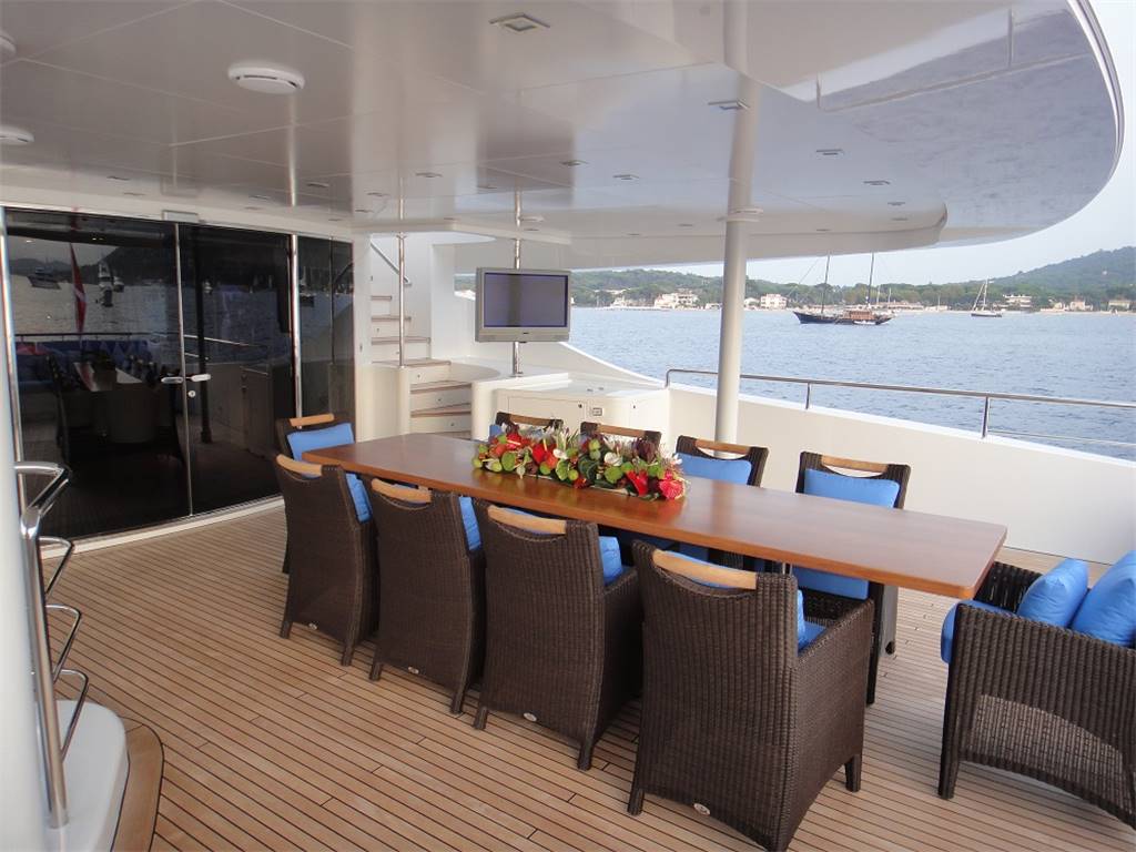 Main deck: Large aft deck with built in seating aft. Easy access to the bathing platform. Enter the opulent saloon from the aft deck. Forward of the saloon is the formal dining. The lobby is forward on the starboard side. Forward this lobby is the entrance to the owners suite comprising of an office and a large cabin and full bathroom, his and hers side as well as a jacuzzi bath and large walk in shower.