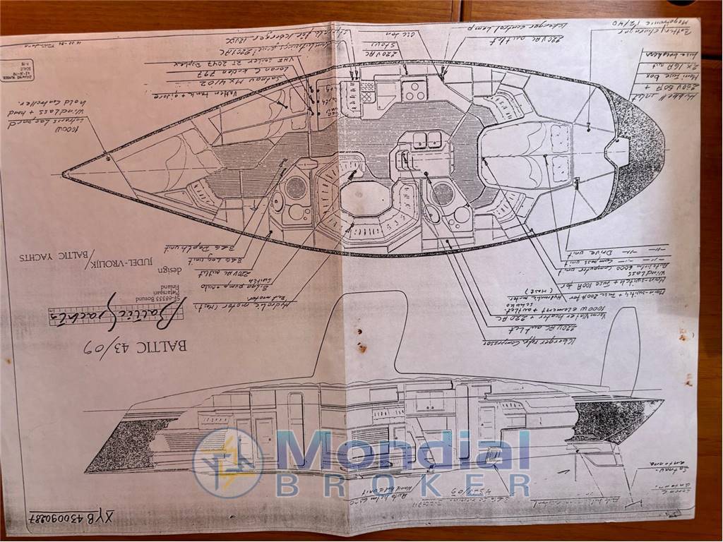 Notas internasI legni impiegati sono della migliore qualità possibile e trattati con eccezionale maestria artigianale. La compartimentazione interna è razionale e marina. Gli ambienti sono ben areati e sufficientemente luminosi considerando lo stile classico della imbarcazione. Ogni particolare e sfumatura di questa imbarcazione risultano lavorati con maestria e cura pur mantenendo la loro intrinseca funzionalità. ZONA LIVING L'ampia zona conversazione è composta da un ampio divano e tavolo in teak massello pieno con cassetti. Paiolo in rigato tradizionale di legno di teak con inserti in acero. Armadietti laterali e ripiano libreria completano lo spazio. ZONA CARTEGGIO Contrapposta al divano, nello spirito della classicità della barca, il carteggio è ampio e funzionale. Quadro elettrico su misura, libreria, ripetitori della strumentazione elettronica e comodo cassetto per riporre le carte nautica e attrezzatura di carteggio. ZONA GALLEY Questa zona a dispetto delle dimensioni resta comunque funzionale e ricca. Un frigo a pozzetto, un piano cottura basculante in acciaio Inox con tre fuochi e forno ed un lavabo con doppia vasca in acciaio inox e rubinetto con miscelatore caldo/freddo completano la zona. CABINA ARMATORIALE La cabina armatoriale a poppa è dotata di bagno indipendente con doccia ed è composta da un letto centrale molto spazioso , ripiani contenitivi e due armadi contrapposti. CABINE DI PRUA Lo spazio notte dell'imbarcazione si completa con due cabine di prua, di cui una con letti a discesa. Le due cabine sono servite da un bagno completo con doccia. Notas de la instrumentaciónelettronica B&Gstazione del vento B&G Hornet 4 eco, speed e log B&G Hecta autopilota Autohelm ST 7000 VHF sailor compact 2047 GPS Magellan Nav 1200 Plotter Navionics Geonav 11 flash bussola sunto custom Baltic Notas de armamentoAlbero Reckman con avvolgiranda integrato idraulicoRolla fiocco reckman idraulico Centralina idraulica Navtec per Vang e paterazzo |