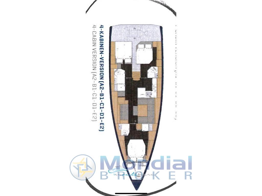 Notas internasNotas de la instrumentaciónBussola (magnetica), Pilota automatico (BGG), Radio VHF (BGG), Yacht controller.Notas de armamentoAllestimento tecnico e di coperta:Ancora (Delta 25 kg con catena10 mm, 50 ml, acciaio inox), Elica di prua - bow thruster (con tunnel incluse 2 batterie 95 Ah), Luci di cortesia (in dinette), Piattaforma (di poppa apribile elettricamente), Pompa di sentina elettrica, Pompa di sentina manuale, Pozzetto Teak, Presa 220V banchina, Salpa Ancore Elettrico (con campana tonneggio), 2 Tavolo pozzetto (abbattibili e trasformabili in prendisole elettrici), Winch. Dotazioni domestiche di bordo: BBQ/ Grill, Riscaldamento (5,5 Kw salone e cabine), Serbatoio Acque Nere, WC marino elettrico. Intrattenimento: DVD, TV (32' incluso lifting mochanism). Cucina ed elettrodomestici: Cucina (3 fuochi), Frigorifero interno (110 lt). Tappezzerie: Bimini, Cuscineria Pozzetto (con schienale e 6 cuscini), Oscuranti (per finestratura tuga e oblo' scafo), Prendisole aggiunto (tuga), Zanzariere (sui passiuomo coperta). Vele: Avvolgi Fiocco, Avvolgi Randa. mq135/147. |