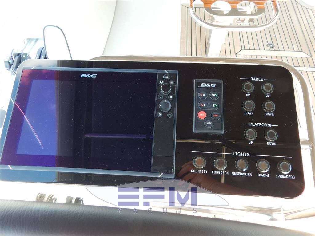 Notas internas3 cabins – 3 heads with showers Down the companion way stairs (which are angled at 45%, similar to a land-based home), the interior is fitted with flush mount cabinetry and quality joinery work. It is well lit by the three hull windows on either side, cabin side ports, and overhead hatches. To Port, is an efficient U-shaped galley, with a standard style refrigerator, 2 burner propane stove with oven, sink and ample storage is throughout, with a large set of inset shelves along the side of the port hull. Aft of the galley, is a large pantry. The first guest cabin is further aft, with an en-suite head with electric flush and shower. A large double berth in the center, with engine and generator access panels inboard. The starboard aft cabin mirrors the port. A double berth with ensuite electric head and separate stall shower, along with ample engine access. An opening hatch to the cockpit allows the breeze to flow through. Moving forward to the Salon, there is a large U- shaped dinette to Starbd, that can sit up to 6 people, with an L shaped settee opposing on Port. A compartment for a lifting TV is on the aft side of the dinette, Twin opposing hatches bring in outside air and a safety rail running along the ceiling allows for easy and safe movement underway. Forward to port is the Nav Station, with a 12" Zeus-3S B&G Chart plotter in the corner and the nav desk with opening table Forward is the Master Cabin, with a queen size island berth, twin hanging lockers allowing for storage space, and a separate shower room to port. To starboard is the separate head compartment, with an electric quiet flush toilet with the ability to use sea or fresh water. INTERIOR DESIGN Lorenzo Argento’s objective in designing the interior was to create a warm, modern atmosphere with as much natural light and ventilation as possible. The Oceanis Yacht 54’s layouts reflect a desire to meet the needs of modern-day owners, through well-engineered, versatile cabin arrangements that provide unrivaled levels of comfort and capacious storage space. Tables and seating areas have been reimagined to offer both conviviality and practicality, and access to all major systems and components hides in plain sight. • Alpi walnut woodwork and white lacquered wood (Partitions) • Alpikord oak floorings • Lounge Falcon Greige 160 fabric interior upholstery • Mattresses in the cabins (HR foam 35 kg/m³, thickness 120 mm/5’’) • Beige padded ceilings and Apli walnut in the central part of the saloon OWNER'S CABIN (en-suite) • Headroom: 2,01 - 1,96m / 6’7’’ – • Central double bed (2,00m x 1,60m / 6’9’’ x 5’3’’ -) with Lounge Greige 160 fabric padded bedstead • 1 Bed access sideboard • 1 Chair on each side of bed with Lounge Greige 160 fabric • Shoe stowage beneath the bed • 2 Hanger closets, with incorporated LED lighting • 1 Central full-height closet unit with LED lighting: 4 drawers at the bottom, 1 door with 4 shelves, mirror inside the door • 2 Night tables • 2 Flexible and adjustable bedside lamps • 1 T60 flush deck hatch with blind/mosquito net • 2 Portholes with rigid sliding blind • 1 115 V power socket on each side of the bed • 1 dual USB port outlet on each side of the bed • LED indirect lighting + Spot lighting PRIVATE HEAD compartments in the Master cabin • To starboard: Headroom: 1,92m / 6’4’’ • 1 Electric toilet • 1 80 L / 13 US Gal rigid holding tank • Work top in Corian Glacier White • 1 Integrated polyester basin - Mixer tap • 1 Cabinet - Mirror • Toilet accessories • 1 Deck hatch with mosquito screen/blind • LED indirect lighting + Spot lighting • To port: Headroom: 1,97m / 6’6’’ • Shower with seat and wooden shower base • 2 Open stowage trays • 1 Deck hatch with mosquito screen/blind • LED indirect lighting GUEST CABINS: PORT AFT CABIN Headroom: 1,92m / 6’4’’ • 1 Double bed (2,04m x 1,40m / 6’8’’ x 4’7’’) • 1 Hanging locker, 1 Cupboard with shelves, with incorporated LED lighting • 2 Lockers with top opening along the hull • 1 Bed access sideboard • 1 Drawer under the bed • 1 Large stowage under the bed, top opening (location for air conditioning option) • 1 Flexible, swiveling reading light at bedhead • 1 Flexible and adjustable reading light on the hanging locker • 1 dual USB port • 1 115 V socket • 1 Porthole with rigid sliding blind • 1 Opening window with below cockpit seat with pleated blind • 2 Opening windows on coaming with pleated blind (1 with the 3 heads version) STARBOARD AFT CABIN • Headroom: 1,92m / 6’4’’ • 1 Double bed (2,04m x 1,40m / 6’8’’ x 4’7’’) • 1 Hanging locker, 2 lockers with top opening along the hull • 1 Bed access sideboard • 1 Drawer under the bed • 1 Large stowage under the bed, top opening (location for air conditioning option) • 1 Flexible, swiveling reading light at bedhead • 1 Flexible and adjustable reading light on the hanging locker • 1 USB socket • 1 115 V socket • 1 Porthole with rigid sliding blind • 2 Opening windows with below cockpit seat with pleated blind • 1 Opening window on coaming with pleated blind AFT STARBOARD HEAD COMPARTMENTS TO STARBD- Headroom: 1,95m / 6’5’’ - Access from the saloon or the starboard aft cabin • Separate shower - 1 Mixer tap - White polyester shower base • Corian Glacier White work top with self-draining storage • 1 Electric toilet • 1 80 L / 21 US Gal rigid holding tank • 1 Washbasin - 1 Mixer tap • 1 Cabinet + Storage space under the basin • 2 Mirrors • Toilet accessories • 1 Opening porthole on coaming inside window, opaque film, mosquito screen To PORT- Second Aft Head compartment with Electric head and shower Notas de la instrumentaciónElectronics• CHART PLOTTERS (2)- 12" B&G Zeus3S wireless multi-function touchscreen on each helm With Navionics charts • WIND SPEED INDICATOR - B&G Windvane and Anemometer • 