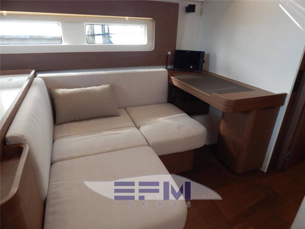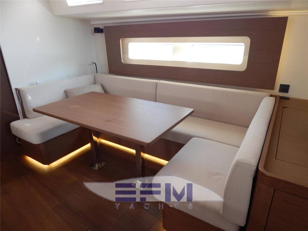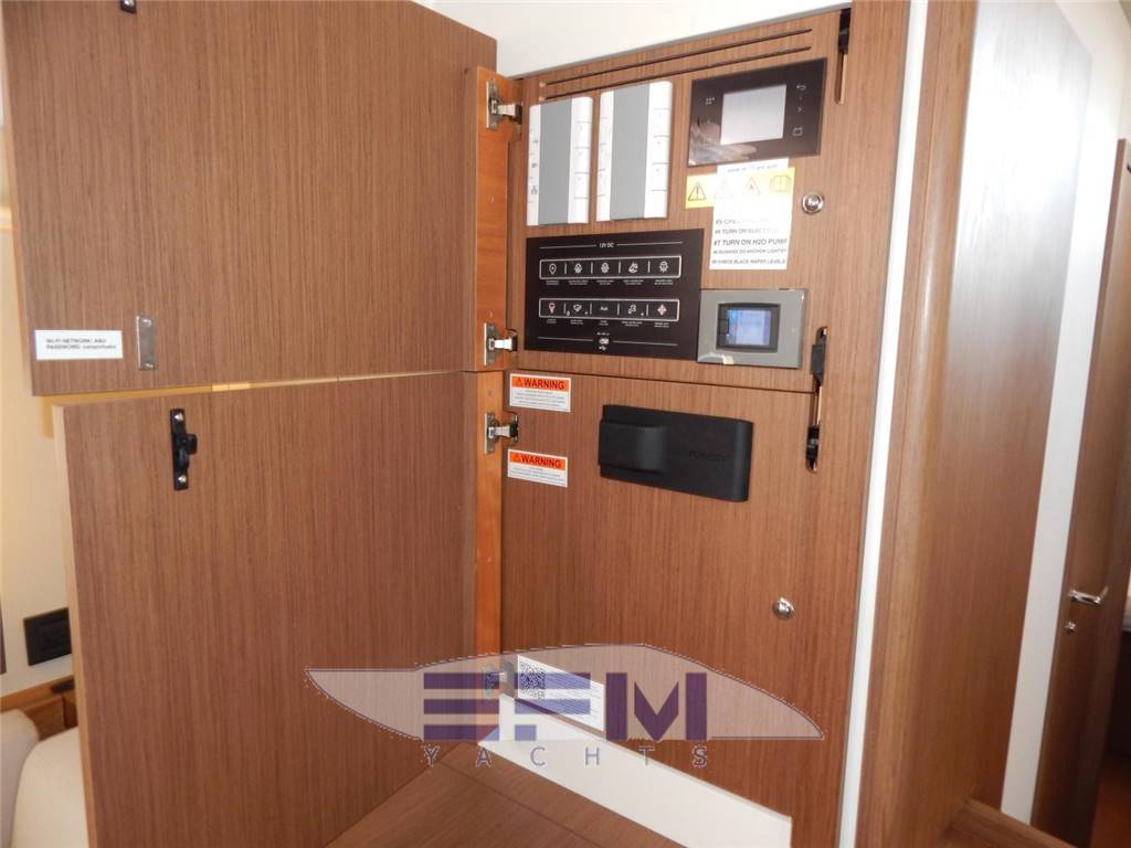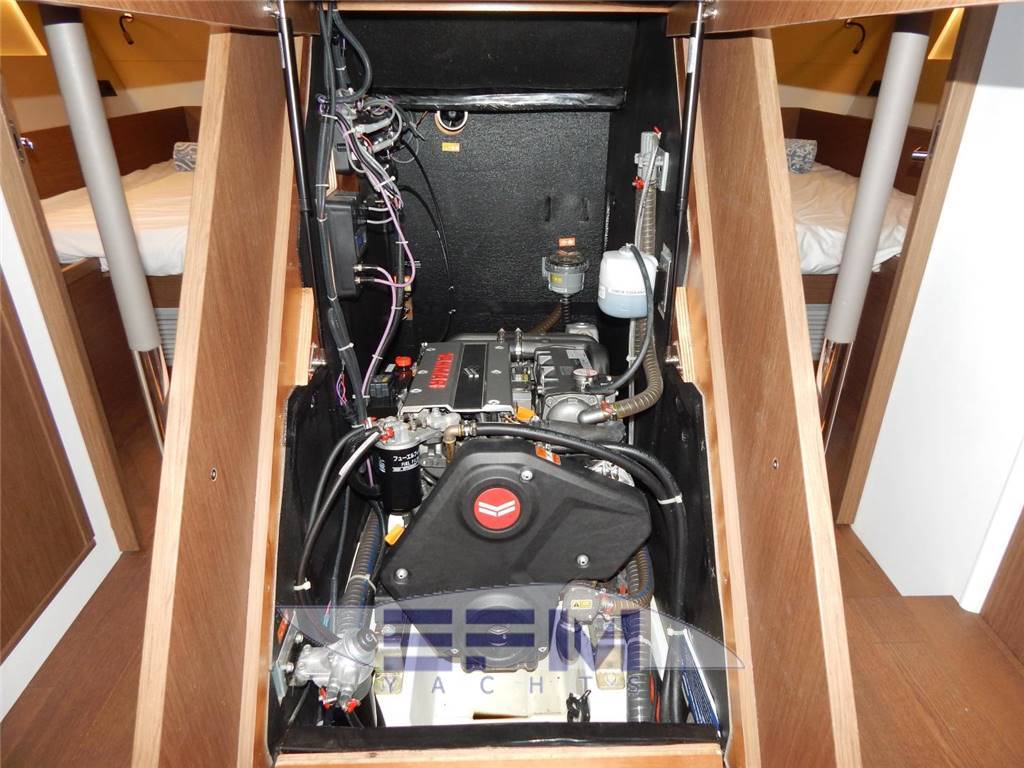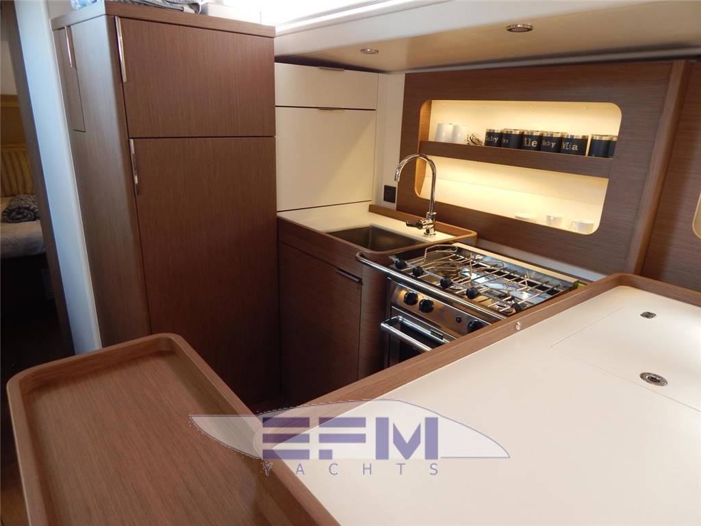 SALON A spacious salon is well laid out with separate sitting and reading areas, and Large U-shaped galley at the aft end. Dinette is to Starbd, Galley and L-Shaped settee and Nav table are to Port. Headroom: 2,00 - 1,97m / 6’7” • Long U-shaped bench seat: - seats made from HR40 foam - soft seating thanks to the memory material trim + padding • Saloon table, wooden top, 2 fixed aluminum legs • Storage under bench seats • 1 Electrical panel to starboard incorporated into a piece of furniture for access to electrical connections • 2 Portholes with integrated blind • 2 Coach roof windows with pleated blinds including opening porthole with mosquito net • 2 Opening deck hatches with mosquito screen/blinds • Indirect LED lighting below the bench seat and the upper part of the portholes • 1 Adjustable reading light • 1 115 V socket • Audio: - Fusion RA70N entertainment system - 2 Interior loudspeakers Port side chart table: • Table with storage- molded wood fiddle - Laminated covering • Long bench seat with back, chaise-longue function and seat with reclining part to match the list - Seat made from H35 foam + memory material + 2 trim padding • 2 Portholes with integrated blind • Storage under bench seats • 1 Storage space along the hull + 1 Valet tray • Indirect LED lighting on the upper part of the portholes • 1 Adjustable reading light • 1 230 V socket, close to forward bulkhead • Pillar with beige cover GALLEY The galley has extensive counter space with all the modern conveniences. Headroom: 2,01m / 6’7’’ • C-shaped galley • Corian Glacier White work surface with Apli walnut molded rails • 1 1 rectangular stainless-steel sink - 1 Mixer tap with hot/cold water under pressure • 1 Gas cooker 2 burners - Stainless steel grill and oven swivels (17L) - Stainless steel protection handrail - Stowage below the oven with drop-down door • 1 Freezer/refrigerator - Stowage on work top with top opening Space for optional 36 L stainless steel cool box, (included) • 12 V 174 L fridge with integrated 16 L freezer (-18 °C), 1 Front opening door • Fitted lockers and closed shelving • 1 Bin (20L) • 1 Base unit: 1 drawer on the side, 2 doors, 1 shelf • Coach roof window with pleated blinds, including 2 opening portholes with mosquito net Pre-wired for microwave oven PROPANE GAS • 1 Box for 2 gas bottles in the anchor locker (Diameter: 0,28m / 11’’ x Height: 0,45m / 1’6’’) • Regulator and safety tap • Gas leak detector Plumbing • 1 Rotomolded freshwater tank 380 L / 110 US Gal, under berth in forward cabin - 1 Deck filler • 2 Rotomolded freshwater tanks 2 x 150L / 2 x 40 US Gal, under saloon floor, port and starboard - 1 Deck filler • Pressurized electric water pump - Expansion tank - Inline filter • 40 L / 11 US Gal Electric water heater (engine use) • 1 Rigid black water holding tank for each WC • Electrical showers drain pumps • 1 Electric bilge pump • 1 Manual bilge pump • Transfer valves easily accessible from the companionway |