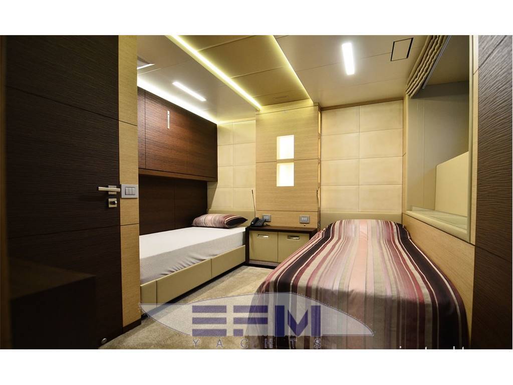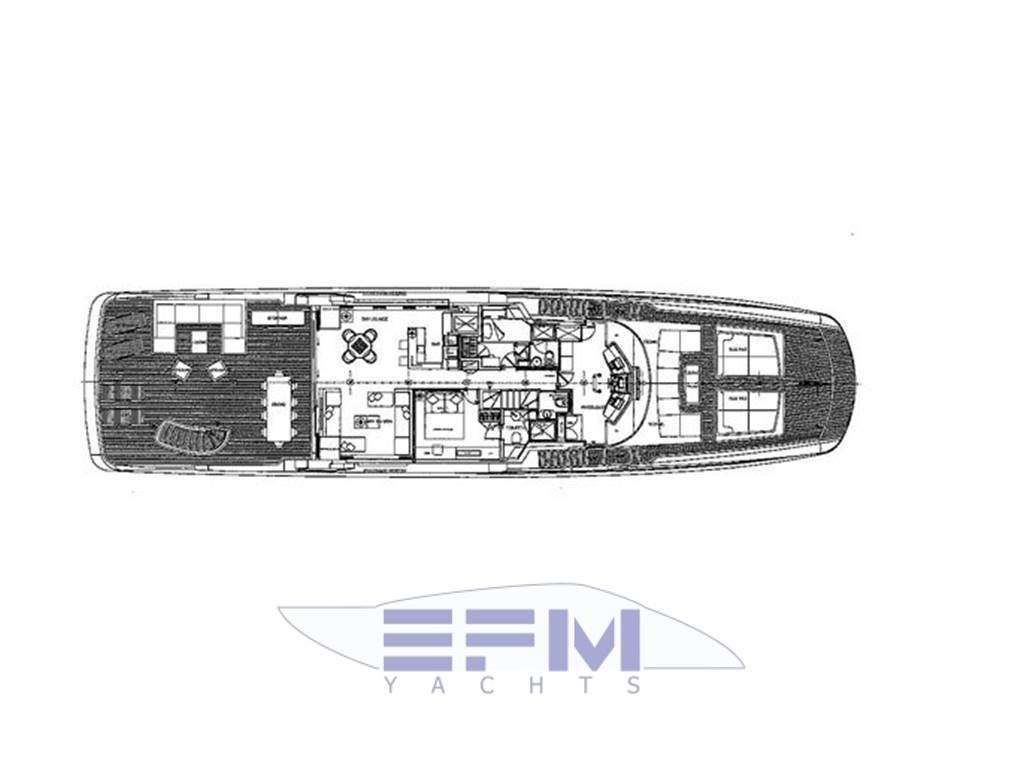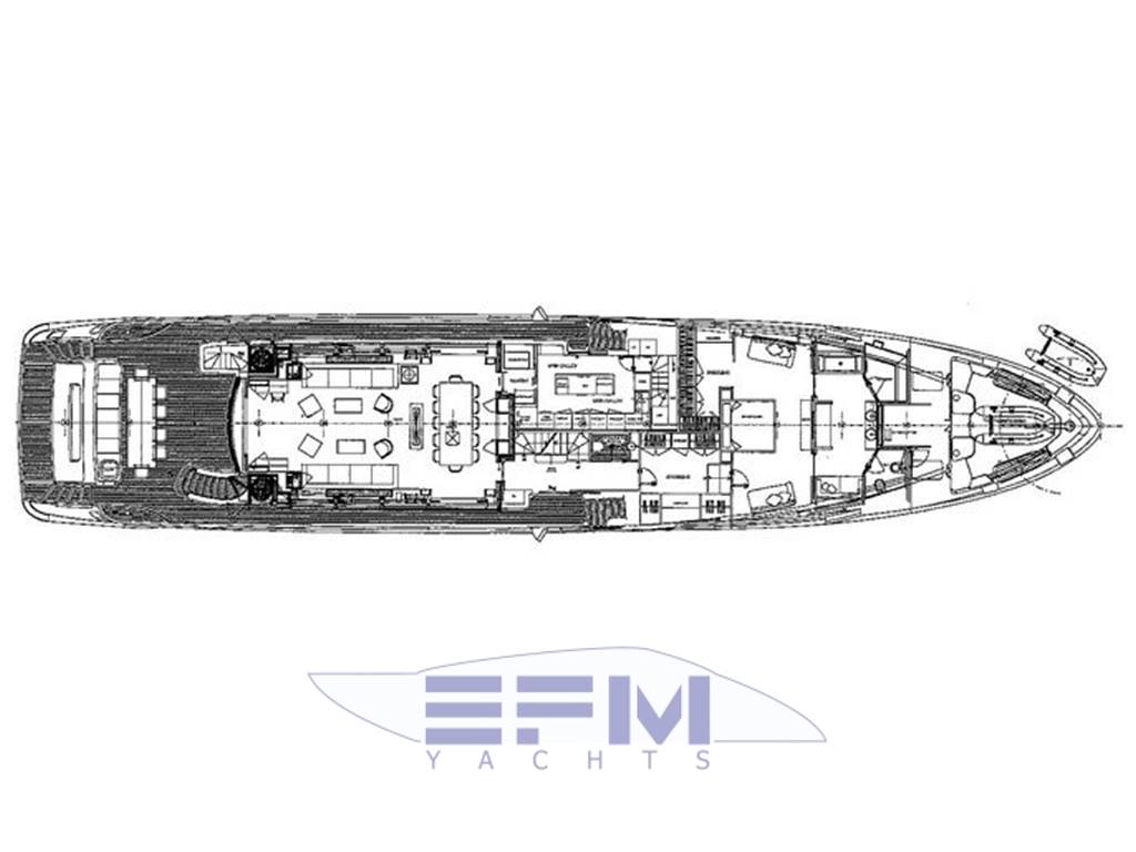 Notas internasBerths 10 + 7 crew Head compartments 5 + 2 crew Interior Zuretti Design Notas de la instrumentaciónMiscellaneous• Furuno RD-?? GPS repeater display in ESR • Cable routing from wheelhouse to ESR • Bridge navigation watch alarm system in 4 locations (bridge, captain, crew and engine room) • Upper deck office / cabin • Bi-directional network IR gateway, network kit, mounting kit and Apple iPod touch 8GB with remote control • Samsung 32" LED TV (U??205000) with hanging support • Denon 2312 receiver • Sat TV antenna Sea Tel 4004 • ??? Smart UPS Multiswitch Upgraded navigation package • 5 x LCD Monitors 19 “ IP 65 for wheel house (3 standard + 2 extra) • 3 x JT multifunction control stations with track ball and jog system (1 standard + 2 extra) 3 x 15” touch screen LCD panels to manage the following: • Wipers control • Whistle control • Search light control • Rudder’s pumps control • Engine Start / Stop • Boat speed • Depth • Wind speed • Wind direction • GPS • Radars • Air temperature • Air pressure • Displays switching • Displays brightness control • Monitoring and Automation system. • Alarms • Electric Power Station • Main Engines • Bilges levels and pumps • Doors and Hatches • Autopilot control • Steering control panel • Rudder pump • Steering mode and take over • Take over • Heading • Gyrocompass • Steering take over • Rudder position (RAI) • Roll & Pitch • Boat Speed Integrated conning system display, comprising of: 1 x processor unit and 1 x TI AD-NMEA01 BASIC Software for the visualising: • Heading • Rate of turn • Boat speed • Speed over ground • Depth • Water temperature • Wind speed • Wind direction • GPS • Air temperature • Air pressure • N° 1 RADAR/VIDEO PLOTTER FURUNO Mod. FR BB 2117 IMO APPROVED • N° 1 RADAR/VIDEO PLOTTER FURUNO Mod. MFDBB Navnet 3D –DRS12A Antenna ECHOSOUNDER-LOG SYSTEM • N° 1 BLACKBOX ECHOSOUNDER FURUNO DFF1 • N° 1 BLACKBOX ECHOSOUNDER SKIPPER GDS 101 IMO APPROVED (MCA UPGRADE) • N° 1 LOG BEN BB IMO APPROVED with LENS transducer (MCA) • RX GPS SYSTEM • N° 1 GPS LEICA MX 500 IMO APPROVED (MCA UPGRADE) • N° 1 NMEA interface WEATHER STATION • N° 1 AIRMAR PB150 WIND/LOG/DEPTH Multi-NMEA SYSTEM • N° 1 Blackbox GPS antenna integrated into wind sensor • N° 2 Repeater Displays for Captain’s and Crew Mess (1 STD+1 EXTRA) • N° 1 Navnet 3D (charts excluded) INTEGRATED STEERING SYSTEM - AUTOPILOT SYSTEM • N° 1 AUTOPILOT BB Navis AP 3000 for Gyro and Magnetic compass connection • N° 1 TAKE OVER SYSTEM for 3 control stations • N° 1 Backup Navis 3000 control panel MAGNETIC COMPASS • N°1 Magnetic compass C.Plath Jupiter over head mounting for Wheelhouse • N° 1 Hand Bearing Compass Plastimo Iris 100 (EXTRA) GYROCOMPASS SYSTEM • N°1 PLATH Gyrocompass Navigator X MK2 • N°1 KWANT LBM-4 IMO APPROVED COMMUNICATION SYSTEM • N°1 RADIOTELEPHONE VHF SAILOR Mod 6222 DSC • N°2 RADIOTELEPHONE VHF SAILOR Mod 6210 DSC FOR WH AND CAPTAIN’s • N°1 VHF 6210 REPEATER FOR CREW MESS • N. 1 RADIOTELEPHONE SSB SAILOR 5000 – 150 WATT WITH DSC MF • N 2 SSB Antennas • N°2 GSM TELULAR SX 7 UNIT • N°1 Satcom C Sailor TT3000 • N° 4 VHF Sailor SP3510 • N° 2 VHF Sailor SP3520 GMDSS (MCA) • N° 1 AIS FURUNO FA150 IMO APPROVED • N° 1 NAVTEX NX700 IMO APPROVED • N° 1 SAILOR 406 EPIRB • N° 1 SART S4 MCMURDO • N° 1 FLEET BROADBAND 250 (EXTRA) • N° 1 SEATEL 4010 VSAT (EXTRA) NAVIGATION CAMERA • N° 1 Night Vision Camera FLIR M Series 324L Notas de armamentoDOMESTIC APPLIANCES, EQUIPMENT AND LAUNDRYDomestic equipment is supplied in accordance with the domestic equipment plan and the Benetti Excellence range. Main deck Galley / Pantry 1 cooking top 90 cm 1 exhaust hood 1 oven 90 cm 1 microwave 1 dishwasher 1 garbage macerator for the sink 2 freezer / fridge built 1 trash compactor 1 wine cellar undertop type Main deck bar 1 ice maker 1 minifridge Owner’s study 1 minifridge Sky Lounge bar 1 ice maker 1 minifridge Sun deck area 1 barbecue 1 ice maker 1 minifridge 2 washer machine 2 dryer machine DECK EQUIPMENT Anchors & chain: 2x 225kg galvanized steel HHP, 16mm Windlass: 2x 380V/3 phases vertical type Stern capstans: 2x electric foot operated Tender Williams - 5,03m Toys: 1 Jet ski |