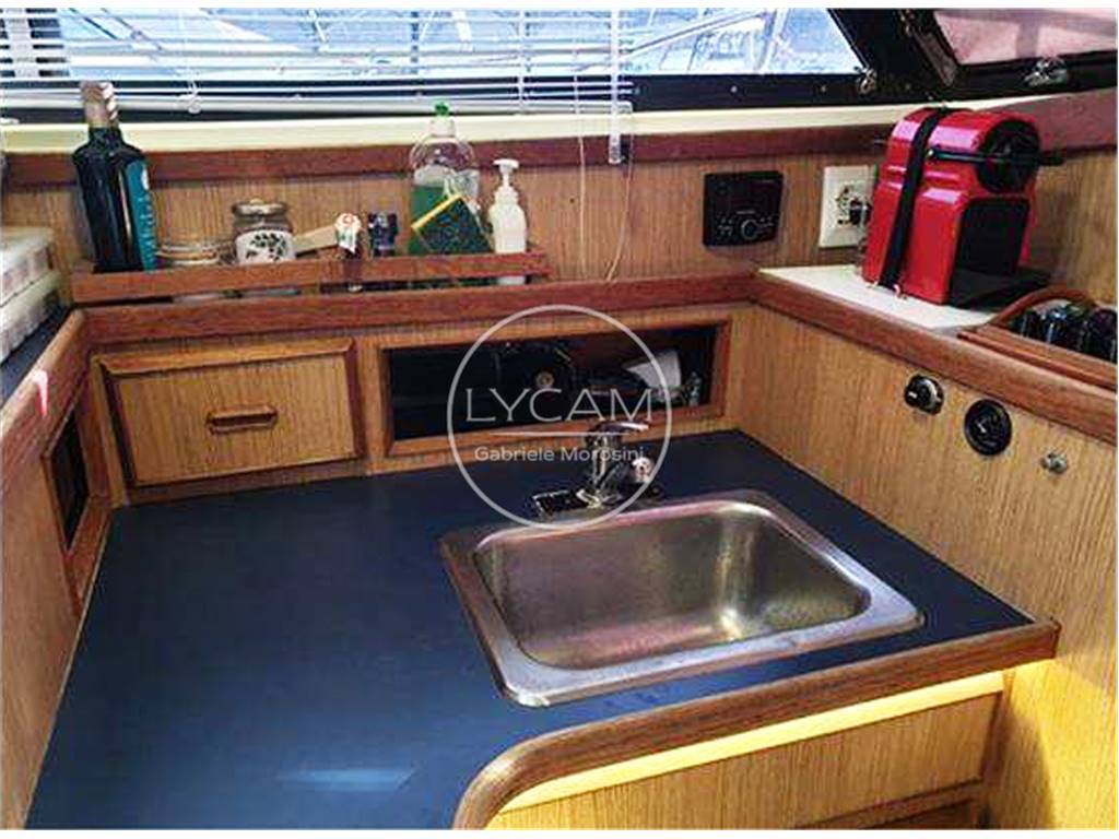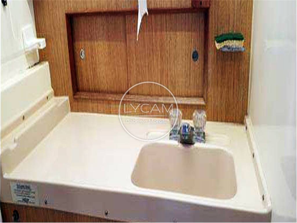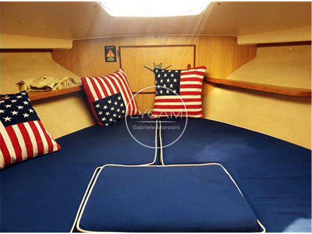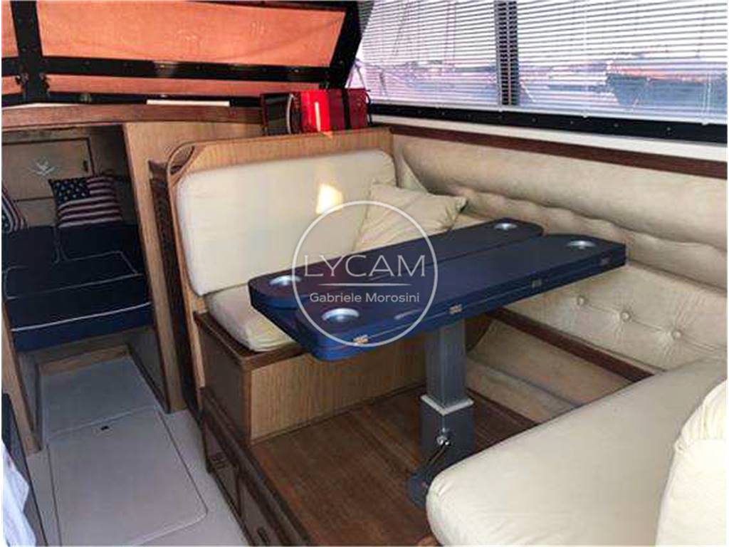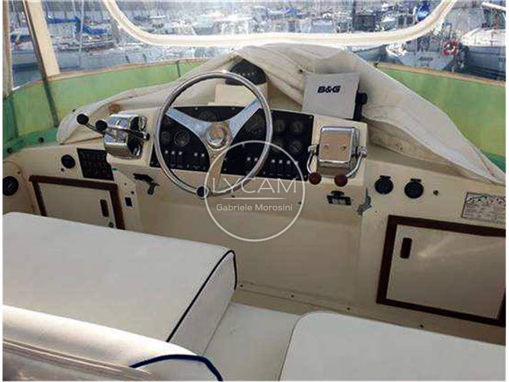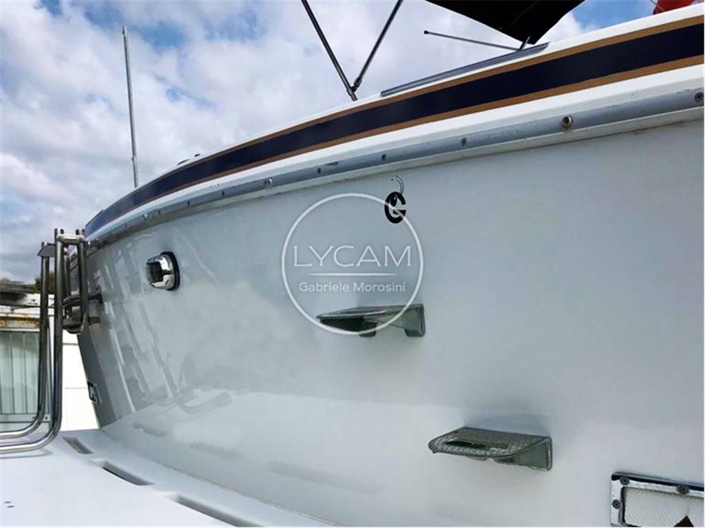 Notas internasUna scaletta conduce al fly contenuto ed attrezzato con timoneria e sedute per pilota e copilota. Dal pozzetto si accede internamente alla zona living caratterizzata da una dinette sulla dritta mentre sul lato opposto si trovano un locale toilette e, a seguire, un mobile cucina. Proseguendo verso prua vi è la timoneria interna e, scendendo alcuni gradini, si raggiunge la cabina prodiera Notas de la instrumentaciónBussola; Radio/Stereo; Strumentazione motori; Leve del gasNotas de armamentoLuci di navigazione; Luce di fonda; Ancora; Bitte; Salpa ancora elettrico (2020); Plancetta; Scaletta bagno; Doccia esterna; Autoclave; Tromba; Flap idraulici; Presa 220V; Batterie; Caricabatterie; Passerella; Pompe sentina automatiche; WC marino elettrico (2020); Boiler; Riscaldamento (Webasto 2020); Tendalino poppa; Teli copri finestre (2020); Telo copri consolle |