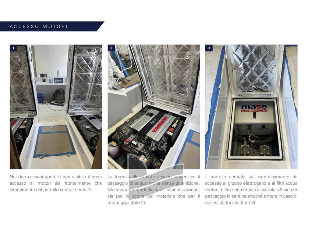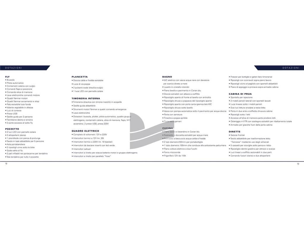 Notas internasNotas de la instrumentaciónBussola, Contamiglia, Ecoscandaglio, Radio VHF.Notas de armamentoAllestimento tecnico e di coperta:Allarme motore, Autogonfiabile, Doccia esterna, Doppia timoneria, Flap idraulici, Pompa di sentina automatica, Pompa di sentina manuale, Raddrizzatore, Salpa Ancore Elettrico, Scaletta da bagno. Dotazioni di sicurezza: Giubbetti di salvataggio. Intrattenimento: Stereo. Cucina ed elettrodomestici: Frigorifero interno. |