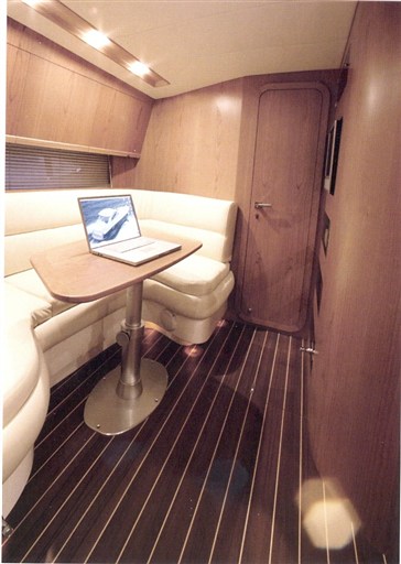 Notas internasInterior: gran comedor con pisos de teca y muebles de cocina paredes Cherry con rango-dx 4 incendios, fregadero, nevera y micro-cabina con acceso a baño completo con ducha y wc, cabinas de eléctrica y dos invitados popa con camas separadas, pero puede ser transformado en techo duro doble: cabina teca piso-sede con un gran sofá para 2 personas-cocina vitrocerámica quemador dos con fregadero y frigorÃfico dinetto con un gran sofá en c y la tabla de arriba y abajo