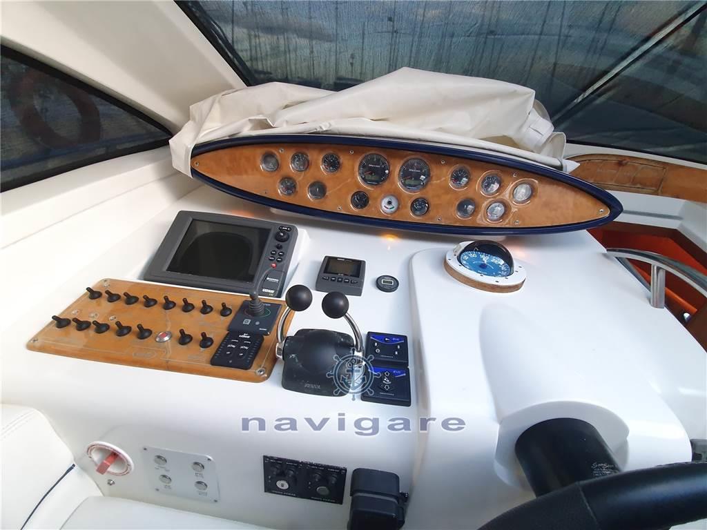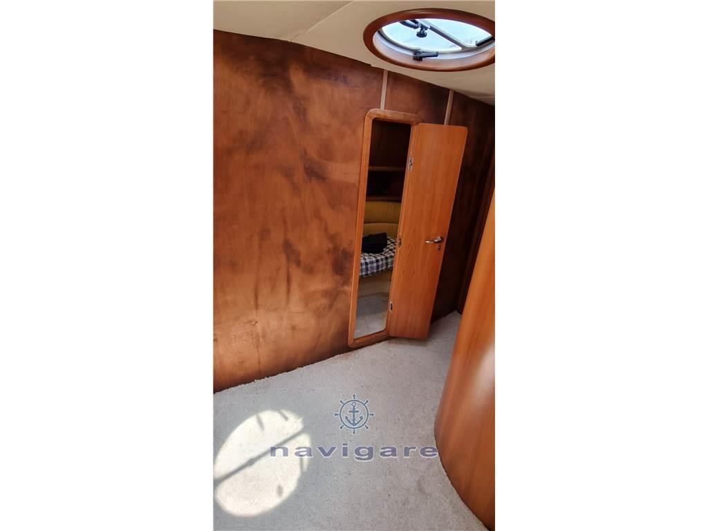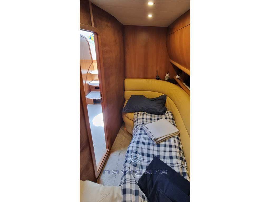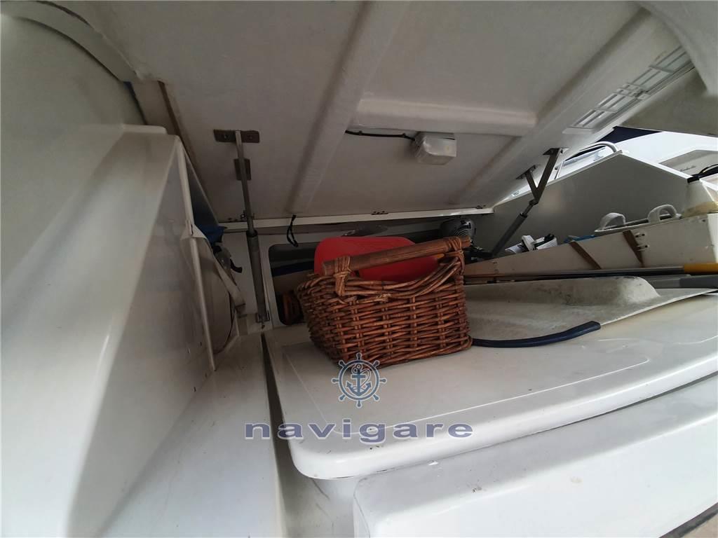 Notas de armamentoAria condizionata (calda e fredda), BBQ/ Grill (esterno), Boiler (50 LT), Cappottina, Copripozzetto, Cucina, Cuscineria di poppa, Cuscineria di prua, Cuscineria Pozzetto, Frigorifero esterno, Frigorifero interno, Giubbetti di salvataggio, Impianto acque nere, Impianto TV, Microonde, Oscuranti (2022), Piastra elettrica, Prese interne 12v, Prese interne 220v, Radio AM/FM, Serbatoio Acque Nere, Stereo, Teli copri finestra, Telo copriconsolle, Tendalino, 3 TV, 2 WC marino elettrico, Zattera di salvataggio, Sotto coperta sono stati installati degli oblò di grandi dimensioni che, oltre a rendere accattivante il profilo esterno dell’imbarcazione, danno notevole luminosità alla dinette e alla cucina. Gli interni sono nella versione a due cabine. Il bagno, la cucina e la dinette dell’armatore sono di dimensioni più generose con un’altezza in cabina di oltre 2 metri. I mobili interni, di nuovo design, conferiscono all’imbarcazione un’impostazione più moderna, sempre con la massima attenzione al razionale utilizzo degli spazi e al confort di bordo.