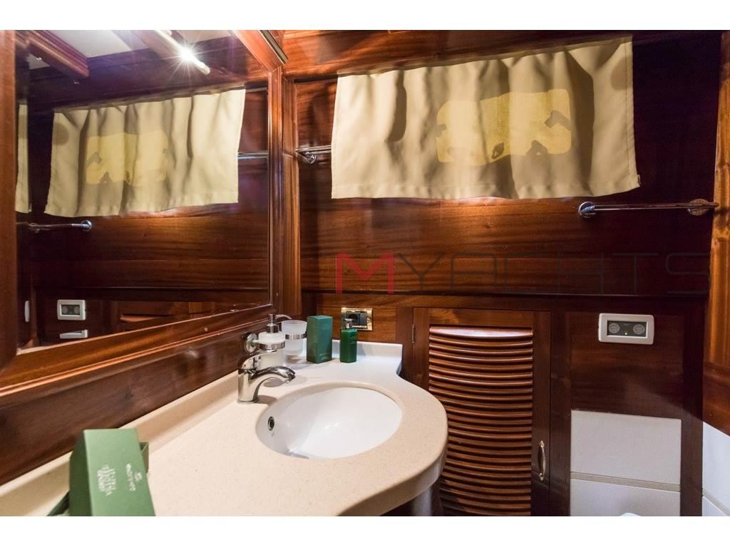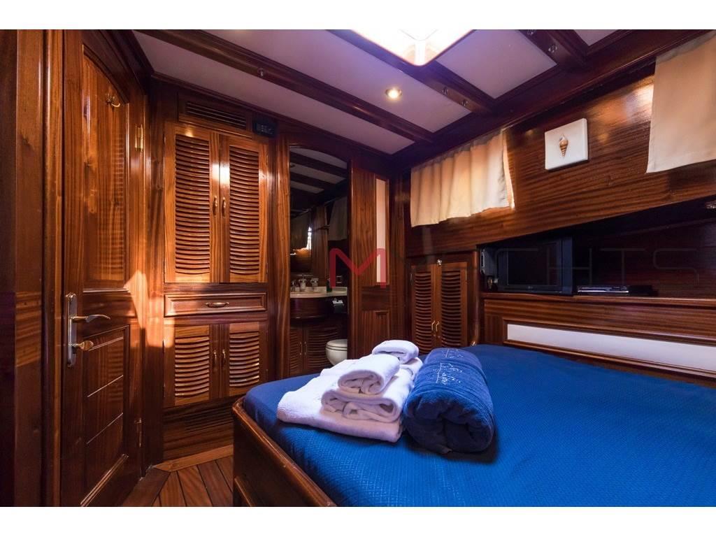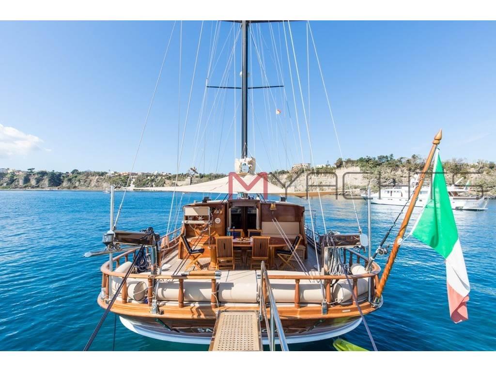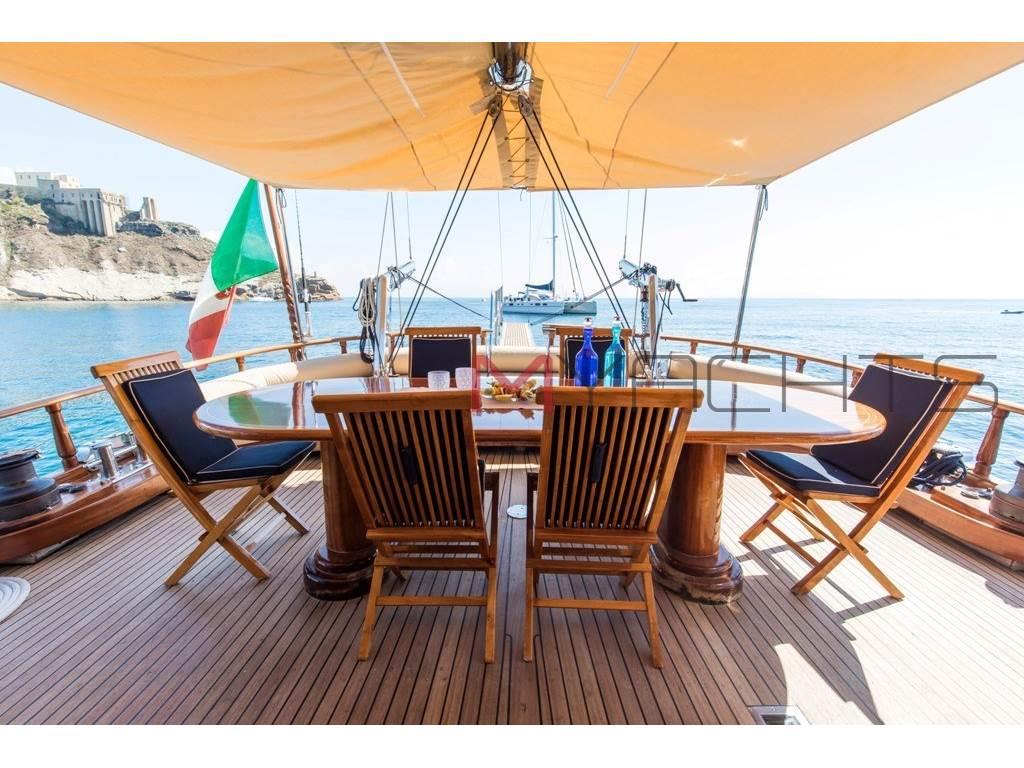 Caicco di lusso disponibile per il noleggio in Costiera e Toscana. 3 persone di equipaggio, 4 cabine ospiti e ampi spazi esterni prendisole . |