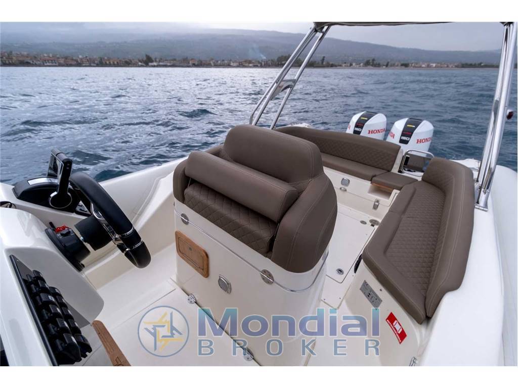 Dotazioni optional: Timoneria idraulica Seastar (monomotore, monocilindro bimotore, bicilindro bimotore), roll bar inox con tela nera microperforata o taupe piena, luci LED, roll bar in VTR con tela nera microperforata, luci LED, estensione tendalino roll bar in tela nera microperforata o taupe piena, serie luci inox roll bar e tromba, serie luci console, prolunga prua, prolunga poppa, ricarica banchina, asta ski, sospendite, rivestimento sintetico completo (EVA), teak completo, teak poppa, teak delfiniera prua, telo copriconsole con seduta guida, telo copri spalliera poppa, telo trasporto, stereo Fusion Silver, ecoscandaglio Axiom 9” R.V. wifi touch fishfinder 600W + Card. PACKAGE MOTORE - SUZUKI DF 300 AP (electronic - 300 hp): € 91.000,00 + iva - SUZUKI 2 X DF 200 AP (electronic - 2x200hp): € 104.000,00 + iva |