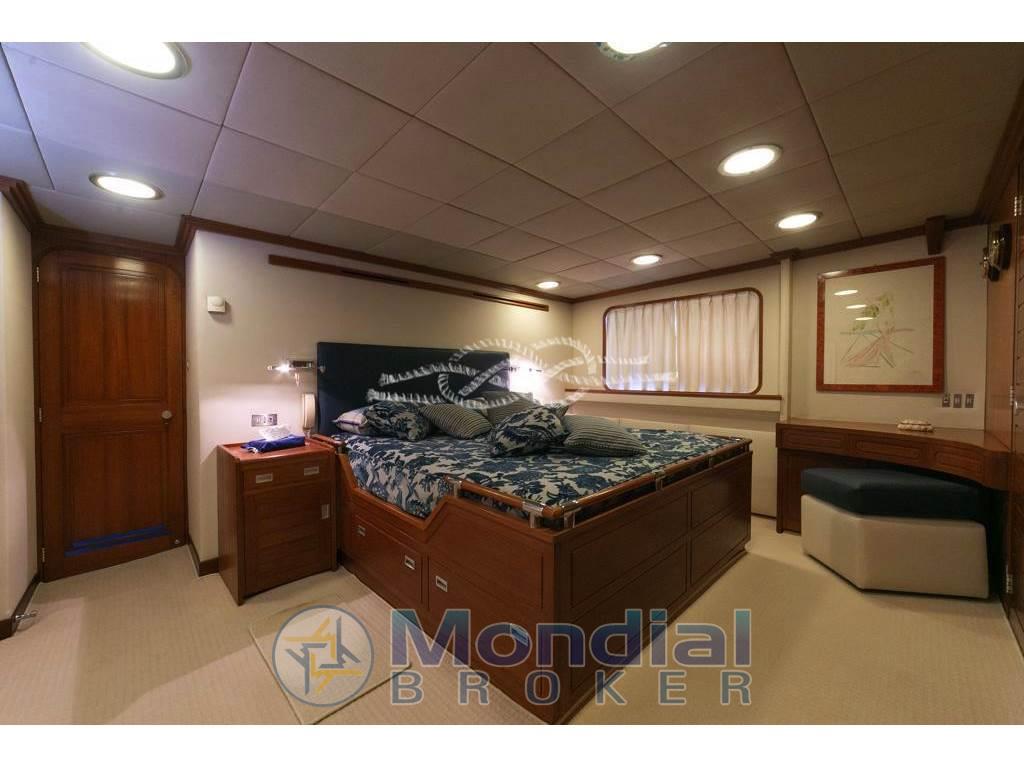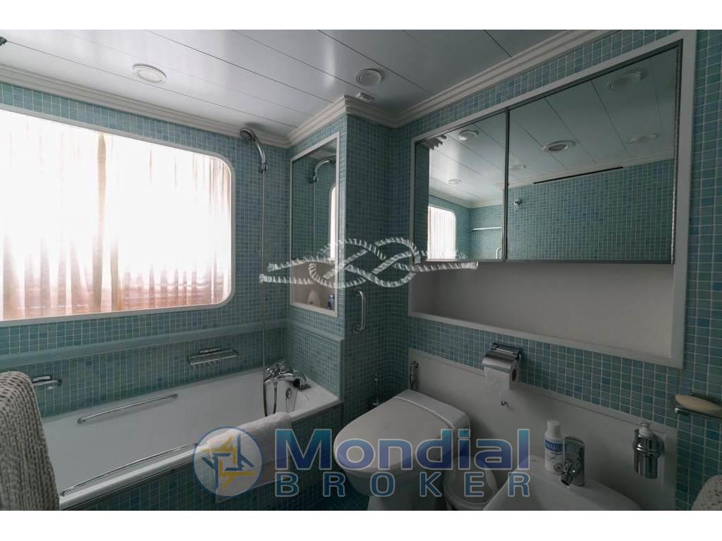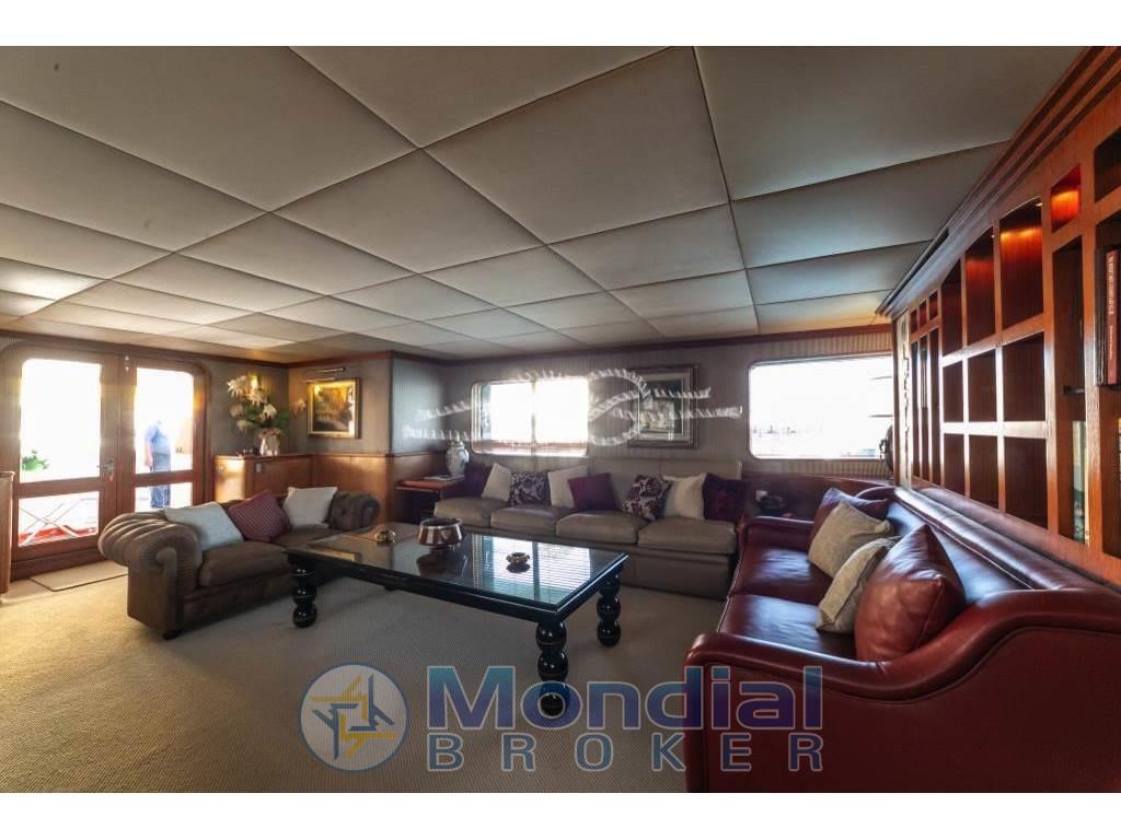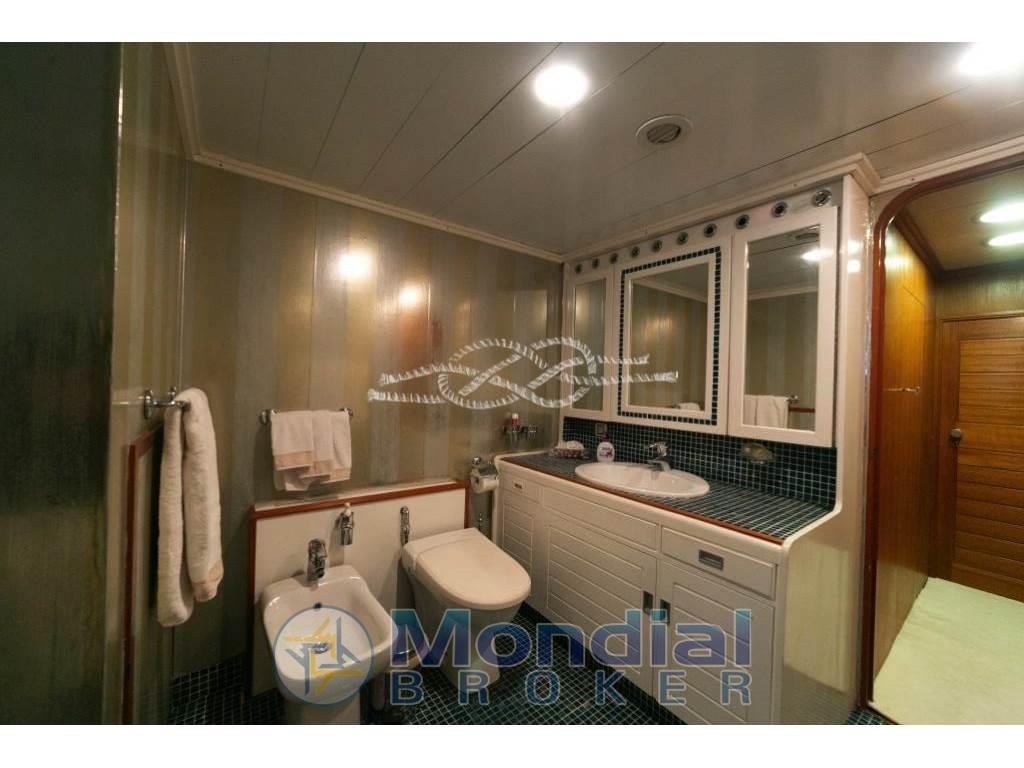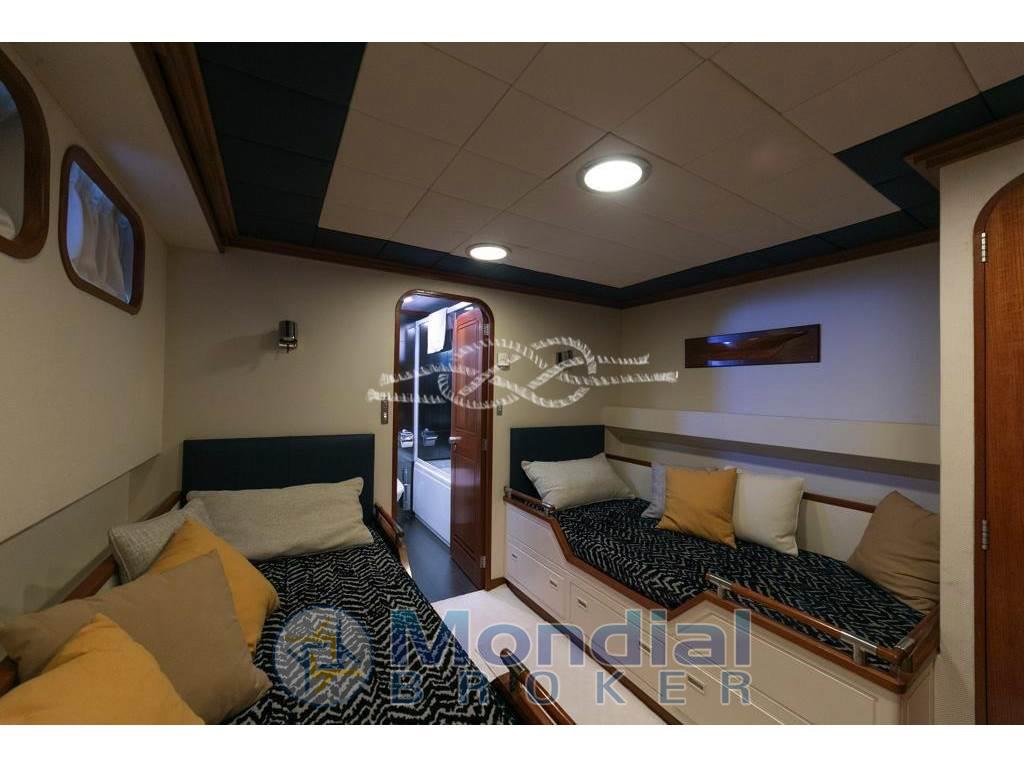 Notas internasCabina comandante con servizi adiacente alla timoneria - quattro cabine doppie equipaggio con servizi. Notas de la instrumentaciónRadiobussola Robertson RGC11 - pilota automatico Robertson - radar Furuno 24 miglia - GPS/Plotter Furuno NavNet - VHF Shipmate - VHF Raymarine - SSB Skanti.Notas de armamentoAria condizionata centralizzata - dissalatore Tecnomarine 500 L/h - separatore gasolio Alfa Laval 900 L/h - elica di prua idraulica 60 kW - piano cottura induzione - forno - frigo freezer in acciaio - due lavatrici Miele - due asciugatrici Miele - antenna TV SAT - impianto stereo Technics - tender Novamarine 5,30 m con entrobordo Volvo Penta 130 Hp - tender Novamarine 4,60 m con fuoribordo Yamaha 60 Hp - Epirb - sistema trattamento acque nere Hamman - sistema purificatore gasolio Alfa Laval - dati SAT e Wi-Fi - due generatori Caterpillar da 150 kW (3569 - 3462 ore). |