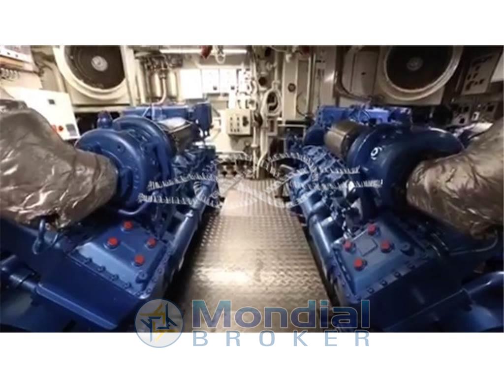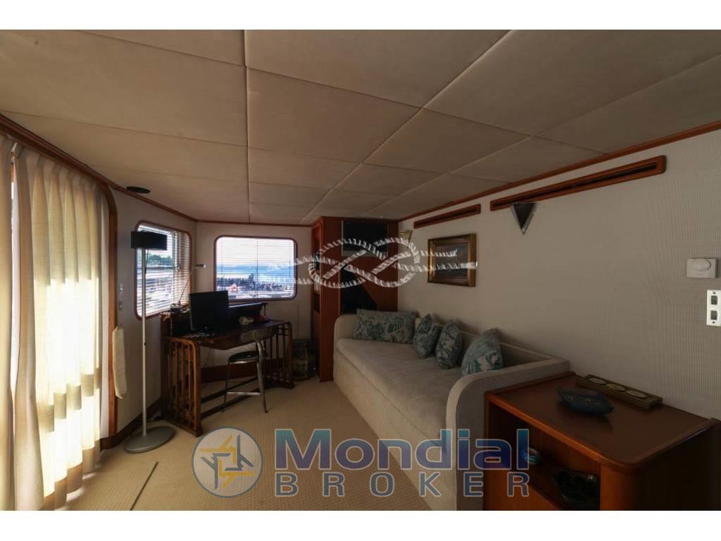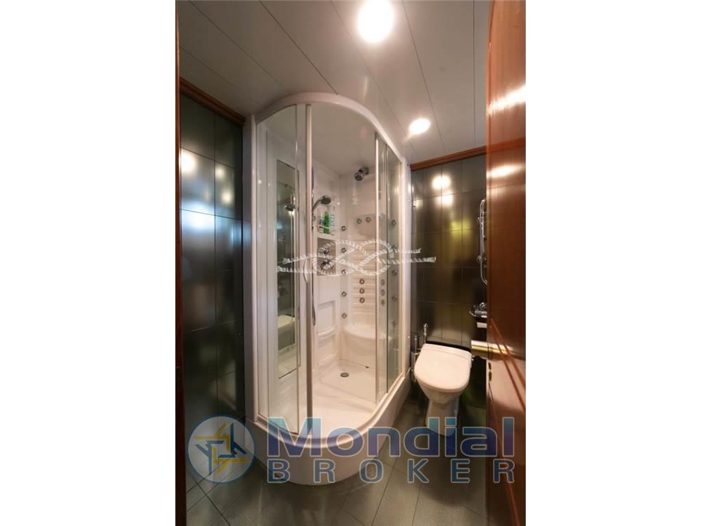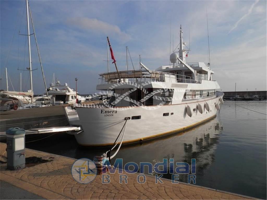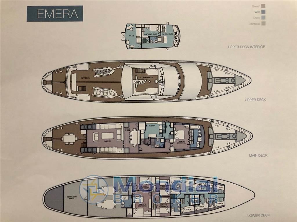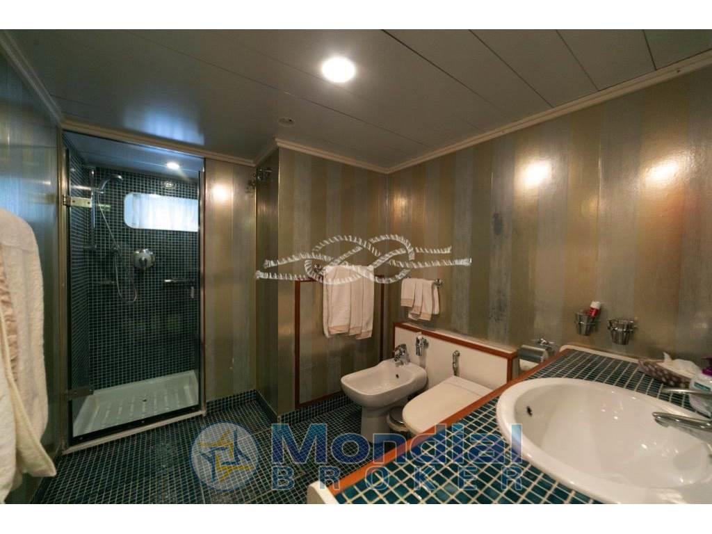Notas internasCabina comandante con servizi adiacente alla timoneria - quattro cabine doppie equipaggio con servizi. Notas de la instrumentaciónRadiobussola Robertson RGC11 - pilota automatico Robertson - radar Furuno 24 miglia - GPS/Plotter Furuno NavNet - VHF Shipmate - VHF Raymarine - SSB Skanti.Notas de armamentoAria condizionata centralizzata - dissalatore Tecnomarine 500 L/h - separatore gasolio Alfa Laval 900 L/h - elica di prua idraulica 60 kW - piano cottura induzione - forno - frigo freezer in acciaio - due lavatrici Miele - due asciugatrici Miele - antenna TV SAT - impianto stereo Technics - tender Novamarine 5,30 m con entrobordo Volvo Penta 130 Hp - tender Novamarine 4,60 m con fuoribordo Yamaha 60 Hp - Epirb - sistema trattamento acque nere Hamman - sistema purificatore gasolio Alfa Laval - dati SAT e Wi-Fi - due generatori Caterpillar da 150 kW (3569 - 3462 ore). |
