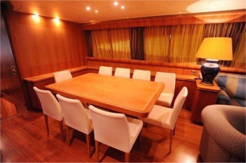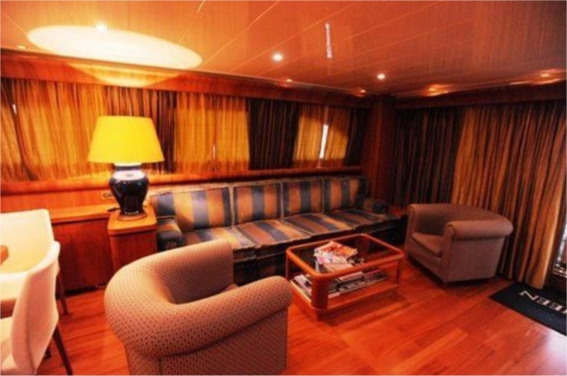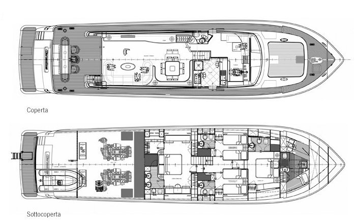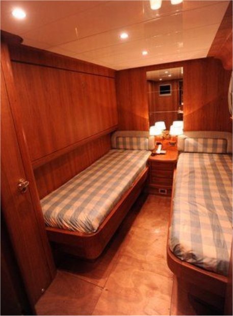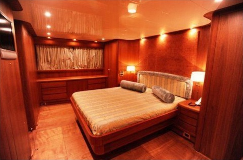 Notas internasCUBIERTA inferior:-Centro de barco de cabina con cama doble, baño y paseo en cabina armario-VIP en el arco con dos cabinas con camas de baño plana + cama extra, cada uno con baño propio. Tripulación:-un acabina único y una cabina doble con baño compartido. -Ciligio de la plataforma Interior satinado, el piso del puente. Notas de la instrumentación-Piloto automático Furuno Radar Furuno-GPS/plotter-Furuno VHF - sonda Furuno Furuno-.Notas de armamento-Satélite TV antena-Onan generadores-aire acondicionado-maniobras hélice en la proa y circuito cerrado de stern TV motor y sistema de habitación cabina Idromar desalinizadora 180 l/h-popa garaje-oferta motor-popa cabrestantes-Mobile sobre la marcha con la parte superior de parrilla, nevera y fregadero-Bimini eléctrica. |