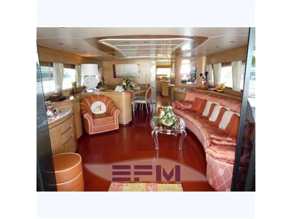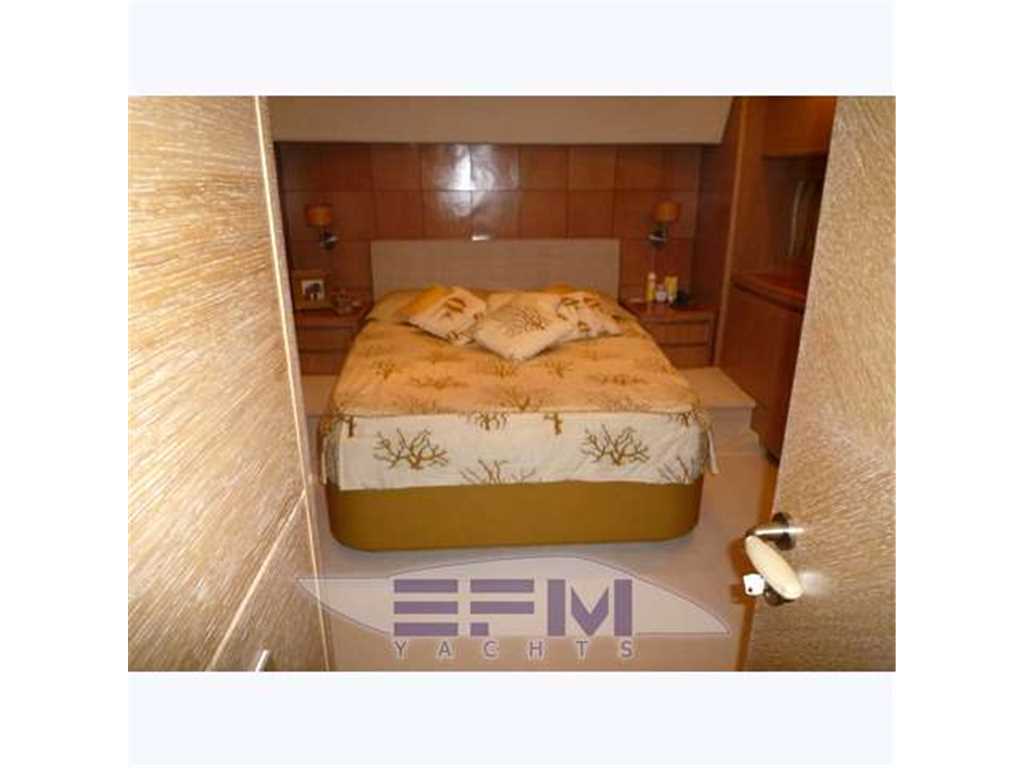 Notas internasRifiniture interne eleganti e raffinati in rovere chiaro, pavimenti e rivestimenti in cuoio , divani e tessuti damascati color salmone - Versione 4 cabine ciascuna con bagno privato .. e pavimenti in mogano con fuga d' acero , tende in tessuto color sabbia e divanerie stile 800 - ampio salone con mobilesagamoto a parete sx e con grande Tv SHARP 42' incassato visibile da ogni lato - area conversazione Tv composta da grande divano 5 sedute + poltrona in stile 800 color salmone e tavolo basso in plexiglass - zona pranzo con grande tavolo rotondo in rovere con 6 sedie e contrapposto mobile di servizio con frigo - locale cucina con porta di uscita laterale composto da mobile con piano in marmo e con elettrodomestici Miele, lavastoviglie, forno, piano cottura in vetroceramica , micronde, doppio frigo da 250 lt. all'americana - Zona timoneria con divano ad U in pelle color crema tavolo in rovere e sedia , posto di pilotaggio con panca doppia seduta - A dritta.. scala a chiocciola di accesso al ponte inferiore con luci cotesia azzurre - A centro barca l' elegante Suite armatoriale con grande letto matrimoniale centrale in legno rovere e con testata in cuoio color marrone , scrittoio , Tv lcd 24', impianto stereo con dvd , e bagno privato rivestito in marmo colorato e con box doccia separato , cabina armadio con cassettiere - prima cabina ospiti a 2 letti in piano, tv lcd, impianto stereo con dvd,e con servizio privato rivestito in marmo colorato e con box doccia - seconda cabina ospiti con letto ad una piazza e mezzo in piano, tv lcd, impianto stereo con dvd,e con servizio privato rivestito in marmo colorato e con box doccia con accesso anche dall' esterno - A prua cabina Vip con grande letto matrimoniale ad isola , scrittoio , Tv lcd 24', impianto stereo con dvd, telefono, e bagno privato rivestito in marmo colorato e con box doccia -A poppa alloggio equipaggio con entrata dalla plancetta bagno composto da 2 cabine una ad 1 letto ed una a 2 letti alla francese + grande bagno con bidet e doccia idromassaggio + accesso diretto alla sala macchne e alla zona lavanderia -