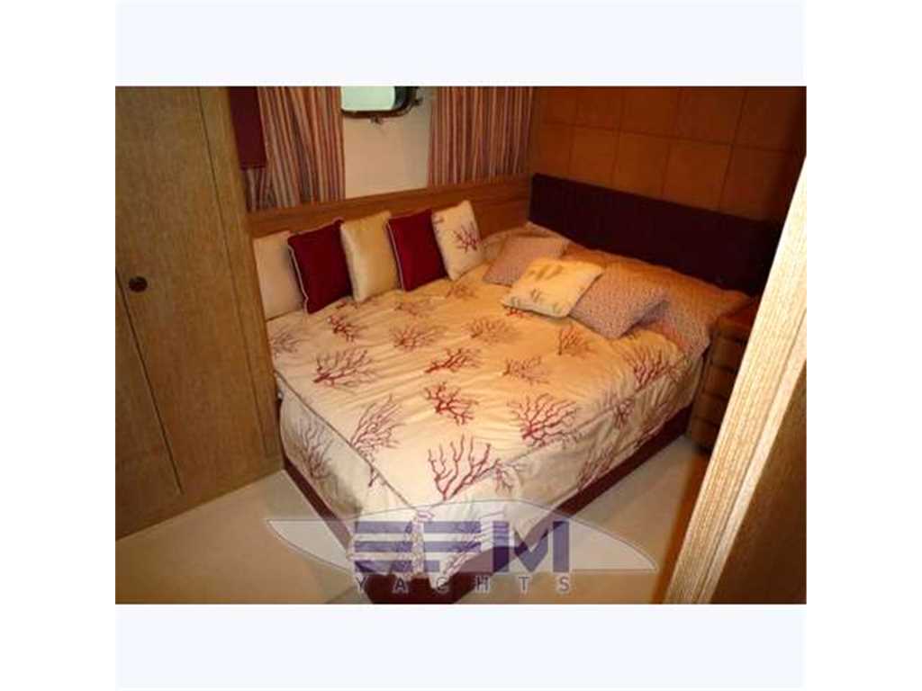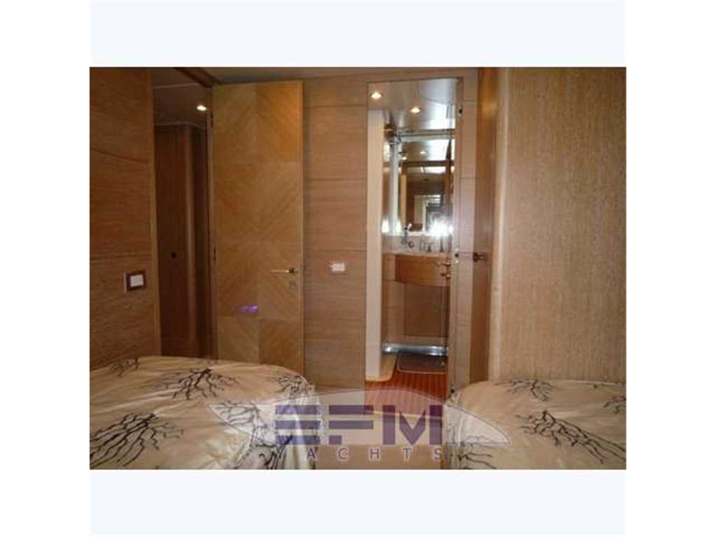 Interior trim, elegant and refined in light oak, floors and walls, leather sofas and damask fabrics Salmon - Version 4 cabins each with private bath .. and mahogany floors with a gap of 'maple, sand-colored fabric curtains and sofas style 800 - large living room with mobilesagamoto wall and left with large TV SHARP 42' grossed visible from all sides - Tv conversation area consists of large sofa seats 5 + style armchair 800 salmon and coffee table in plexiglass - dining area with a large round table in oak with 6 chairs and contrasted mobile service fridge - galley with output port side consists of furniture with marble and Miele appliances, dishwasher, oven, ceramic hob, microwave, double fridge 250 lt. American - Helm position with U-shaped sofa in cream leather oak table and chair, the steering position with double seat bench - A straight .. spiral staircase for access to the lower deck, with blue lights Cotesia - Amidships 's elegant master suite with large central double bed in oak and brown leather headboard, desk, LCD TV 24', stereo with DVD, and a private bathroom covered in colored marble and separate shower, walk- cabinet with drawers - first guest cabin with two twin beds, LCD TV, stereo system with DVD player, and private bathroom with a marble and colored with shower - guest cabin with single bed and a half floor, LCD TV, stereo system with DVD player, and private bathroom with a marble and colored with shower with access from 'external - Forward VIP cabin with large island double bed, desk, LCD TV 24', DVD stereo, telephone, and marble-tiled bathroom with shower-colored and aft crew cabin with entrance from the swim platform consists of a 2 cabins with 1 double bed and one with 2 queen size beds + large bathroom with bidet and shower + direct access to the room and macchne the laundry area