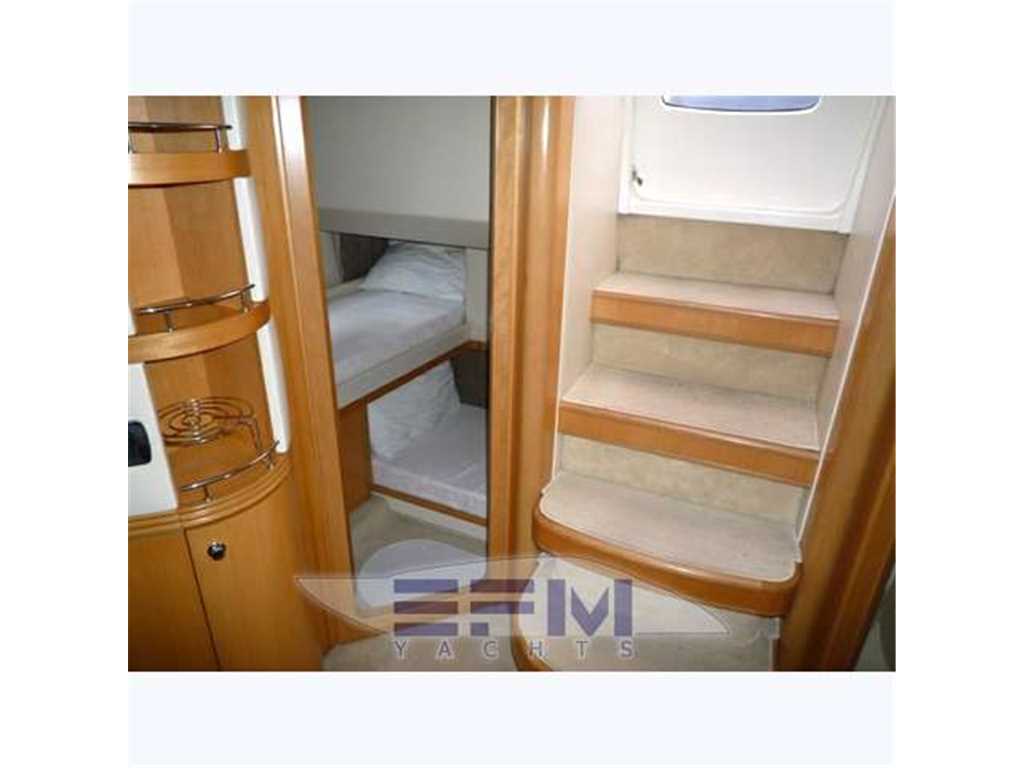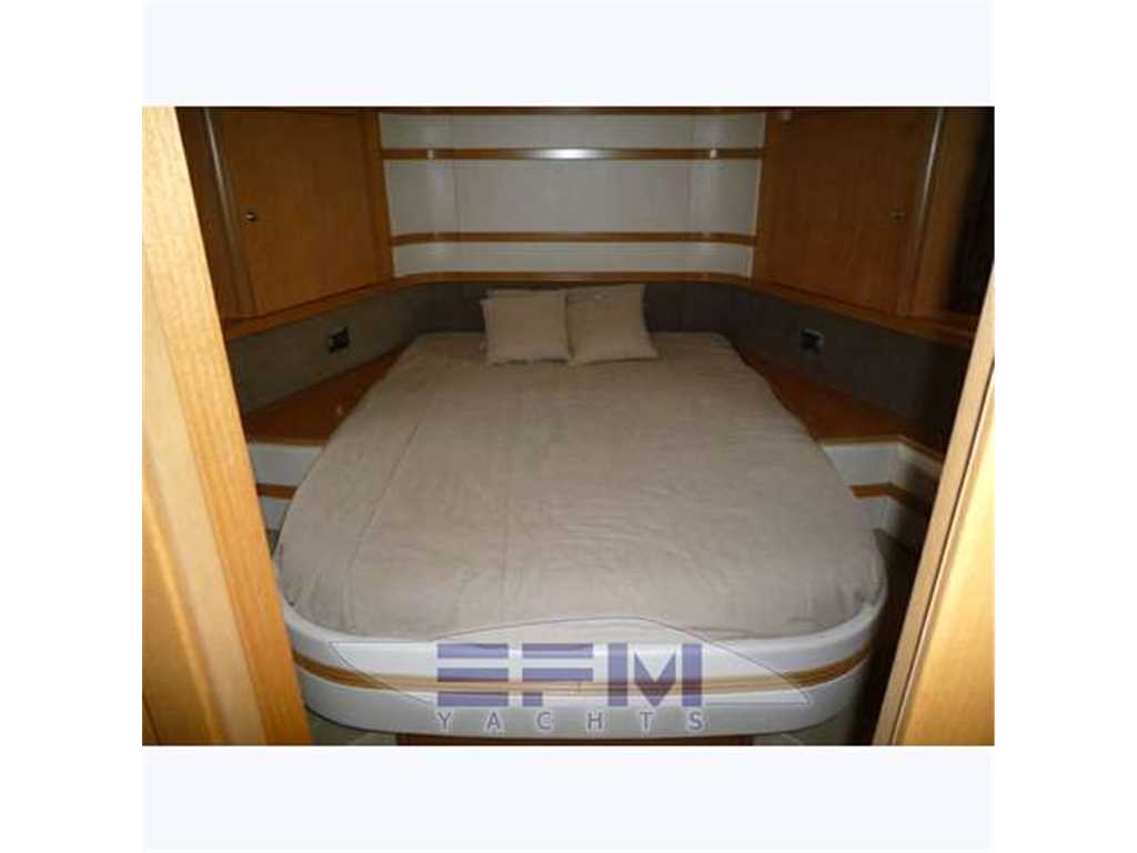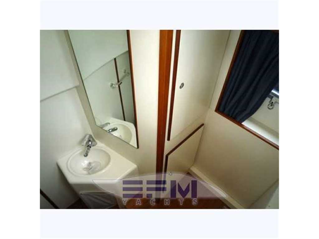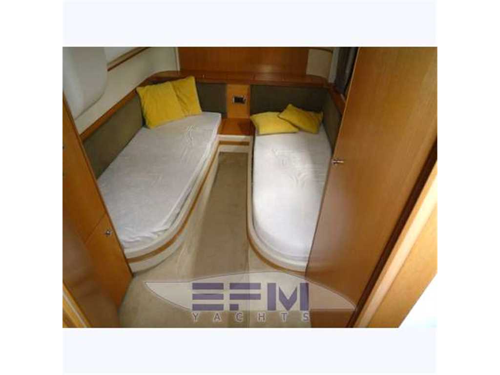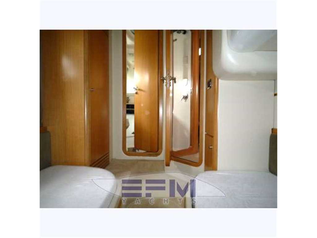 Notas internasCostruzione e strutture: scafo realizzato con resine speciali e tessuti in vetrokevlar. Per le murate, finitura in gelcoat blue navy; linee d'acqua verniciate. Bottazzo in acciaio inox Coperta: camminamenti in vetroresina antisdrucciolo; battagliole, bitte di ormeggio e passacavi in acciaio inox; 2 passauomo in coperta; bimini top con apertura elettrica; roll-bar e parabrezza in vetroresina con trasparenti in vetro temperato Zona di prua: ancora tipo Danforth in acciaio zincato da 40 chilogrammi con passaggio in cubia con piastre in acciaio inox; verricello elettrico da 1.500 watt; 75 metri di catena in acciaio zincato Pozzetto: divaneria a C con tavolo centrale nella parte sinistra del pozzetto; sedile pilota a 2 posti con gavoni; mobile bar con frigo, lavello e grill disposto specularmente verso poppavia; prendisole poppiero con passaggio a dritta per la plancia di poppa Plancetta poppiera: in vetroresina con scaletta bagno manuale; doccia acqua calda e fredda; passerella idraulica e gruetta tender a scomparsa. INTERNI Suddivisione e caratteristiche: a pruavia del grande salone è disposta la cabina armatoriale con bagno privato. Verso poppa vi sono le 2 cabine ospiti e una seconda toilette Posto di pilotaggio: sul lato di dritta del pozzetto, servito da divanetto a 2 posti. Plancia ergonomica con strumentazione motori, radiotelefono VHF, plotter con GPS, ecoscandaglio, bussola, pilota automatico con interfaccia GPS Zona carteggio: sui tavolini in pozzetto e nel salone interno Zona cucina: collocata nella zona mediana dell'imbarcazione, sul lato di dritta. Mobili base e pensili in legno pregiato; piastra cottura; microonde; mobile con frigo/freezer da 270 litri. La qualità e la raffinatezza degli allestimenti si nota a prima vista. Lo spazio è ben sfruttato ed è adeguatamente valorizzato dalla scelta di tonalità chiare in tutte le cabine per ciò che riguarda arredi e rivestimenti. Accessoristica interna di alta gamma Interni moderni ed eleganti in rovere sbiancato e venghe e pavimento in moquette . Ampia e spaziosa dinette posizionata al centro barca, è arredata con divano in pelle + 2 sedute amovibili , tv LCD e impianto Hi-Fi, ed è dotata di una funzionale cucina super attrezzata completa di grande frigo 270 lt ,3 fuochi vetroceramica ,lavello ,lavastoviglie, forno microonde. A prua è posizionata la cabina armatoriale, con bagno e cabina doccia spaziosa come quella di casa. Verso poppa sono situate le due cabine ospiti gemelle: una con i letti in piano e bagno privato con box doccia , e l' altra con i letti alla francese e il bagno con doppio ingresso anche dal salone. POZZETTO • Divano con cuscini • Sedile pilota a due posti con cuscini e gavoni • Cuscini prendisole di poppa • Tavolo fisso con piano sovrapponibile • Mobile bar con frigo a due cassetti,lavello, acqua calda e fredda, grill, pattumiera, presa 220 V c.a. • Doccetta calda e fredda a poppa. • Porta scorrevole ingresso alloggi con finestratura e fermo • Piattaforma di poppa con scaletta da bagno manuale INTERNI • Parquet in essenza zona salone • Moquette in alloggi • Pareti rivestite in essenza e materiale sintetico • Bagni in vtr • Porte in legno • Soffitti in materiale sintetico e legno laccato • Mobili in essenza con finiture interne stesso materiale • Tessuti di arredamento per divani, tende, copriletti, cuscini • Gradini discesa salone interno in moquette SALONE • Divano con rivestimento in tessuto, cuscini asportabili e gavoni • Tavolo centrale regolabile in altezza con piano superiore asportabile • Pouf (2) • Impianto TV LCD e DVD, predisposizione per collegamento I-POD • Tenda • Oblò (1) • Boccaporto con oscurante • Pensile con sportelli e quadro elettrico CUCINA • Mobile base cucina con portelleria, cassetto porta posate, lavelli, rubinetto a scomparsa, piano cottura a 2 fuochi, piano in similmarmo con coperture • Mobile pensile con portelleria, luce su piastre cottura e microonde tipo combi • Mobile con frigo/freezer da 270 lt, 220 V CA • Oblò (1) • Tenda veneziana CABINA ARMATORE • Armadi (2) con appendiabiti, sportello, luci interne e ripiani porta oggetti • Mobile laterale con ripiani bassi • Letto matrimoniale con piano sollevabile, pistoni a gas, due cassetti, vano stivaggio • Materasso a molle, con guanciali, e copriletto • Tende laterali in tessuto con oscurante • Oblò (2) BAGNO ARMATORE • Mobile in legno laccato con specchi e ripiani porta oggetti • WC Vacuum Flush • Box doccia con porta, vani portaoggetti e carabottino in teak verniciato • Calpestio in parquet • Lavello e piano in similmarmo • Accessori in cromo, plexiglas, acciaio inox • Luci 24 V e presa 220 V c.a. • Tenda veneziana • Specchio • Oblò (1) CABINE OSPITI (2) • Letti separati con comodino e cassetto • Contenitore sotto il letto • Materassi a molle (2), e guanciali (2) • Copriletto (2) • Tappezzeria in tessuto • Armadio con appendiabiti, luci interne e cassetto • Tenda oscurante • Cassettiera • Oblò (1) BAGNO OSPITI • Mobile in legno laccato, a specchi, e con ripiani porta oggetti • WC Vacuum Flush • Doccia con porta pieghevole in plexiglas • Piano calpestio con carabottino in teak verniciato • Piano lavello e lavello in similmarmo • Accessori in cromo, plexiglass, acciaio inox • Luci 24 V e presa 220 V c.a. • Tenda veneziana • Specchio • Oblò (1) LOCALE EQUIPAGGIO • Boccaporto in pozzetto per accesso • Letto con sportelleria alla base • Tenda di chiusura per doccia e wc • Materasso e guanciale • Armadio appendiabiti • Tenda • Aria condizionata • WC Vacuum Flush • Accessori bagno • Oblò (1) Notas de la instrumentaciónStrumentazione Raymarine completa: gps plotter cartografico C 120 interfacciato - vhf - ssb - autopilota interfacciato - ecoscandaglio - manette elettroniche - telefono gsm - antenna Tv - antenna Sat tv in dome kvh m5 - lettore cd/dvd - televisore lcd