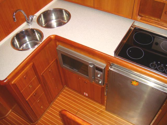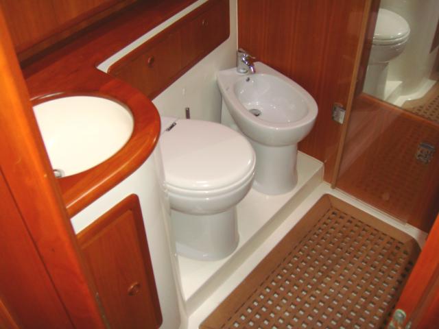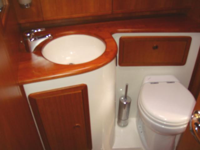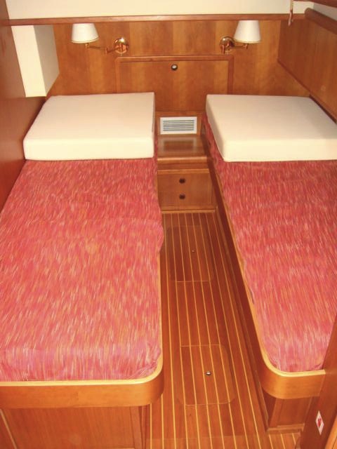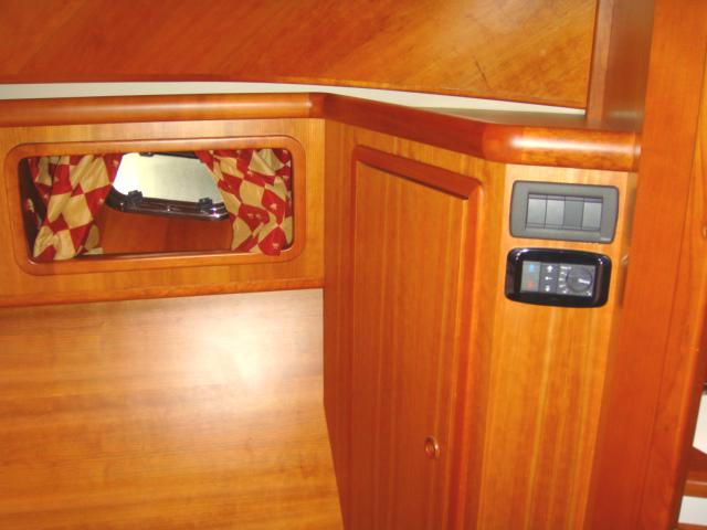 Marinas interiores, calidad muy clásico y elegante, madera y tejidos. Barco, no económica producto del molde. entrando desde la cabina del piloto es una sala de estar con sofá de cuero lado sx, móvil en la caseta del timón estribor y siempre a la derecha. Es ir abajo de la cocina, el huésped la cabina a la izquierda. el barco tiene 2 baños: uno en la cabina hacia adelante y uno accesible desde el pasillo que también sirve a los huéspedes. Las instalaciones cuentan con aire acondicionadas.