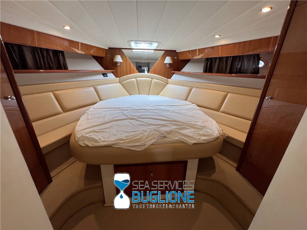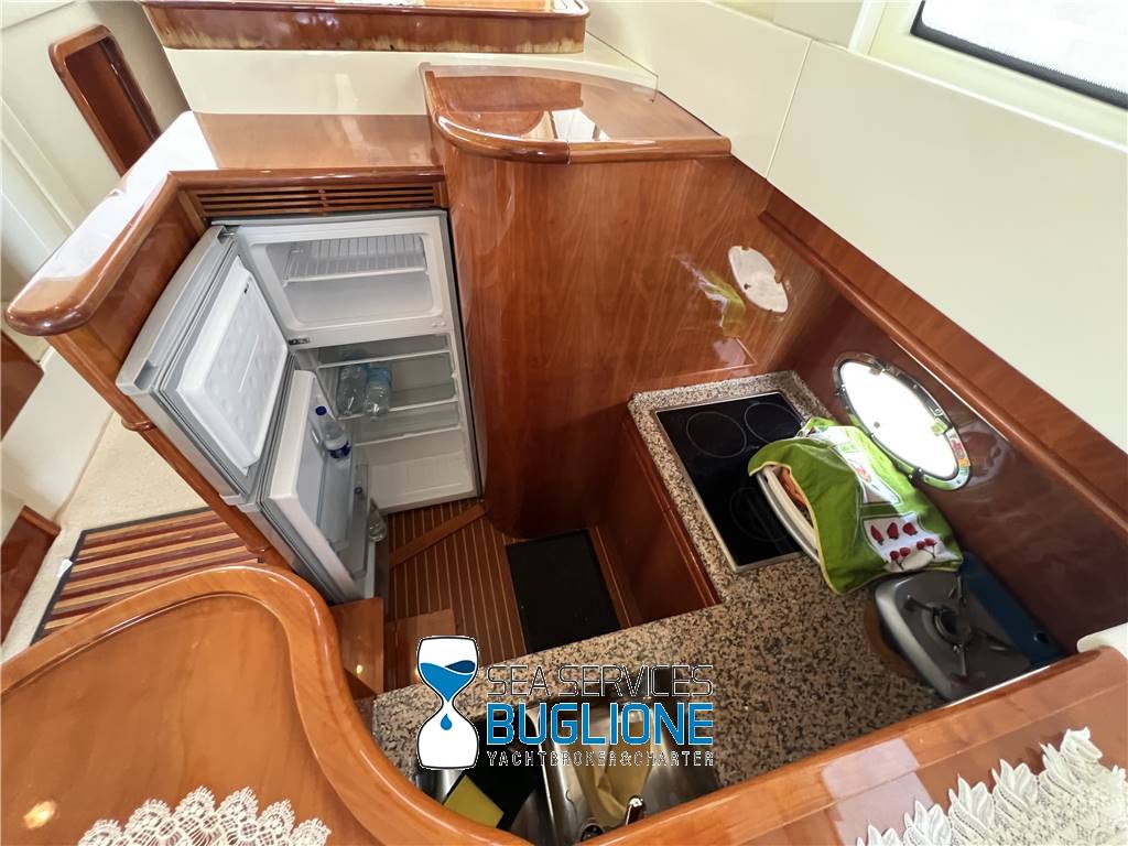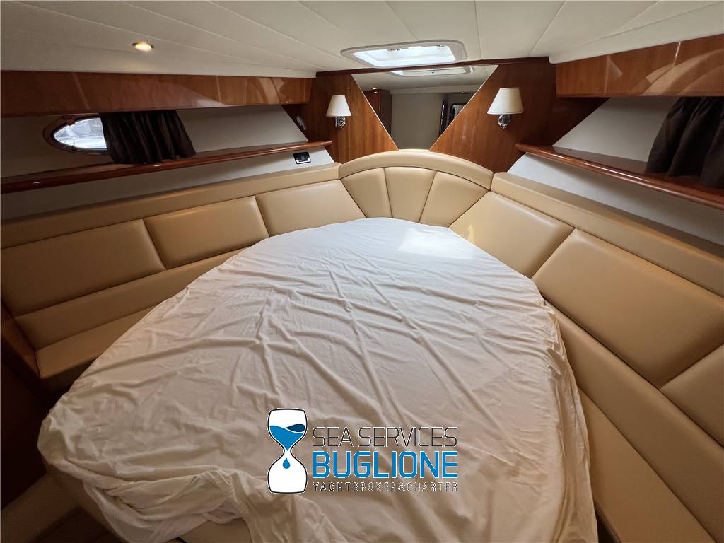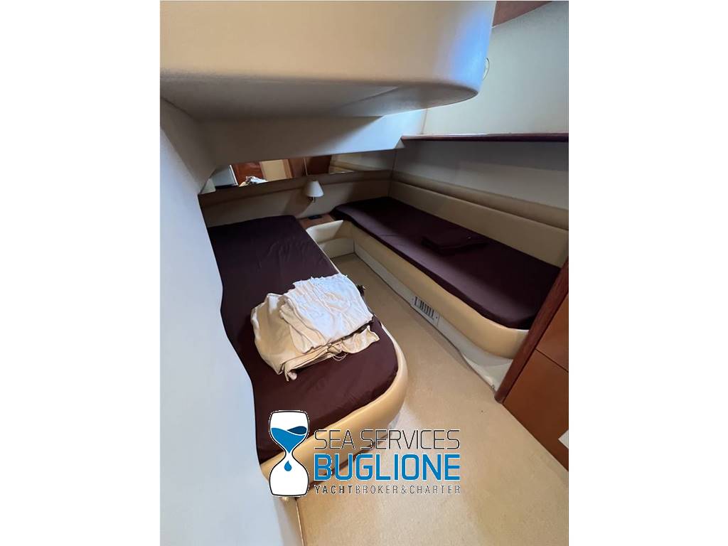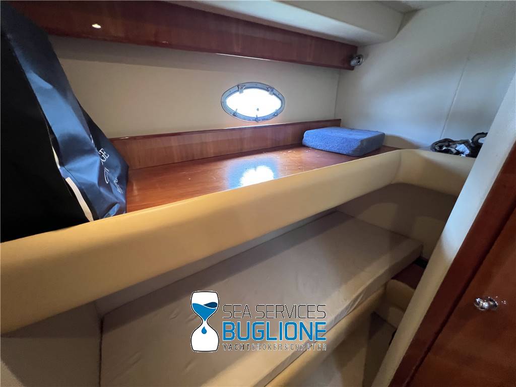 Notas internasPresenti n°2 armadi per lui e per lei. Accesso al bagno armatoriale privato, wc elettrico e bidet, box doccia chiuso. Cabina ospiti a sinistra nave con letti singoli gemelli Cabina a dritta nave con letti a castello ampia dinette caratterizzata dal divano a sinistra nave a dritta nave un disimpegno con cambio di quote crea la giusta riservatezza per alloggiarvi la zona cucina dotata di n°4 fuochi elettrici frigo a colonna e lavabo. Nella parte prodiera a sinistra nave trova spazio la postazione di comando con manette elettroniche e quadro generale impianto elettrico. Notas de la instrumentaciónGpsVhf Notas de armamentoCaricabatteri sbc 1450Generatore Aria Condizionata Passerella idraulica a centro nave Elica di Prua Elica di Poppa |