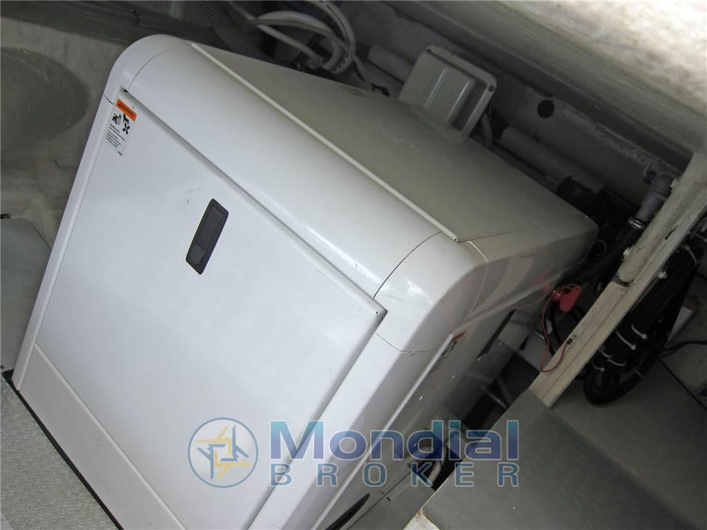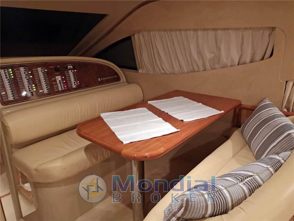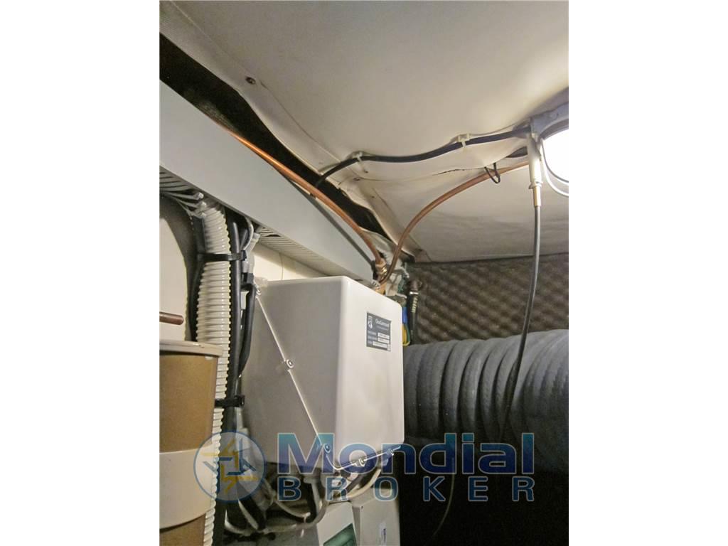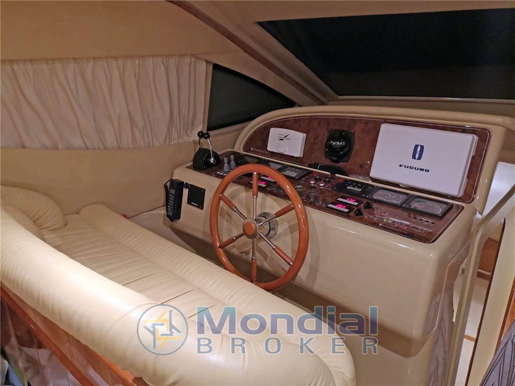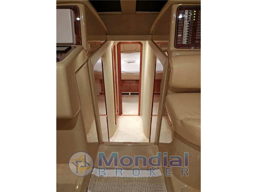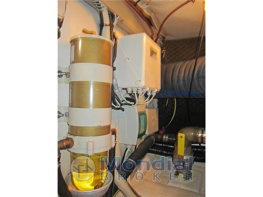 Notas internasNotas de la instrumentaciónAngolo barra, Antenna radar, Bussola, Comando motori elettronico, Computer di bordo, Contamiglia, Display, 2 Ecoscandaglio, 2 GPS (MULTIF FURUNO NAV NET), Log, 2 Pilota automatico (AP3030 GOLD), Radar (FURUNO), 2 Radio VHF (RAYMARINE SHIPMATE RS 8400).Notas de armamentoAllestimento tecnico e di coperta:Allarme motore, Allarme sentina, Autogonfiabile, Caricabatterie (MASTERVOLT CHARGERMASTER), Doccia esterna, Doppia timoneria, Elica di poppa - stern thruster (SIDE POWER), Elica di prua - bow thruster (SIDE POWER), Faro orientabile, Flap idraulici, Impianto antincendio, Indicatori Flaps, Luci di cortesia, Luci subacquee, Passerella (Idraulica), Piattaforma, Pompa di sentina automatica, Pompa di sentina manuale, Pozzetto Teak, Presa 220V banchina, Raddrizzatore, Rollbar, Salpa Ancore Elettrico, Scaletta da bagno, Sistema Depurazione acque nere, Tavolo pozzetto, Tromba, Winch, Winch tonneggio di poppa, Winch tonneggio di prua. Dotazioni domestiche di bordo: Aria condizionata (CONDARIA 30000 BTU), BBQ/ Grill, Clima reversibile, Impianto acque nere, Prese interne 12v, Prese interne 220v, 3 WC marino elettrico. Intrattenimento: Altoparlanti, Antenna Satellitare TV, Decoder satellite, Digitale Terrestre, DVD, Impianto TV, 4 Radio AM/FM, 4 Stereo, TV. Cucina ed elettrodomestici: Cucina, Fornello, Frigorifero esterno, Frigorifero interno, Ghiacciaia, Piastra elettrica, Piastra in vetroceramica. Tappezzerie: Bimini, Cuscineria completa, Cuscineria di poppa, Cuscineria di prua, Cuscineria fly, Cuscineria Pozzetto, Teli chiusura T-Top, Teli copri finestra, Telo Copertura Fly, Telo copriconsolle, Telo coprisedile, Tendalino. |