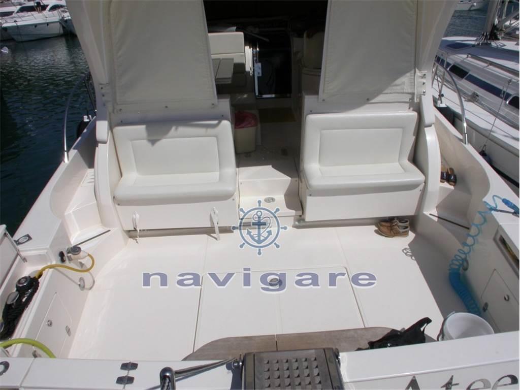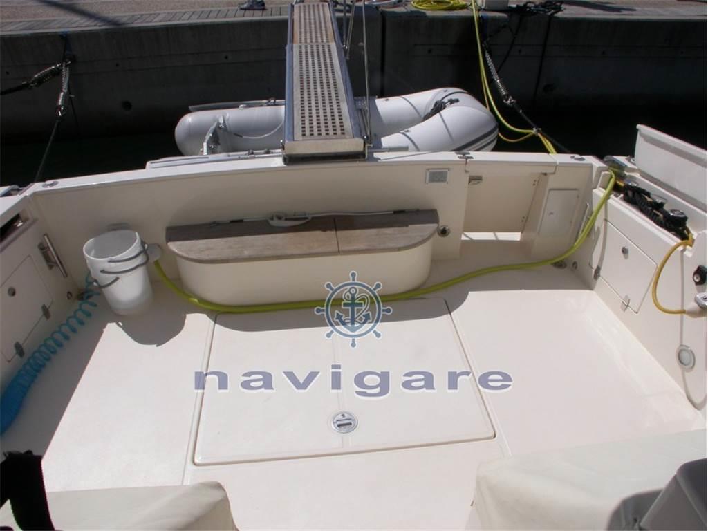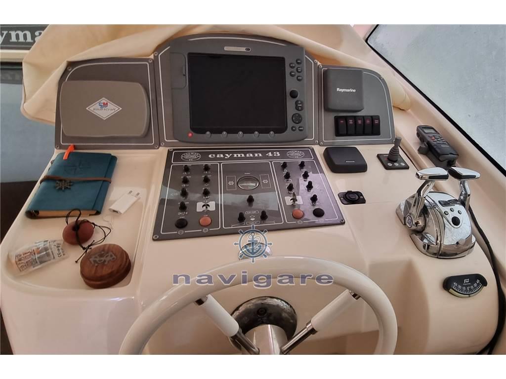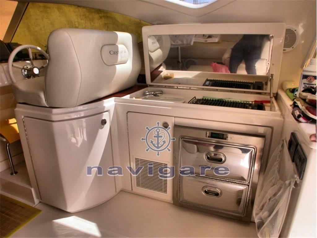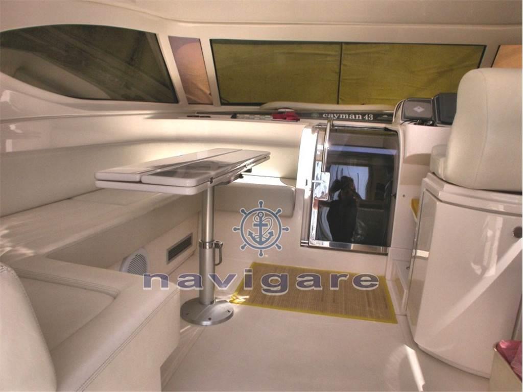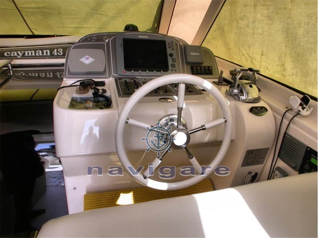 Notas de armamentoIl Cayman 43 w.a. è una barca dalla linea accattivante, filante e bassa sul mare, studiata per una vacanza in barca di alto prestigio. Pratica e comoda, permette di stabilire subito un rapporto di grande intesa e totale sicurezza percepito sia dall'armatore che da ospiti occasionali. La carena a V profonda con angolo di 18° a poppa consente una navigazione morbida e piacevole. La disposizione degli arrediinterni, realizzata in pregiato ciliegio, conferisce un esclusivo comfort nell?eleganza più raffinata. Le cabine sono due doppie compresa quella dell?armatore, dotate del proprio bagno e doccia. L?area di centro poppa è suddivisa in due zone: il pozzetto superiore dove è situata la dinette con servizio cucina (fornibile su richiesta con Hard Top ad apertura elettrica), e il pozzetto di poppa per le attività nautiche.