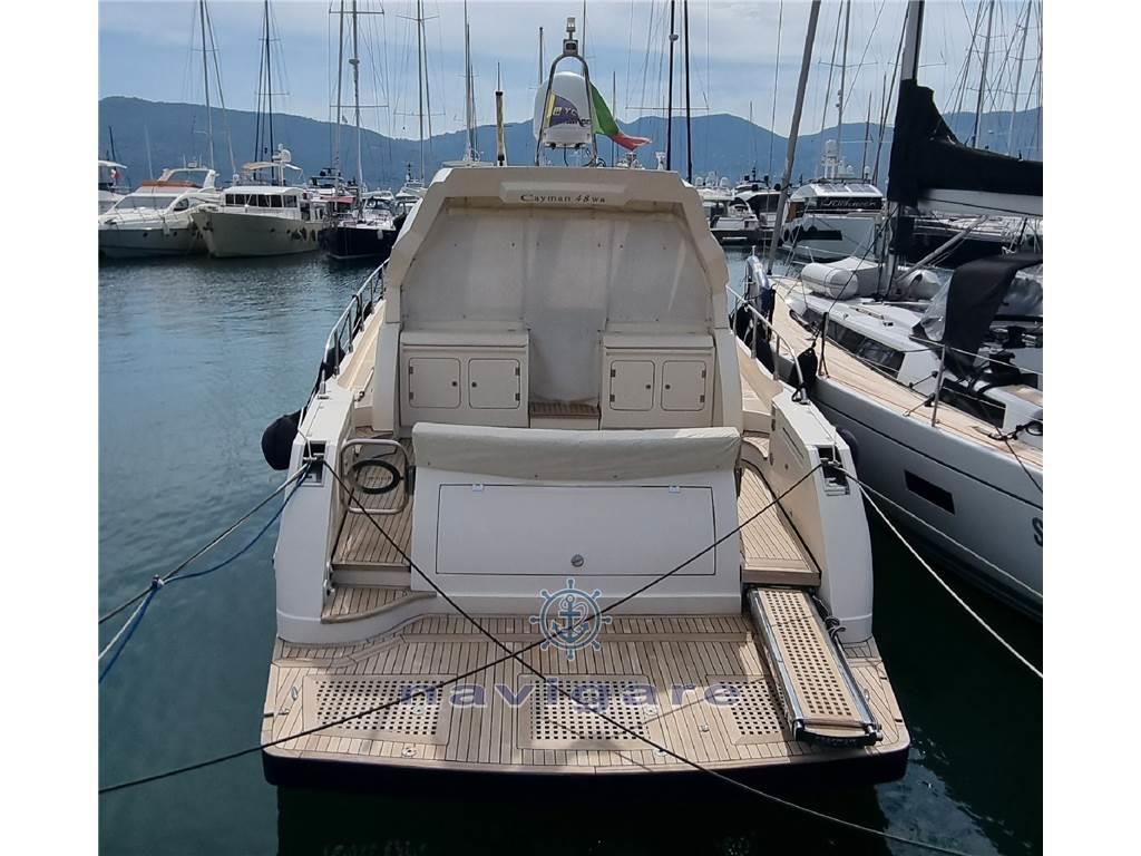 Notas de armamentoIl Cayman 50 w.a. presenta un architettura esterna armoniosa, valorizzata da un disegno che gli architetti Nuvolari e Lenard hanno voluto connotare con uno stile innovativo senza stravolgere il concetto Cayman di una barca solare e godibile. Il Cayman 50 w.a. offre spazi attrezzati per il massimo confort della vita a bordo: sottocoperta tre cabine, due bagni, una dinette e una cucina completa di tutto. All esterno due pozzetti con specifiche funzioni: - convivialità su quello superiore, protetto da un luminoso hard top apribile - prendisole e area dedicata al mare su quello inferiore. La carena a "v" profonda di 18° a poppa con sistema sideweting produce una grande stabilità e facilità di planata anche a basse andature. Questa barca è la naturale evoluzione di una proposta nautica che ottiene, senza interruzione di continuità, sempre crescenti affermazioni.