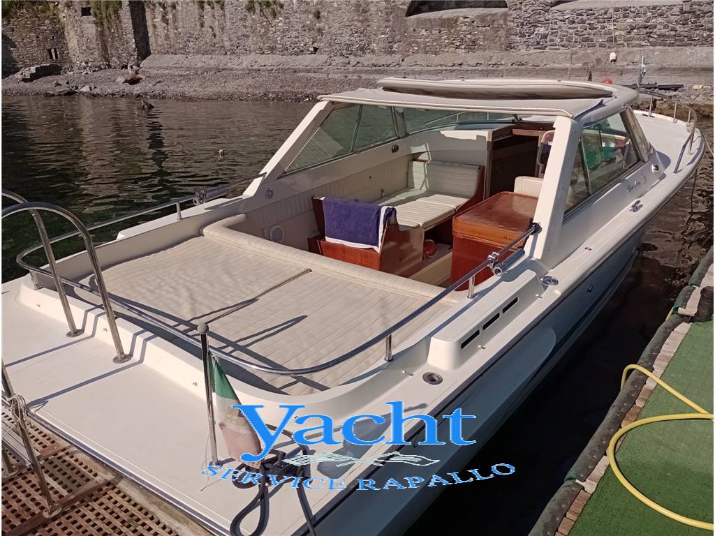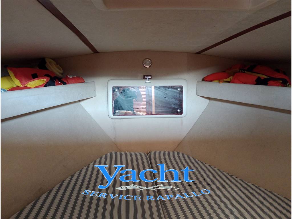 Notas internascabina di prua con 2 posti letto a V - boccaporto per accesso a prua dalla cabina – n. 1 vano porta oggetti - n. 1 bagno separato con wc marino e doccietta – pozzetto allestito con: seduta di guida, tavolo trasformabile con n. 2 sedute; mobile pozzetto con lavabo, piano di cottura con n. 2 fuochi a gas e frigorifero; divanetto di poppa - hard top con tettuccio apribile – prendisole di poppa – plancetta di poppa con inserti in teak – scaletta bagno - n. 2 maniglioni inox fissi custom risalita plancetta/prendisole.