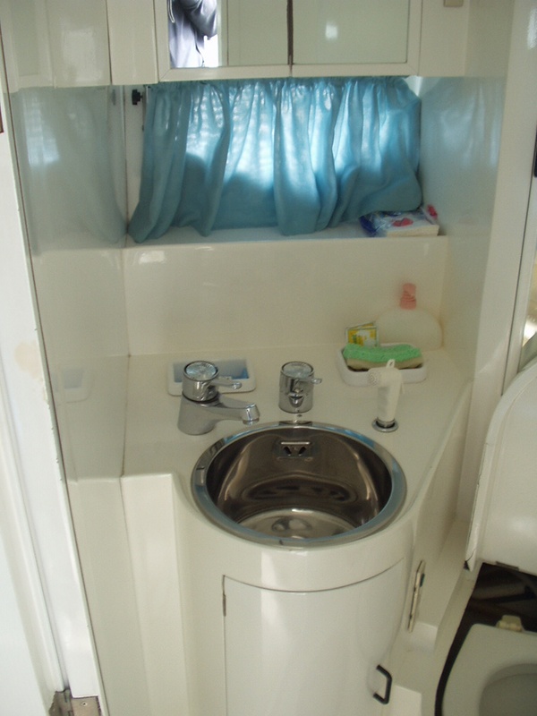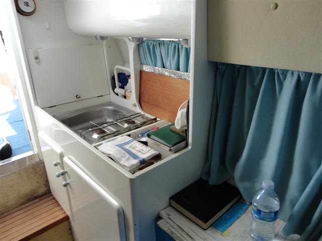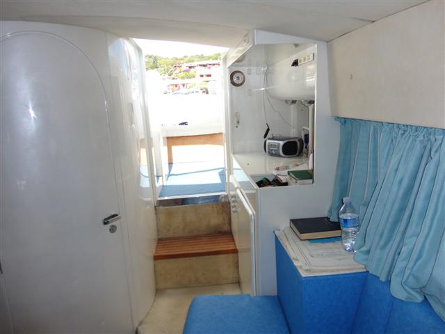 Notas internasde diseño abierto con cama de matrimonio y comedor en la proa y sofás con mesa - cocina lado izquierdo - cuarto de baño con ducha -