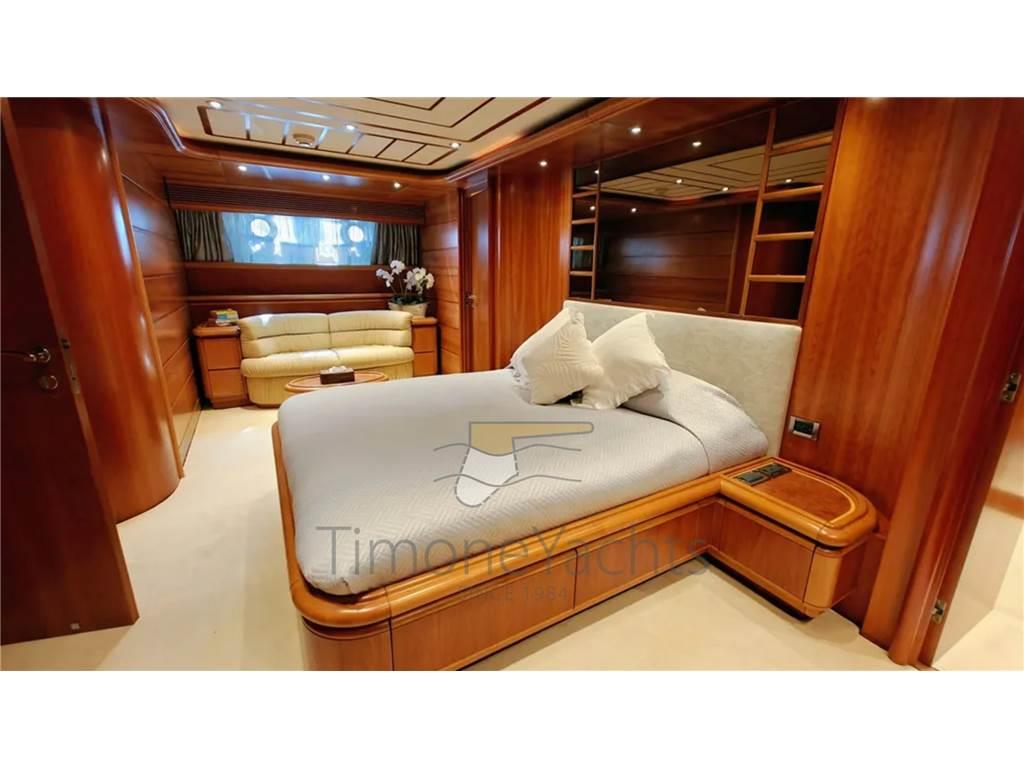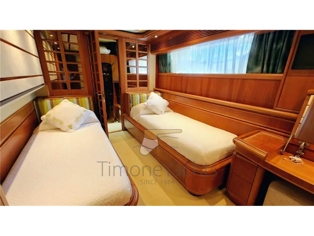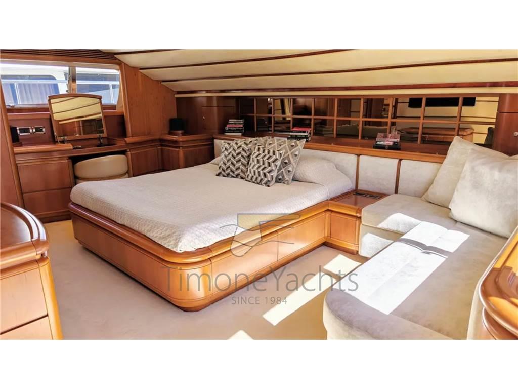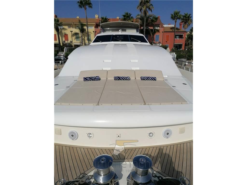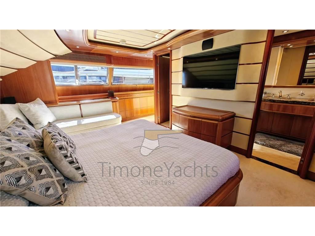 Notas de armamentoAltoparlanti, Aria condizionata (160,000 BTU), Asciugatrice, 2 Bimini, Boiler, Collegamento internet, Congelatore, Cucina, Cuscineria completa, Cuscineria di poppa, Cuscineria di prua, Cuscineria fly, Cuscineria Pozzetto, Dissalatore, Forno, 2 Frigorifero esterno, Frigorifero interno, Ghiacciaia, Home Theater, ICE Maker, Inverter, Lavastoviglie, Lavatrice, Microonde, Pavimento interno in legno, Piastra in vetroceramica, Prese interne 12v, Prese interne 220v, Radio AM/FM, Serbatoio Acque Nere, 6 TV, WC marino elettrico, Winecooler