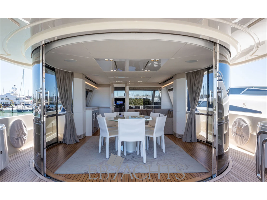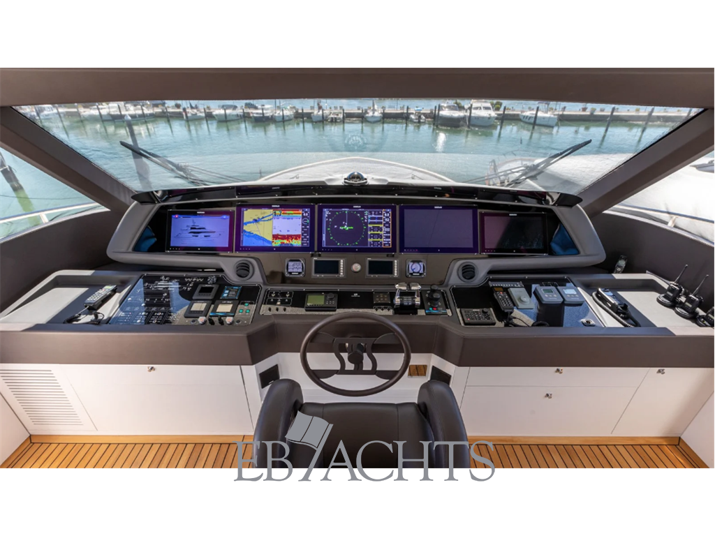 Notas internasVetrate Circolari Scorrevoli: una delle caratteristiche distintive del modello è il sistema di vetrate circolari scorrevoli nell'area pranzo panoramica del ponte superiore. Questa innovazione consente una versatilità unica, permettendo di chiudere l’ambiente per garantire il massimo comfort climatico o aprirlo completamente per godere della vista. Innovativo Dual Mode Transom (DMT): Il sistema DMT rappresenta una vera rivoluzione nel design delle aree esterne di poppa, combinando un garage per tender fino a 4,45 metri con una plancetta immergibile. Questo sistema elettro-idraulico consente di trasformare rapidamente l'area di poppa in un beach club esteso. Main e Lower Deck Salone Principale: l’accesso al salone principale avviene tramite una grande vetrata scorrevole, che conduce ad un open space luminoso e raffinato. L'ambiente è caratterizzato da tonalità chiare e finiture in laccato lucido, con un divano a "U", un mobile basso lungo e una poltrona. La TV a scomparsa ottimizza ulteriormente gli spazi. Cabina Armatoriale: situata sul ponte principale è spaziosa e luminosa e dotata di cabina armadio. Cabine Ospiti: il ponte inferiore ospita quattro cabine lussuose, di cui tre matrimoniali e una doppia, tutte con bagno privato. Le ampie finestrature panoramiche offrono una vista impareggiabile, mentre l'illuminazione a LED crea un’atmosfera accogliente e suggestiva. Upper e Sun Deck Zona Pranzo e Lounge: il ponte superiore è caratterizzato dalla vetrata cilindrica con ante scorrevoli, che consente di creare un ambiente versatile e perfettamente integrato con l’esterno. È arredato con un tavolo in cristallo estendibile e una lounge panoramica interna, con divano a "L" e TV. Plancia di Comando: la plancia di comando è dotata di monitor multi-touch Simrad di ultima generazione, che garantiscono una visibilità ottimale e facilitano la gestione durante la navigazione. Ampio Sun-Deck: area dedicata al relax, dotata di un mobile centrale con grill, lavandino, ice-maker e frigorifero. Notas de la instrumentaciónN.2 Stabilizzatori giroscopici Seakeeper NG9Pinne stabilizzatrici con funzionalità Under Way e Zero Speed Elica di manovra a prua e poppa idraulica 40 Hp doppia elica N. 2 stazioni di governo laterali Stazione di comando in pozzetto fissa con copertura Leve gas-invertitore elettroniche con funzione easy-dock e autotroll Sistema di monitoraggio con N. 2 display LCD 15'' touch-screen Sistema integrato Simrad 3D con display a colori 15'' radar, chartplotter, GPS ed ecoscandaglio Stazione meteo Strumento di navigazione multifunzione Simrad (Eco, Log, e Temp. acqua) Unità di controllo autopilota Simrad VHF ricetrasmittente Simrad AIS Simrad Pannello di controllo pinne stabilizzatrici Antenna Sat KVH TV8 con ricevitore nel salone Dome vuoto per simmetria Impianto TVCC con telecamere per esterno, pozzetto, salone maindeck e upperdeck, cucina, sala impianti e sala macchine con selettore ciclico e monitor 10" Pacchetto premium Internet Cruscotto verniciato soft touch Comando flaps Comando verricelli di prua Comando elettrico per faro di ricerca Allarme acustico esterno per acqua in sentina (sala macchine e prua) Ruota timone rivestita in soft touch Contacatena digitale avvisatori acustici con allarmi Poltrona guida in pelle regolabile elettricamente Timoneria elettroidraulica servoassistita Catena 100m (14mm.) + Catena per ancora 130m (14 mm) Diff da STD Notas de armamentoAria condizionata tropicale salone + cabine + equipaggioN.2 Generatori 28 Kw Köhler Dissalatore Idromar 360 lt/h Boiler 100 litri diff da STD N.8 TVs in salone, cabine, cucina, cabina crew TV LED 48" Smart TV con sollevatore a soffitto e rotazione di 180° nel pozzetto Bimini poppiero upperdeck Bimini sul sundeck Plancetta a poppa con calpestio in teak con sistema di movimentazione up-down elettroidraulica e scala bagno Garage allagabile a poppa Lavastoviglie 12 cop. Piano di cottura induzione Frigorifero "side-by-side" 504 lt 230V con fabbricatore ghiaccio Forno elettrico 90 cm Tritarifiuti N.2 cantinette vini in ponte panoramico Vetrata circolare su telaio in acciaio inox, con 4 ante di cui 2 scorrevoli in zona pranzo panoramico Pozzetto UD: mobile addizionali in vtr sx nave con frigo bottigliera e grill Pozzetto UD: mobile addizionali in vtr dx nave frigo a pozzetto Lavatrice e asciugatrice separate 5,5 kg N. 2 cantinette vini ponte panoramico Frigo-bottigliera cabina armatore Ponte sole: mobile in vtr attrezzato con grill e lavabo Sistema trattamento acque nere |