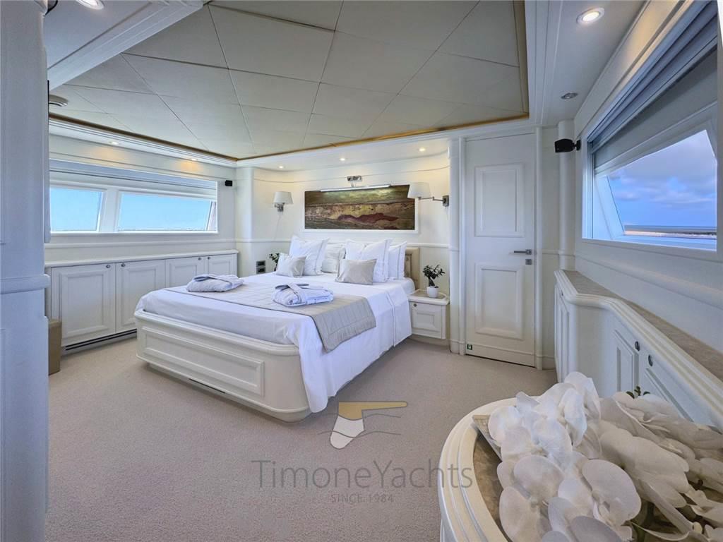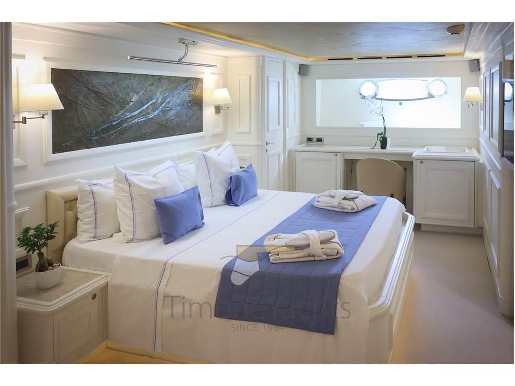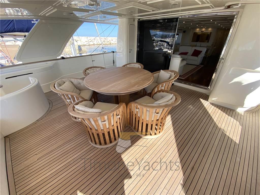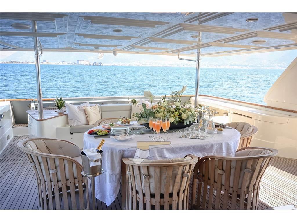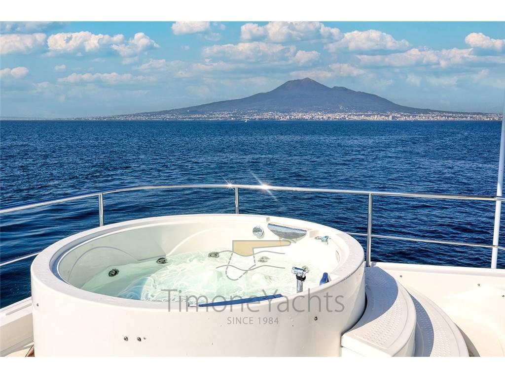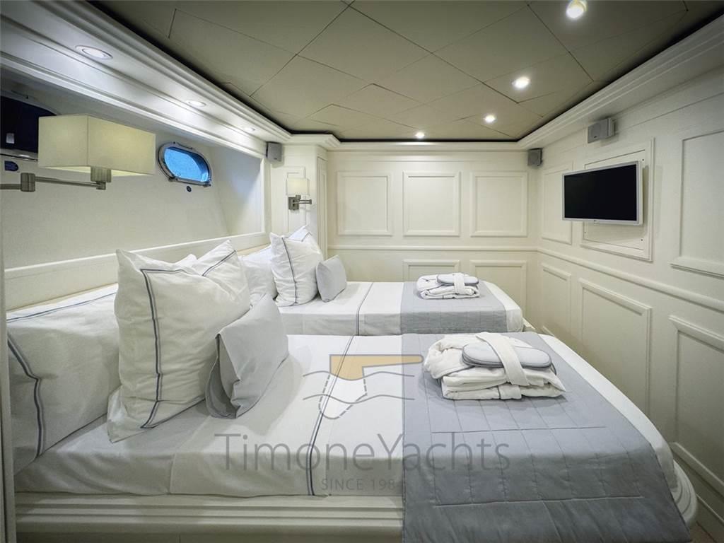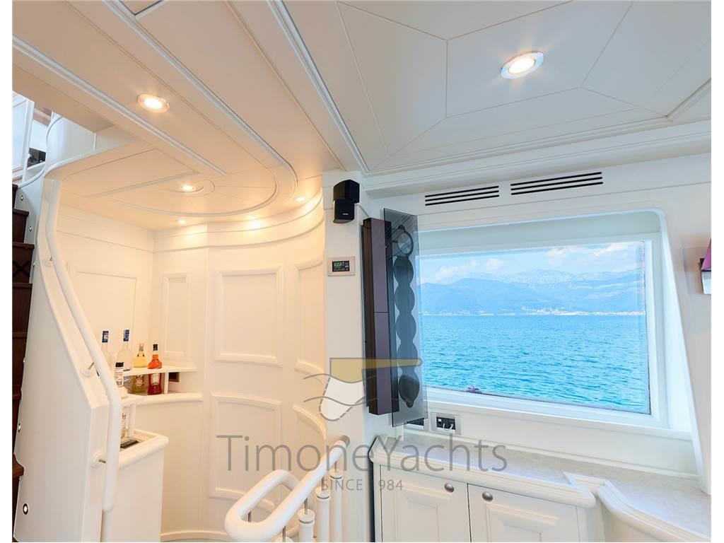 Notas internas- Salone principale che porta alla cucina, dall quale si accedde alla zona crew. - Scala accesso ponte governo, rialzato - bagno giorno - cabina armatoriale, con bidet, vasca e doccia LOWER DECK, - nr. 3 cabine dobbie con bagno, bidet e doccia - nr. 1 cabina doppia a letti gemelli, con bagno, bidet e doccia CREW AREA - nr. 3 cabine doppie letti castello (tot. 6 letti) - nr 3 bagni crew Notas de la instrumentaciónAIS, 4 Comando motori elettronico, 2 Contametri catena, DSC vhf, Ecoscandaglio, GPS, Interfono, Pilota automatico, Plotter, Radar, Telefono satellitare.Notas de armamentoAllestimento tecnico e di coperta:Camminamenti laterali in teak, Doccia esterna, Elica di poppa - stern thruster, Elica di prua - bow thruster, Fari fissi a poppa, Faro orientabile, Flap idraulici, Garage per tender, Gruette per tender su fly, Impianto antincendio, Indicatori Flaps, Lavaggio catena, Luci di cortesia, Luci subacquee, Moto d'acqua (Seadoo 60hp (year 2023)), Passerella, Porta laterale, Pozzetto Teak, Presa 220V banchina, Presa acqua banchina, Sistema Depurazione acque nere (Hamann), 4 Stabilizzatori (nr.3 ARG gyro + fins), Tavolo pozzetto, Tender (Saxador 200 sport (year 2023)), Tromba, 2 Winch tonneggio di poppa, 2 Winch tonneggio di prua. Dotazioni domestiche di bordo: Aria condizionata, BBQ/ Grill, Clima reversibile, 2 Dissalatore, Impianto acque nere, Prese interne 12v, Prese interne 220v, Pressarifiuti, Riscaldamento, Telecamera, 6 WC marino elettrico. Intrattenimento: Altoparlanti, Antenna Satellitare TV, Decoder satellite, Digitale Terrestre, DVD, Home Theater, Impianto TV, Radio AM/FM, Stereo, TV. Cucina ed elettrodomestici: Congelatore, Forno, Frigorifero esterno, Frigorifero interno, Ghiacciaia, ICE Maker, Lavasciuga, Lavastoviglie, Macchina caffè, Microonde, Piastra elettrica. Tappezzerie: Cuscineria completa, Cuscineria di poppa, Cuscineria di prua, Cuscineria fly, Cuscineria Pozzetto, Telo Copertura Fly, Tendalino. |