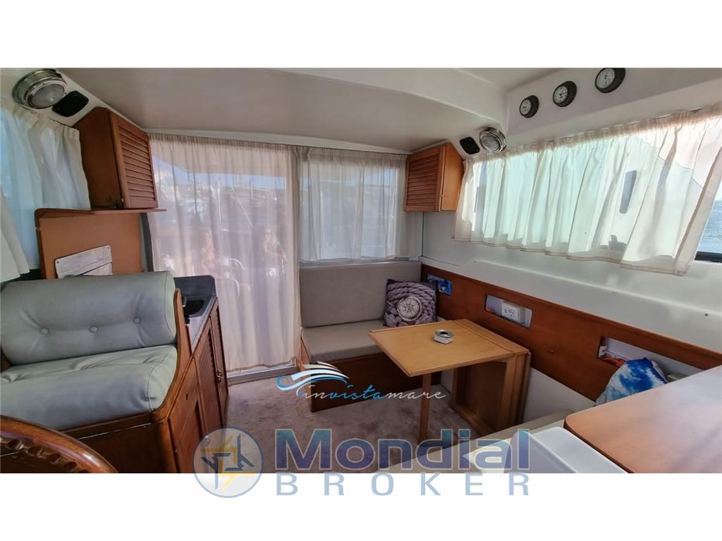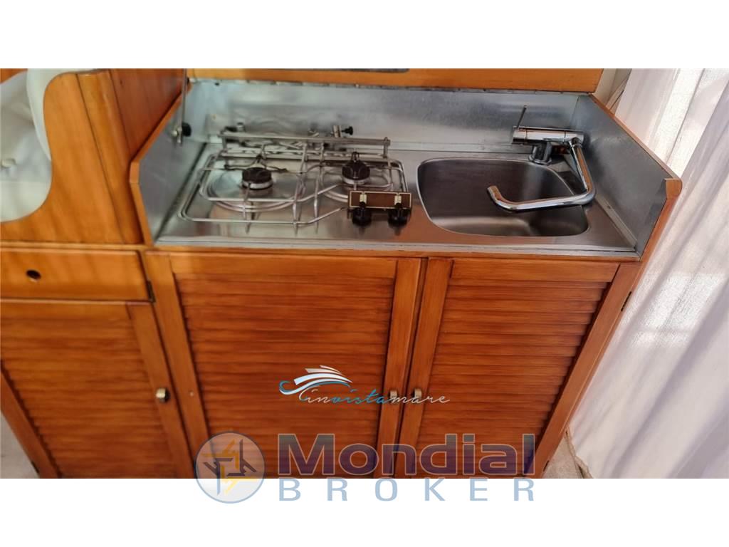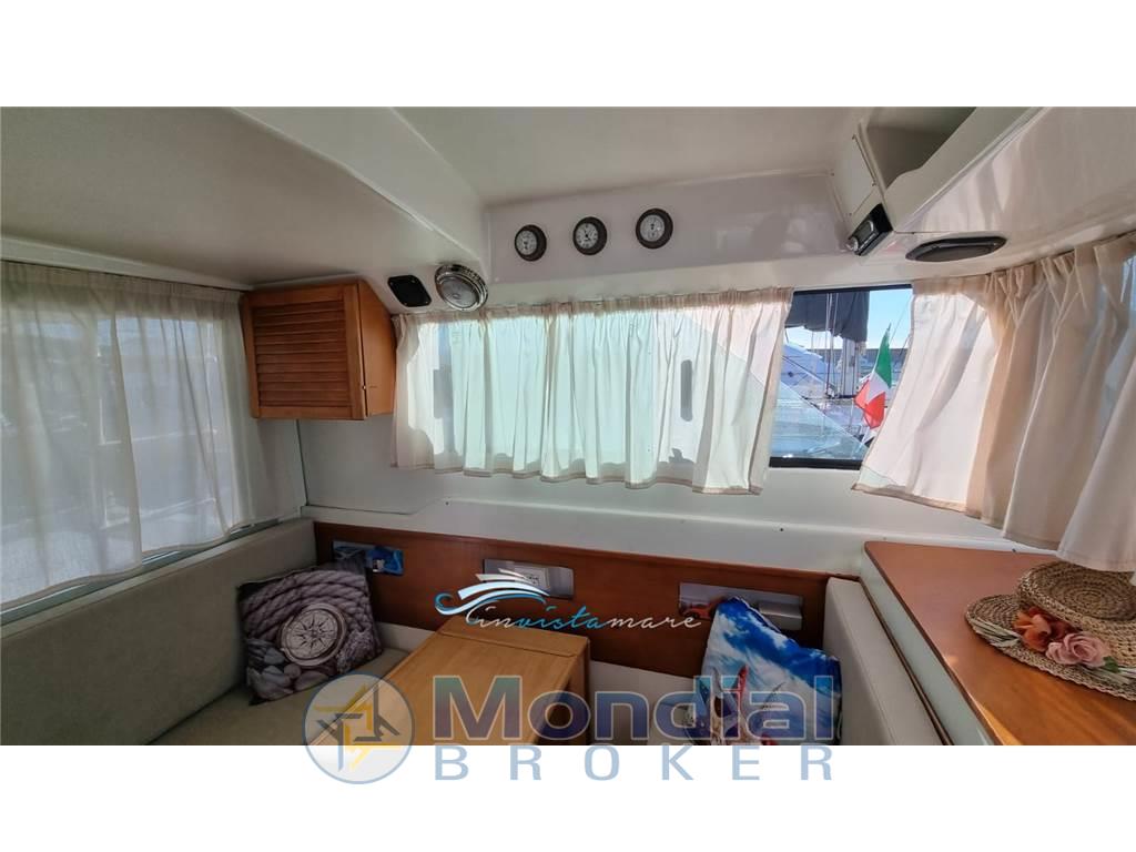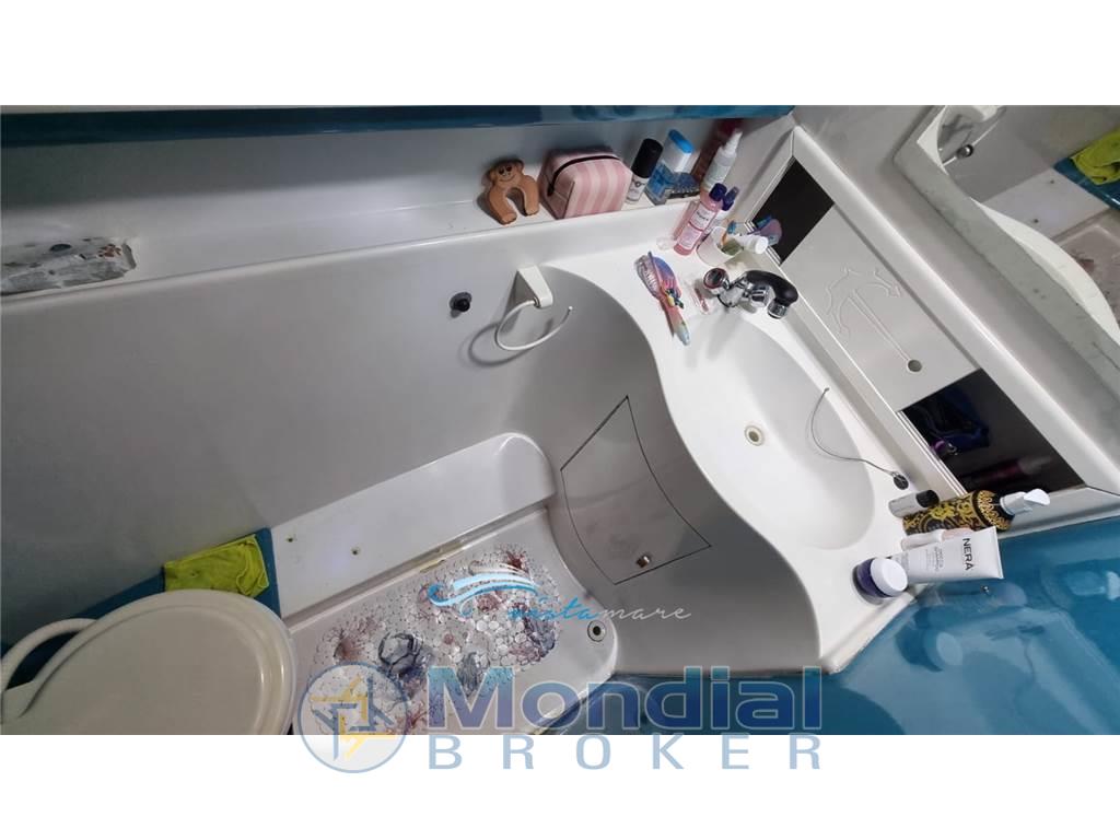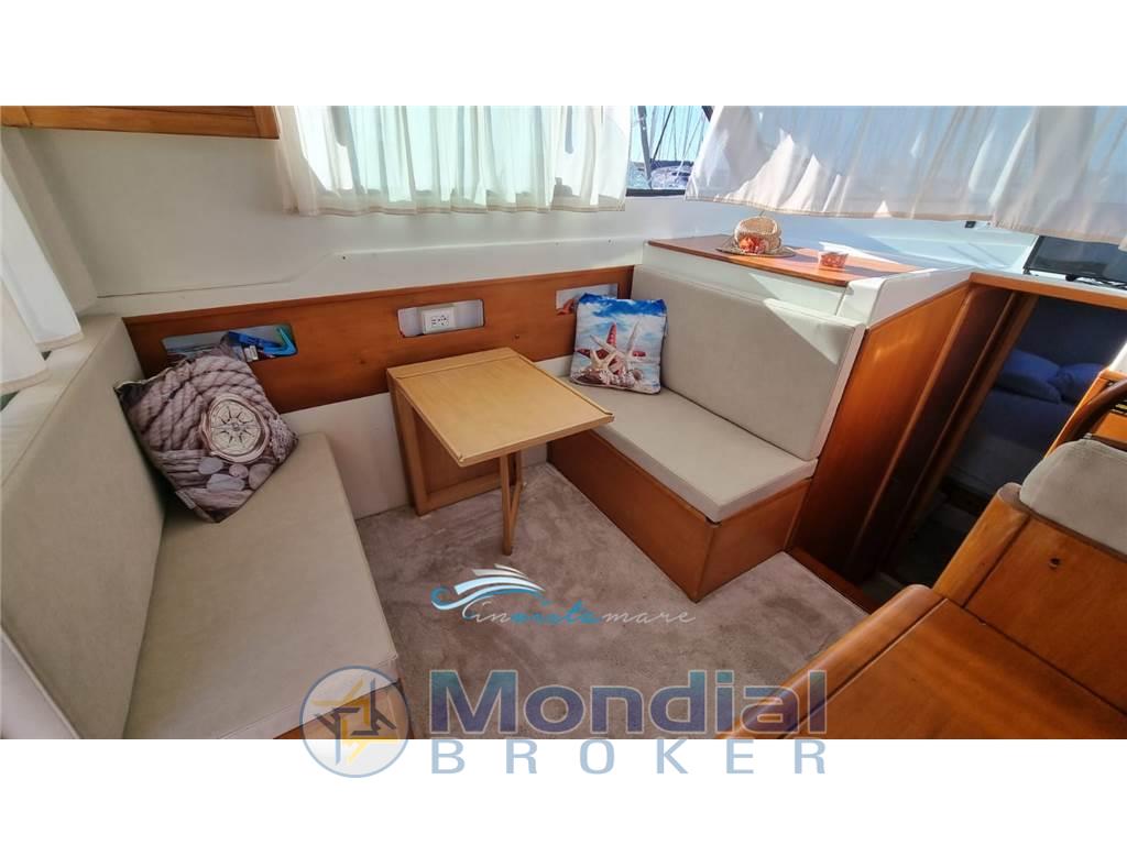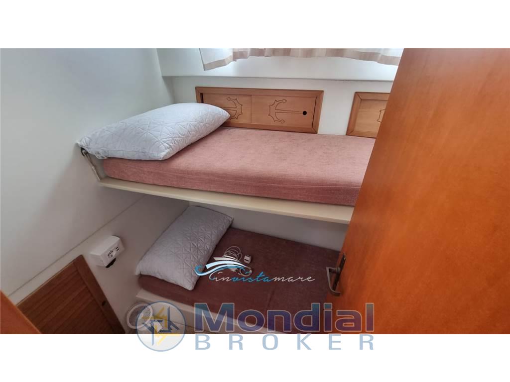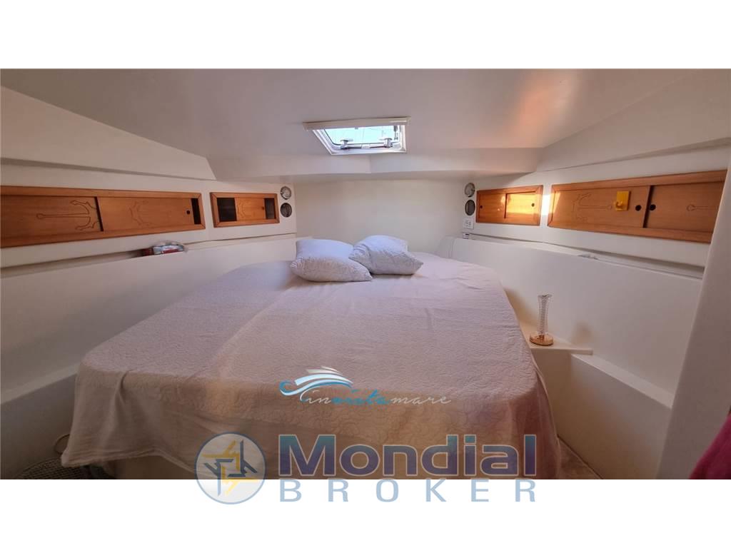 Notas de armamentoBoiler, Cucina, Cuscineria completa, Cuscineria di poppa, Cuscineria di prua, Dotazioni di sicurezza entro 12 miglia, Frigorifero interno, Inverter, Prese interne 12v, Prese interne 220v, Radio AM/FM, Stereo, Tendalino, WC marino elettrico, Dal pozzetto si entra nell'accogliente salone così arredato: sulla sinistra si trova un divano a "L" oppure 2 divanetti frontali sempre con tavolo centrale in entrambi i casi trasformabili in letto matrimoniale, mentre sul lato opposto troviamo l'elegante mobile-cucina e la poltroncina per il pilota che nasconde il lavello. Infine abbiamo la plancia di comando con la strumentazione di controllo per i motori e la zona per il carteggio. SOTTOCOPERTA La zona notte è suddivisa tra la cabina dell'armatore a prua, arredata con letto matrimoniale centrale e armadio, e la cabina ospiti dotata di 2 ampi letti a castello ed armadio. In ambiente separato si trova il locale servizi completo di doccia, lavabo e wc.