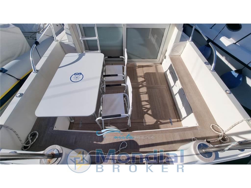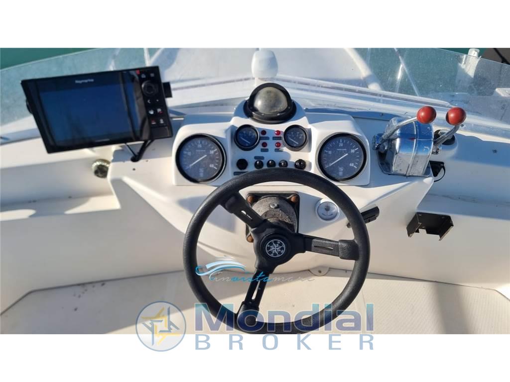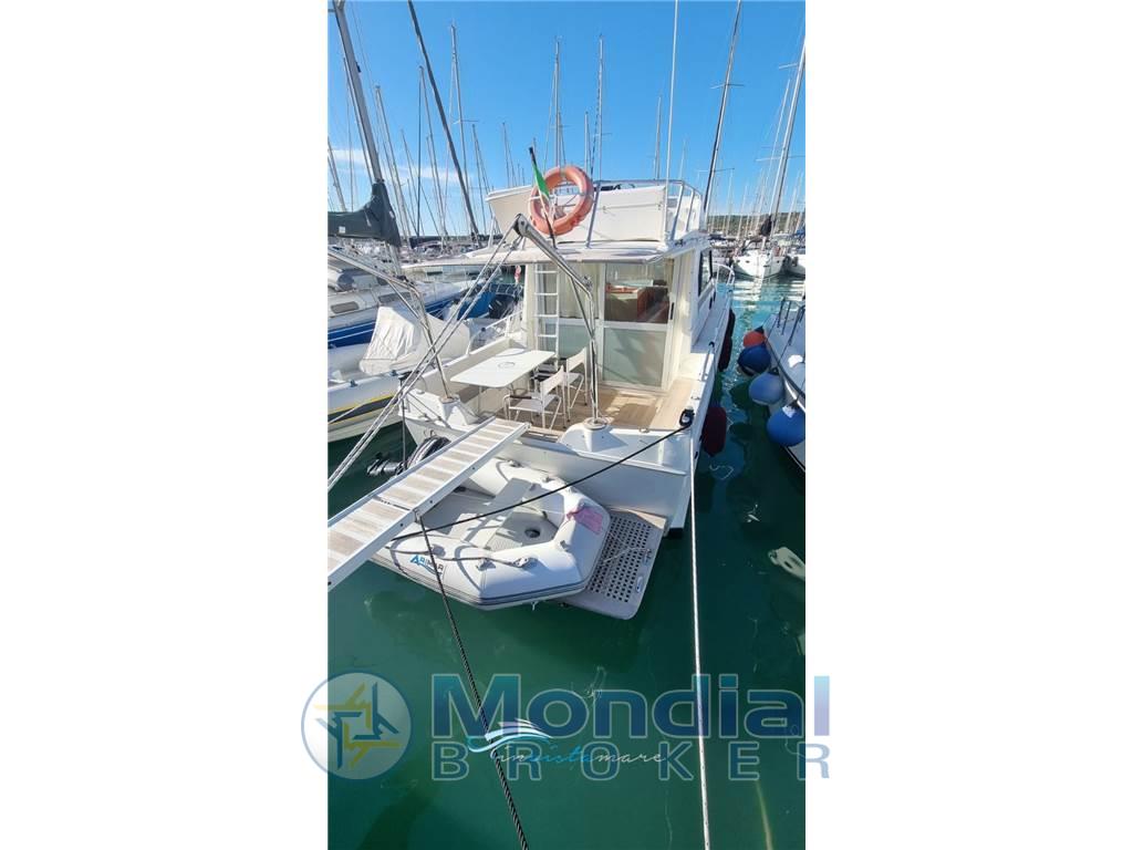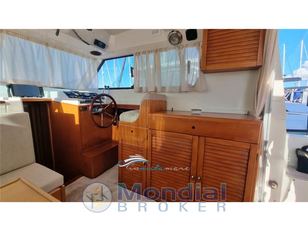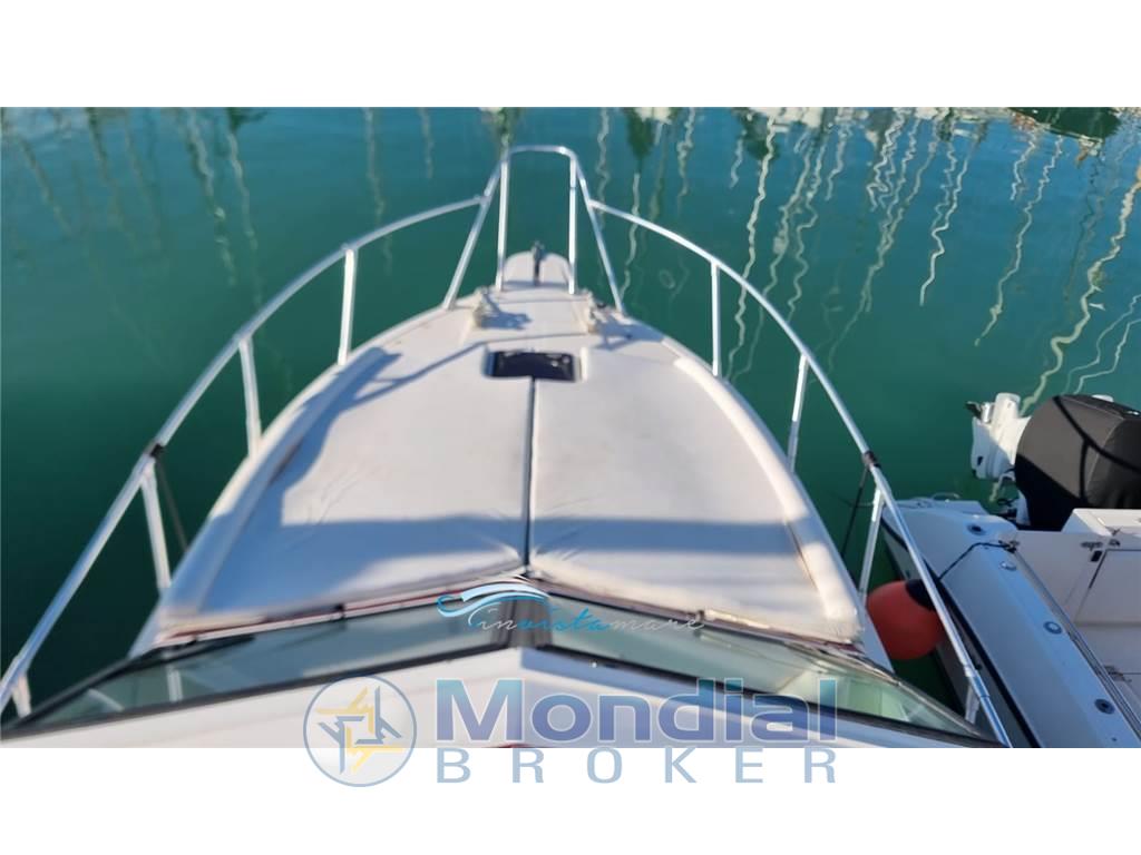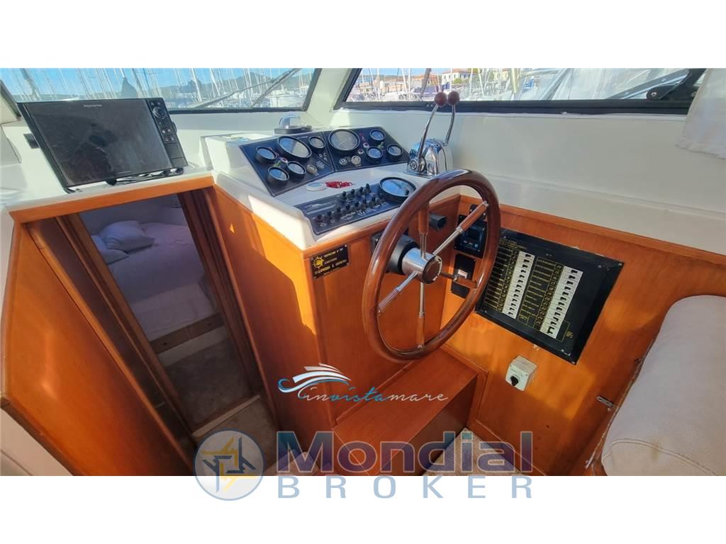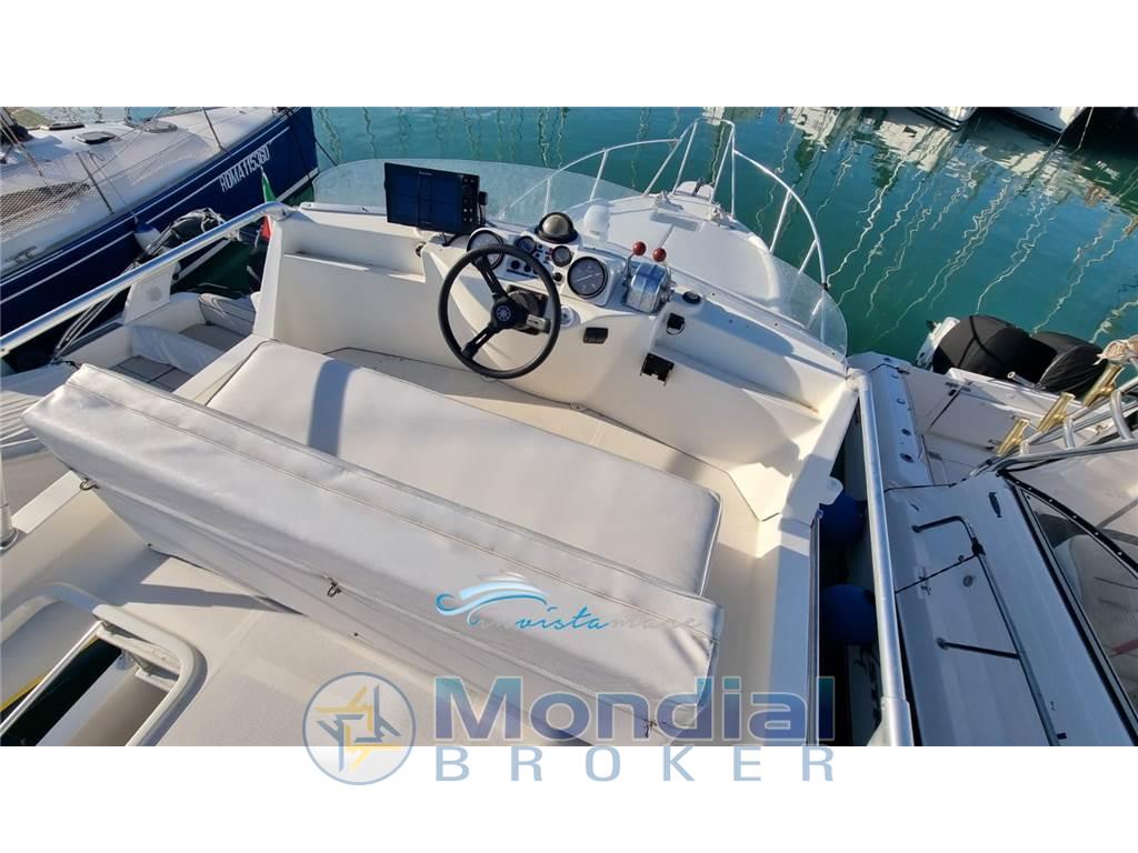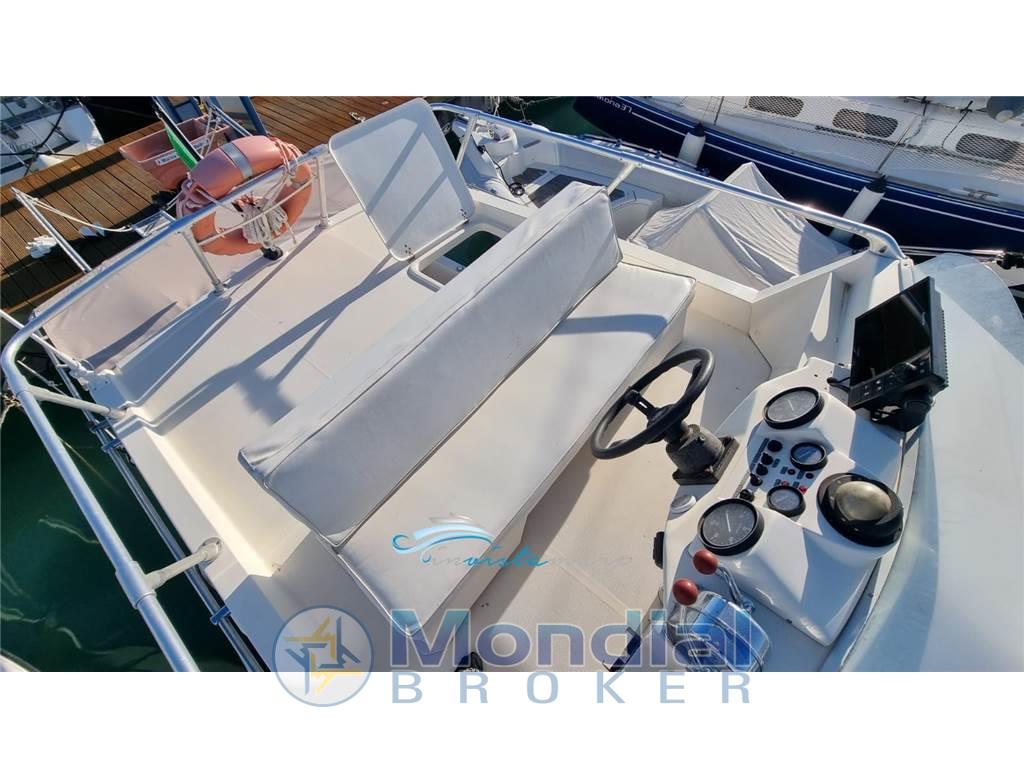 Notas de armamentoBoiler, Cucina, Cuscineria completa, Cuscineria di poppa, Cuscineria di prua, Dotazioni di sicurezza entro 12 miglia, Frigorifero interno, Inverter, Prese interne 12v, Prese interne 220v, Radio AM/FM, Stereo, Tendalino, WC marino elettrico, Dal pozzetto si entra nell'accogliente salone così arredato: sulla sinistra si trova un divano a "L" oppure 2 divanetti frontali sempre con tavolo centrale in entrambi i casi trasformabili in letto matrimoniale, mentre sul lato opposto troviamo l'elegante mobile-cucina e la poltroncina per il pilota che nasconde il lavello. Infine abbiamo la plancia di comando con la strumentazione di controllo per i motori e la zona per il carteggio. SOTTOCOPERTA La zona notte è suddivisa tra la cabina dell'armatore a prua, arredata con letto matrimoniale centrale e armadio, e la cabina ospiti dotata di 2 ampi letti a castello ed armadio. In ambiente separato si trova il locale servizi completo di doccia, lavabo e wc.