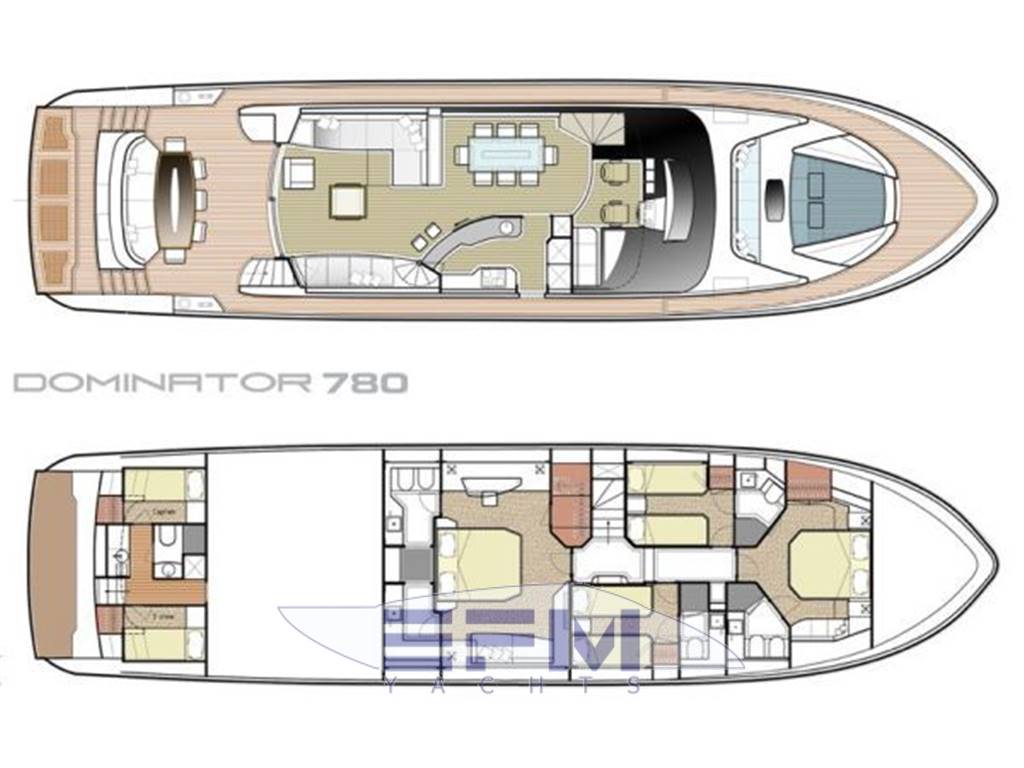 Stunning 780S Dominator maintined in perfect condition. Jacuzzi on bow area. Twin MAN V12 1800hp. 4 cabins ensuite layout + 1 crew cabin two beds aft |