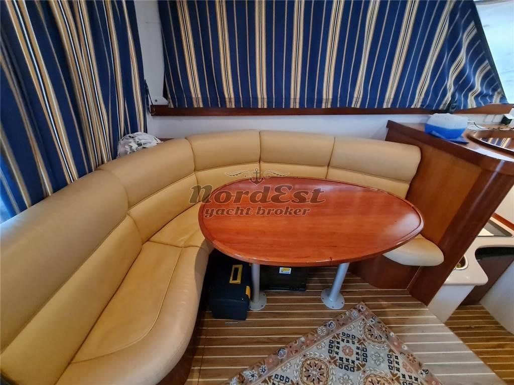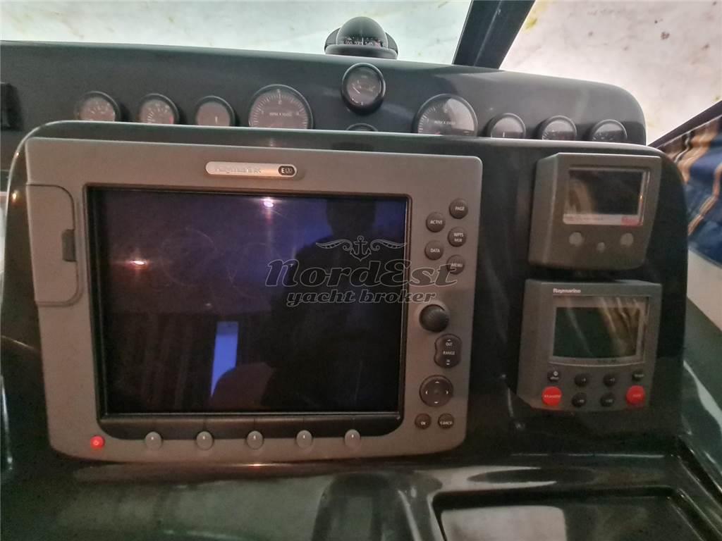 Notas internasInterni: DESCRIZIONE INTERNI Dinette trasformabile, cabina armatoriale matrimoniale, Cabina ospiti con 2 letti in piano ----- Impianto stereo Bagni: 1 Cabine: 2 Posti letto: 4+2 Cucina Forno: microonde Frigorifero Notas de la instrumentaciónStrumentazione completa RAY MARINE: Chartplotter E120 + E80 sul Fly, Radar 24 Miglia, ecoscandaglio 900 mt, autopilota, VHF,Pilota automatico: Raymarine Ecoscandaglio: Raymarine GPS: Raymarine Plancetta: Presente Radar: Raymarine Strumenti meteo Vhf: Raymarine Notas de armamentoDESCRIZIONE IMPIANTISTICA Rivestmento pozzetto in Flexiteek originale, antenna TV digitale con predisposizione in dinette e camera armatoriale, Impianto stereo Radio/CD con casse interne ed esterne, Plancetta di Poppa con scaletta di risalita, Prendisole di prua completo, Pompe di sentina automatiche e manuali. ----- Impianto antincendio Copertura pozzetto Cuscineria prendisole Doccia esterna Elica di manovra a prua: Presente Flaps Luci di cortesia Riscaldamento |
