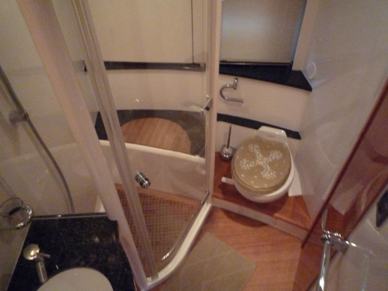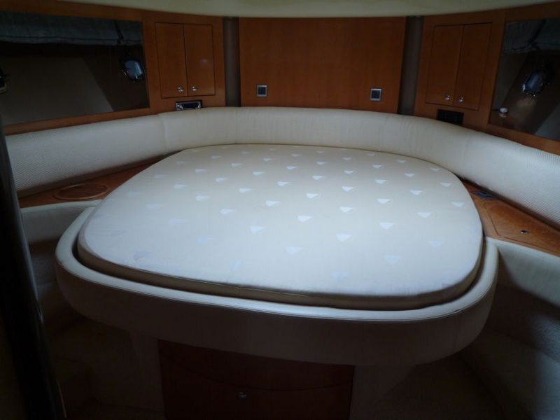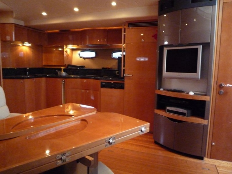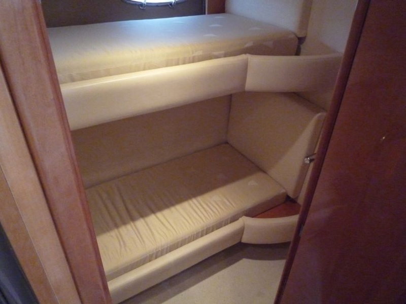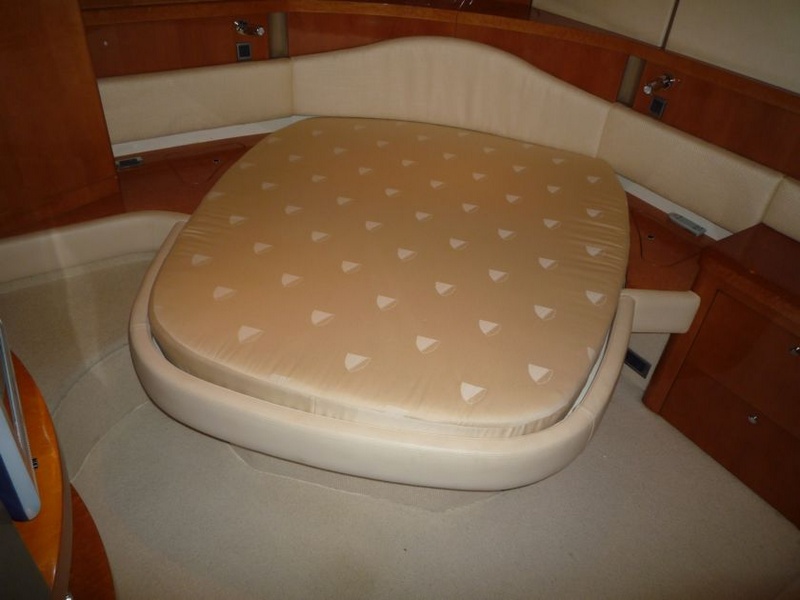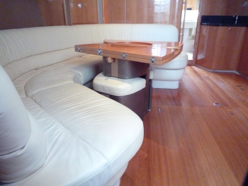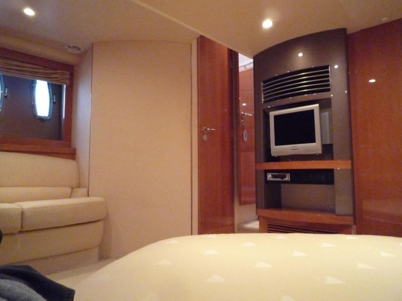 Clásico pulido piso de madera interior cereza y Plaza puente inferior paneles consiste en un gran salón con gran sofá convertible de teca mesa con 2 puff delante del sofá desmontable y crema de microfibra de c un móvil al lado con gran lcd tv y dvd y cd estéreo radio, que conecta con la gran cocina amurallada completa con 4 quemadores horno combi de vcr + nevera + , pared unidades, despensa y lavavajillas.Con la entrada de la sala encontramos hacia la popa a la cabina de invitados con 2 camas literas y vestuario, entrenadores con mobile entra dejó la Suite matrimonial en el centro móvil de dx, bote con 2 plazas sofá, armario, lcd tv wall, baño y aparte ducha, un gran arco cabin vip doble con lcd tv y baño privado con ducha y separado acceder desde el salón con acceso desde la cabina de popa la cabina encontramos Marinero con cama plana, WC, lavabo y ducha y acceso a la sala de máquinas a la lavadora-