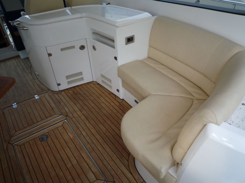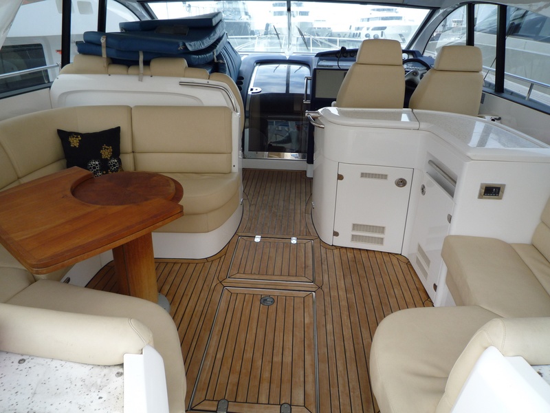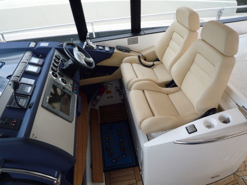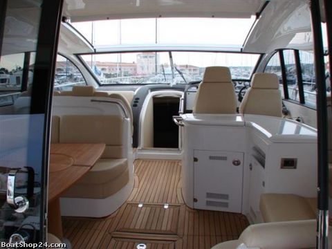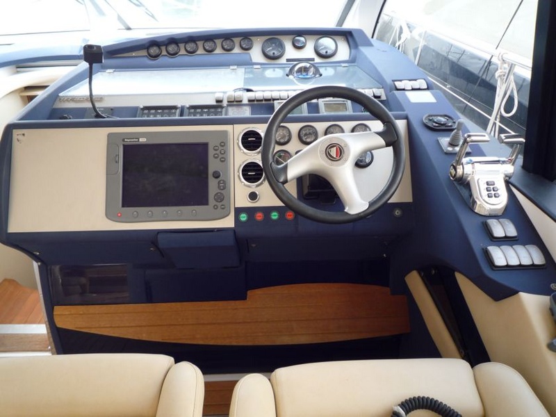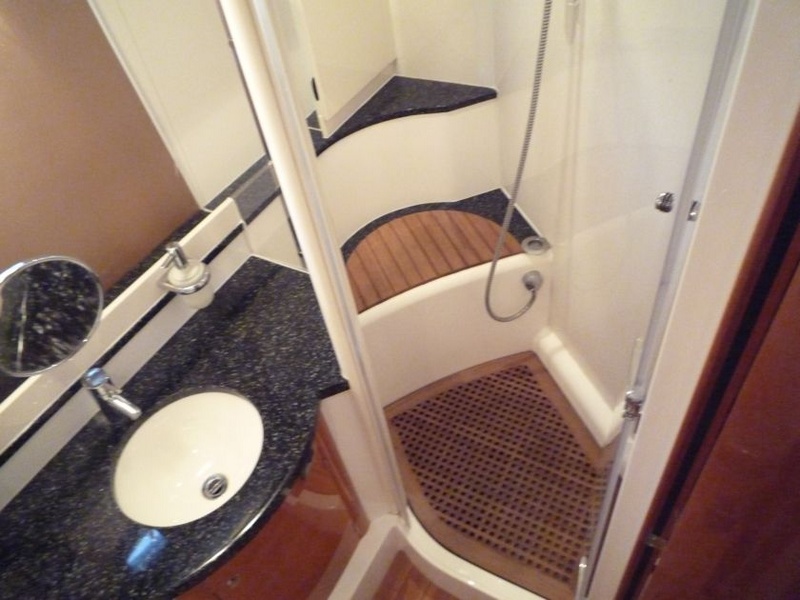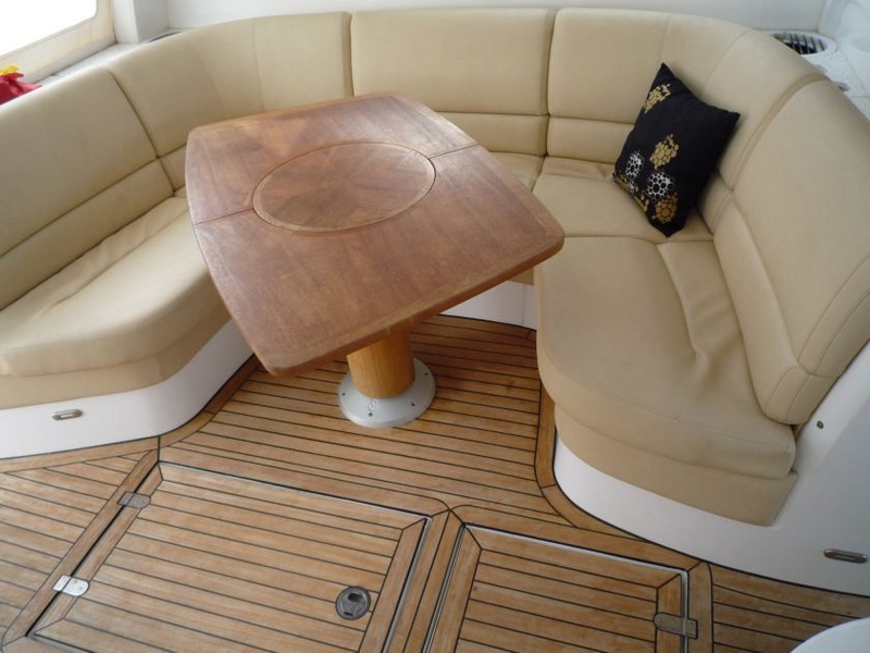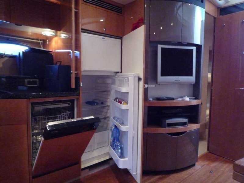 Clásico pulido piso de madera interior cereza y Plaza puente inferior paneles consiste en un gran salón con gran sofá convertible de teca mesa con 2 puff delante del sofá desmontable y crema de microfibra de c un móvil al lado con gran lcd tv y dvd y cd estéreo radio, que conecta con la gran cocina amurallada completa con 4 quemadores horno combi de vcr + nevera + , pared unidades, despensa y lavavajillas.Con la entrada de la sala encontramos hacia la popa a la cabina de invitados con 2 camas literas y vestuario, entrenadores con mobile entra dejó la Suite matrimonial en el centro móvil de dx, bote con 2 plazas sofá, armario, lcd tv wall, baño y aparte ducha, un gran arco cabin vip doble con lcd tv y baño privado con ducha y separado acceder desde el salón con acceso desde la cabina de popa la cabina encontramos Marinero con cama plana, WC, lavabo y ducha y acceso a la sala de máquinas a la lavadora-