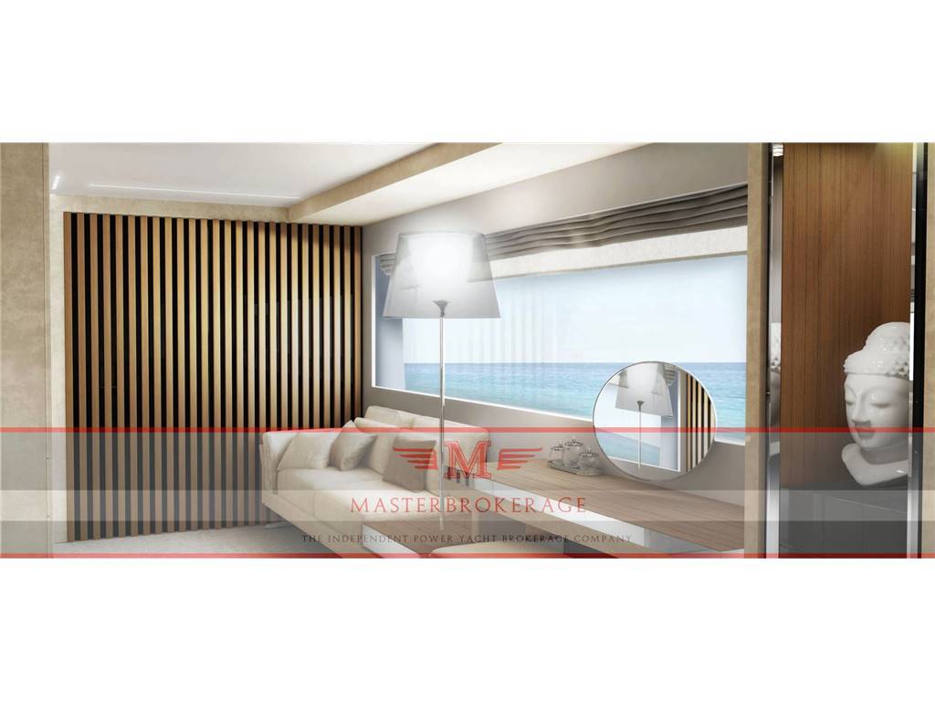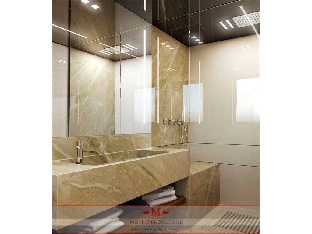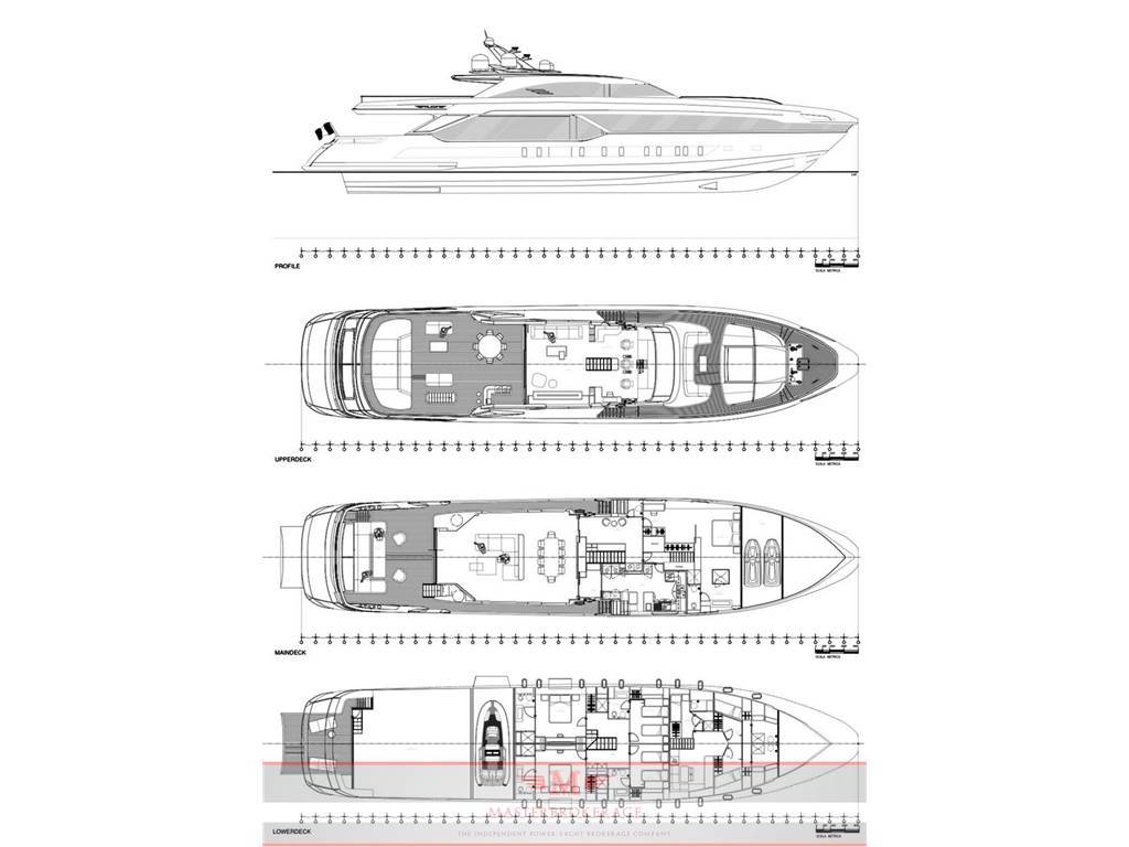 Notas internasGUEST CABINS: 1 Owner’s suite + 2 VIPs +2 Guest cabins CREW CABINS: 1 Captain + 2 twin crew HOUSEHOLD APPLIANCES MAIN SALON • 2 wine cooler • 1 Ice-maker GALLEY MAIN DECK • 4 fridge/freezers; • 1 oven; • 1 cooking top; • 1 Grill; • 1 Dishwasher; • 1 Ice-maker • 1 Hood AFT DECK • 1 fridge UPPER DECK (AFT AREA) • 2 fridge • 1 Ice-maker • 1 Dishwasher • 1 grill CREW MESS LOWER DECK • 1 mirco-wave • One fridge • 1 dishwasher CREW LAUNDRY LOWER DECK • 1 washing machine professional • 1 dryer machine professional PANTRY MAIN DECK • 1 fridge • 1 icemaker • 1 wine cooler MASTER SUITE • 1 fridge GUEST CABINS • Each (4) one fridge Notas de la instrumentaciónNAVIGATION SYSTEMSWHEELHOUSE • N.5 Monitor Hatteland 24” touch screen • FURUNO NAVNET TZT2 Black Box with chart data megawide mm3 e remote controller MCU-004 • Hub Navnet TZT: Ethernet hub Furuno 101 with converter SD-50B-12 • Professional navigation PC & Maxsea timezero professional • Radar #1: FURUNO DRS25A-NXT UHD Solid state • Radar #2: FURUNO X BAND FAR2228BB (Wheelmark) • N.2 GPS/Heading sensor: NMEA 2000 SCX-20 • NMEA 2000 Junction box • Network Sounder #1: DFF3D Multibeam • Transducer #1: Multibeam B54 Thru-Hull Bronze • Network Sounder #2: BBDS1 • Transducer #2: B744VL Bronzo • Autopilot: Simrad AP70 MK2 IMO Pack analog with remote unit FU-80 helm seat • Wind weather sensor AIRMAR 220WX • Furuno AIS Transponder • Navtex receiver NX7008 (Wheelmark) • BNWAS System (Wheelmark) • Heading Sensor SC-70 (Wheelmark) • Navigation doppler speed log (Wheelmark) • Main VHF Furuno FM8900S (GMDSS) + Antenne • EPIRB Safesea pro cat1 GPS auto • VHF Safesea V100 (GMDSS) • SART Safesea S100 CREW MESS/ DINETTE • Furuno Navnet TZT3 16” • VHF Remote handset HS-4800 with speaker SP-4800 ENGINE CONTROL ROOM • 1 x Monitor hatteland HD 15T21MMD 15” CCTV43222222 • 1 x 9003 substation for headset engine room • 1 x 9001 indoor unit STEERING GEAR ROOM • 1 X RF14XU FEEDBACK AUTOPILOT • 1 X COMPASS REPETER RD-50 • 1 x 9003 - SUBSTATION FOR HEADSET WING STATIONS • 1 X FURUNO FI-70 MULTIFUNCTIONS DISPLAY DATA REPEATER • 2 X SIMRAD VHF HS 35 WIRELESS • 1 X 13” Touchscreen Monitor for CCTV control/Display CCTV EQUIPMENT • 9 X CCTV AXIS camera PTZ P5514-E (1 X Arch, 1 X Flybridge, 3 X External Main Deck, 2 X Engine Room, 1 X Garage, 1 X Beach Area) NETWORKING • 1 X NETGEAR GSM7248P 48 PORT POE • 1 X NETGEAR GS748T 48 PORT • 1 X NETGEAR WC7600 Wireless Controller • 12 X A.P. NETGEAR WAC720 • 1 X PEPLINK MAX-HD4-LTE E T • 2 X BANTEN WI-FI ANTENNA 02188 VOICE COMMUNICATION • 1 X PANASONIC KX-NS500NE • 2 X IP PHONES PANASONIC KD-DT543NE (WHEELHOUSE, E.C.R) • 15 X PANASONIC KX-NS0154CE DECT MULTI CELL • 18 X PANASONIC KW-TCA185CE CORDLESS PHONE SAT ANTENNA • 1 X SAT INTELLIAN TV SAT T100 STAB W • 1 X INTELLIAN VSAT V100GX 3-AXIS Notas de armamentoPROPELLERS: 2 x screw propellers, fixed pitch, 5 bladesGENERATORS: 2 x Kohler 75 kW TRANSMISSION: 2 x ZF 5350 SERIES STABILIZER: Zero speed (2x fins stab., one each side) BOW THRUSTER: 50 kW Electric 400V-50Hz approx BILGE/FIRE-FIGHTING PUMO SYSTEM • 2 x Pumps Gianneschi • 1 x Bilge Oily water tank with capacity according to tank capacities • 1 x emergency pump outside engine room AIR CONDITIONING SYSTEM The air conditioning is tropical system, Condaria or equivalent chiller unit. DECK EQUIPMENT - BOW • 4 mooring bollards in SAE316L • 2 Fairleads with rollers in SAE316L • 2 Electric Windlasses 5500W each, with local controller from wheelhouse and remote control • Anchor pocket in SAE316L • High resistance anchor chains with chain counter, length 110m, two of ø 16, • Two high holding power anchors 160kg each - SIDES • 4 Mooring bollards in SAE316L • 4 Fairleads in SAE316L - STERN • 4 Mooring bollards in SAE316L • 2 Fairleads in SAE316L • 2 Aft capstans of 4000W TENDER AND JET SKI - Tender • Floodable Garage door on starboard side suitable for a 6,20 m tender - Jet ski • Bow garage with travel lift • 2 Jet ski Sea Doo RXP-X |
