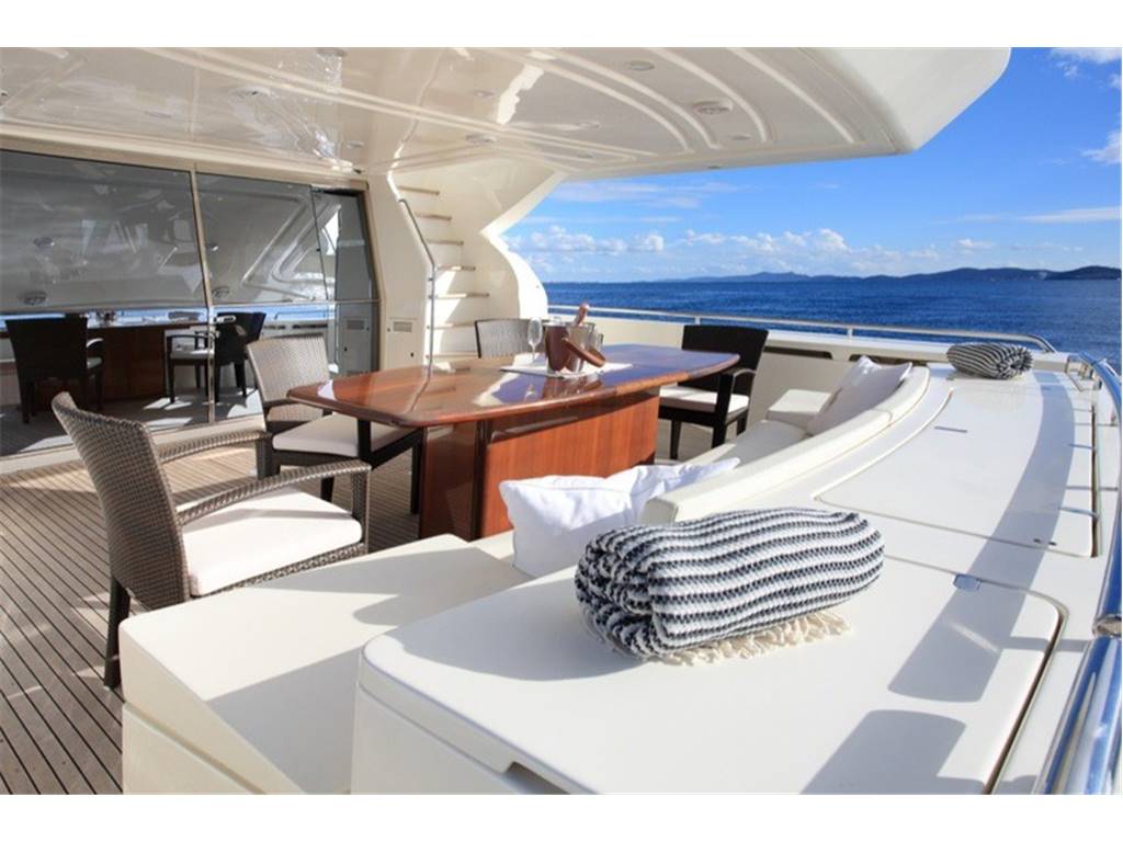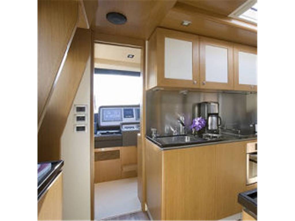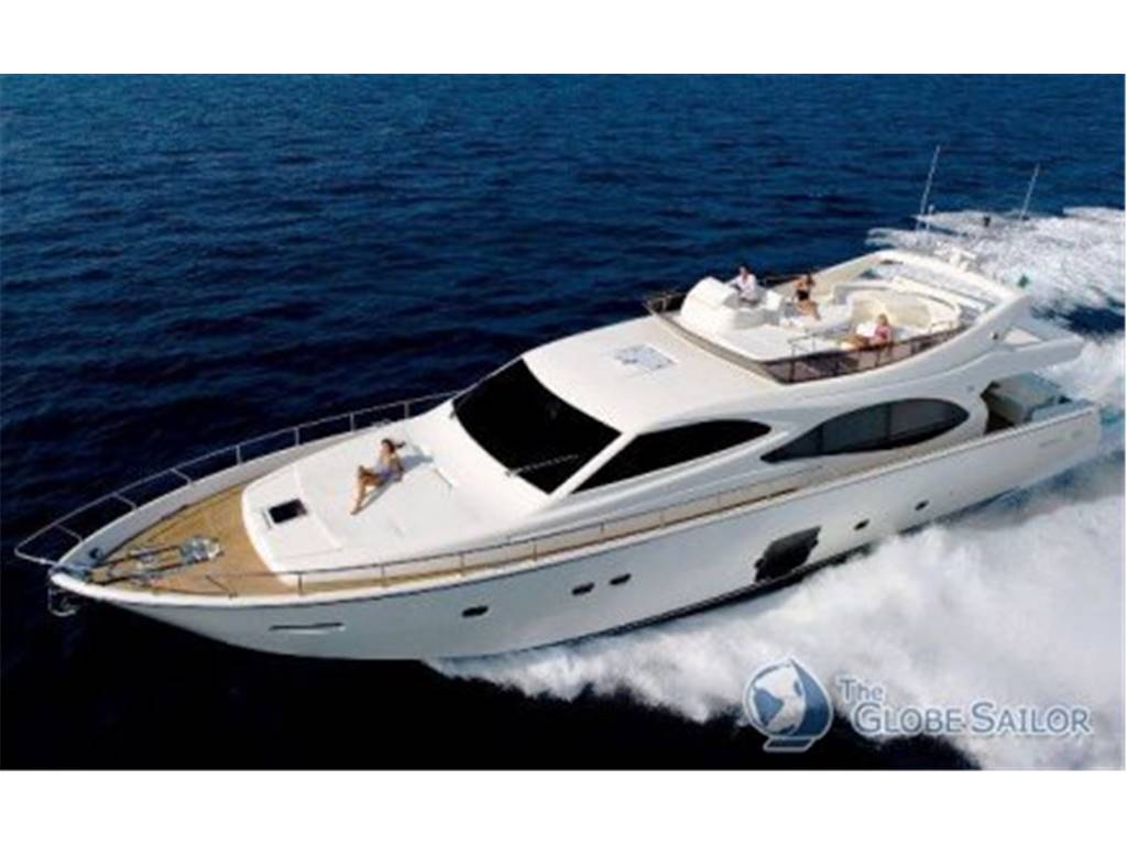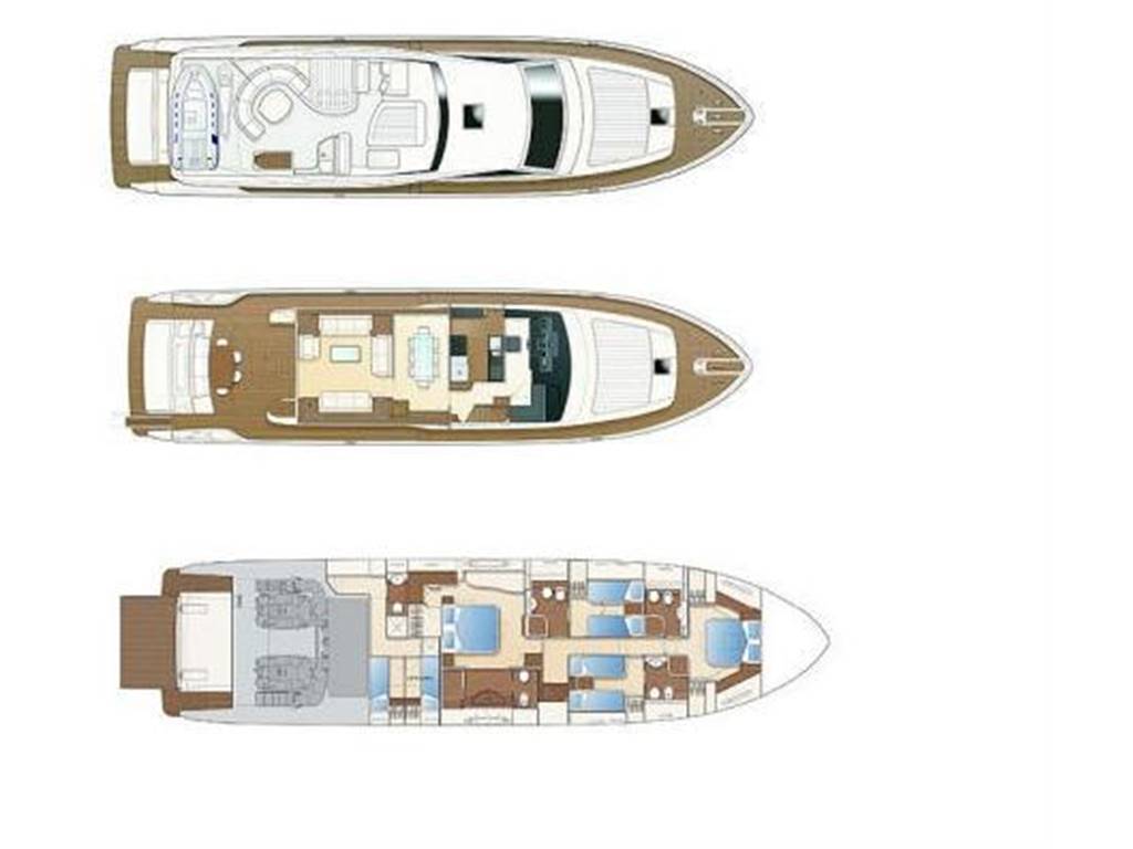 Notas internasCabina armatoriale a centro barca con bagno privato Cabina VIP a prua con bagno privato Cabina ospiti con letti doppi con bagno privato Cabina ospiti singola con bagno privato Cabina equipaggio con due letti singoli con bagno privato Notas de la instrumentación- VHF- GPS PLOTTER ADDIZIONALE “GEONAV SUNSHINE”- AUTOPILOTA “RAYMARINE ST 6002”- TRIDATA “RAYMARINE ST 60”- RADAR 36 Mg 15”- SSB- BUSSOLA ELETTRONICA “RAYMARINE”- TVCC CON MONITOR DA 10‘ IN PLANCIA ( 3 TELECAMERE: SALA MACCHINE + POZZETTO )- ELETTRONICA DOPPIA RIPETUTA SU FLY- TV LCD 42" CON SISTEMA SALISCENDI + DVD IN SALONE + TV LCD DA 26" + DVD CABINA ARMATORE + TV LCD DA 15" NELLE ALTRE CABINE- IMPIANTO SURROUND- ALTOPARLANTI STAGNI IN POZZETTO12 Altoparlanti, 3 Telecamera (rear+engine room), 4 Decoder satellite, 4 Piastra in vetroceramica, 4 TV (45' up/down TV at saloon), 5 WC marino elettrico, 8 Prese interne 220v, Antenna Satellitare TV (Navysystem 65 NT), Aria condizionata (Full troughout), Asciugatrice, Bimini, Boiler, Clima reversibile, Congelatore, Copripozzetto, Cucina, Cuscineria completa, Cuscineria di poppa, Cuscineria di prua, Cuscineria fly, Cuscineria Pozzetto, Dissalatore (Idromar Up to 300Lt/h), DVD, Fornello, Forno, Frigorifero esterno, Frigorifero interno, Home Theater (w/NAS for film storage), ICE Maker, Impianto TV, Inverter, Lavasciuga, Lavastoviglie, Prese interne 12v, Stereo Notas de armamentoAnti Rolling Gyro Mitsubishi (2) MSM-4000 and MSM-4000Bimini top Third control station in cockpit Spare propellers Spare shaft Stern thruster (15-20HP) Electric cooking top on the fly Hard top in fibreglass with electric canopy Salon Cooler with drawer 75lt 24V Aft sliding door and tilt window, both in stainless steel frame HI-FI surround system Playtime master with 2 loudspeakers and subwoofer and 2 loudspeakers in the cockpit Furnishings to accomodate TV Fully fitted carpet Indirect lighting LCD TV 26" Plisse curtains Dinette with 3 sofas and armchair upholstered in leather, coffee table and side furnitures Car-stereo CD with 2 loudspeakers Ceramic cooking top with 4 rings and pan holder Complete set of ceramic crockery and plates, glasses and stainless steel cutlery, for 12 people Cupboards Dishwasher for 8 (45cm) Electric/microwave combined oven Extractor fan ducted externally 230V Fridge, 276lt and freezer, 74lt 230V (24V through inverter) Granite work counter top with 2 sinks Overhead lockers Vinyl wooden floor Side electric exit door Skylight with blind Saltwater outlet Sliding doors between galley and bridge and between galley and dining area Air conditioning throughout (72,000 BTU/h) Bilge pump with 1 electric self-priming pump with 5 switches (bow-clear waters-waste waters-engines-spoiler-crew cabin) Bilge pump system with 4 electric diving pumps (of which 3 are automatic) Cathodic protection with zinc anodes Electric system consisting of: 24V lighting throughout 100Ah 12V auxiliary generator battery 185Ah 12V generator battery 555Ah 24V engine starting batteries (6) 925Ah bank of batteries for service (10) 180Ah 24V bank of batteries for thruster (6) 100A 24V automatic battery charger Auxiliary generator 5000W Electric outlets 230V throughout Generator 20000W Battery disconnecting switches Mechanical and instant battery parallel switch from the bridge Inverter 24Vdc/230Vac 3000W with battery charger Combi 100A Shore plug 63A 230V Electric WC system with fresh water Electrohydraulic powered steering Fire extinguishers Fresh water system 24V autoclave pump with electronic control Fresh water tank 1320lt Gray water sump pump with automatic electric pump Grey water tank 170lt Holding tank 330lt with gauge (3/4 and full) Hot water system with water heaters 80l 230V Remote engine and generator shut down Sea water system 24V autoclave pump at bow, transom and galley Silenced underwater exhausts Smoke detection alarm in the engine room Stuffing box with dripless shaft seal Trim tabs (Flaps) VHF (2) Waste water system with automatic electric and manual pump TV/telephone shore supply 230V shore line cable 15mt Access to the swim platform through steps, both covered in teak Aft sliding door and tilt window both with stainless steel frames Boat hooks (2), housed Bow pulpit with side rails Bow hawses (2) Bow thruster (20HP) Bruce style anchors (2) 30kg with 2 chains (100mt and 75mt, diameter 12mm) Canopies for protection of front and side windows in the bridge Capstans 700W (2) with switch Cleats midship (2 each side) Cockpit lights Cockpit chairs (4) Cushions with backrest for cockpit bench Electric windlass 2000W (2) with controls on foredeck, bridge and Flying bridge Electrohydraulic, hidden-away ladder to water in the aft swim platform Electrohydraulic telescopic gangway in painted stainless steel and teak with remote control External acoustic alarm for bilge water level fore, engine room and spoiler Extensible teak cockpit table (2100mm x 950mm) with storage for chairs Fairleader for head-on mooring Fenders (8) and spherical fenders(2) Garage at stern for storage of jet ski (optional): Stand up models: type Kawasaki 800 SX-R Two seat models: the availability of the models that can be fitted is to be checked upon the order Note: when the stern thruster (optional) or spare propellers (optional) are installed, no two seat model can be stored Garage with electrohydraulic hatch covered in teak on the internal side Hatch in the cockpit giving access to engine room with ladder Mooring lines (4) of 15mt Icemaker with independant tank Indirect deck lighting Ladder to the flybridge in fibreglass and teak Perimetrical curtain rod for canopies Remote shut off for engines and generator fuel hoses Salt water outlet at transom, in the forepeak and in the galley Shower with hot/cold water at transom Side electric exit door Stainless steel deck hardware Stereo loudspeakers (2) in the cockpit Stern bench with access to engine room with fully fitted sink with hot/cold fresh water and salt water St