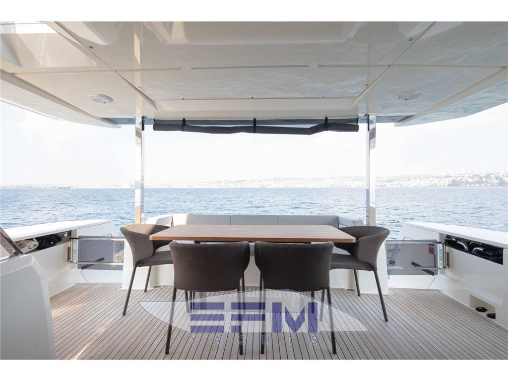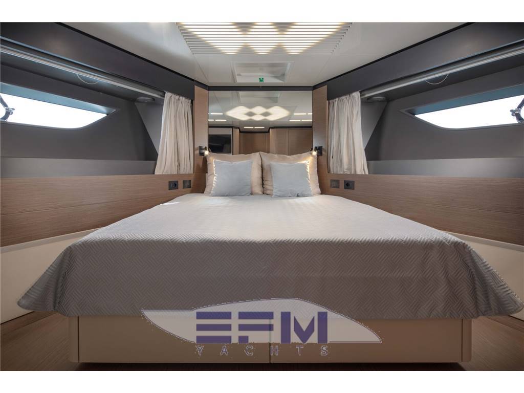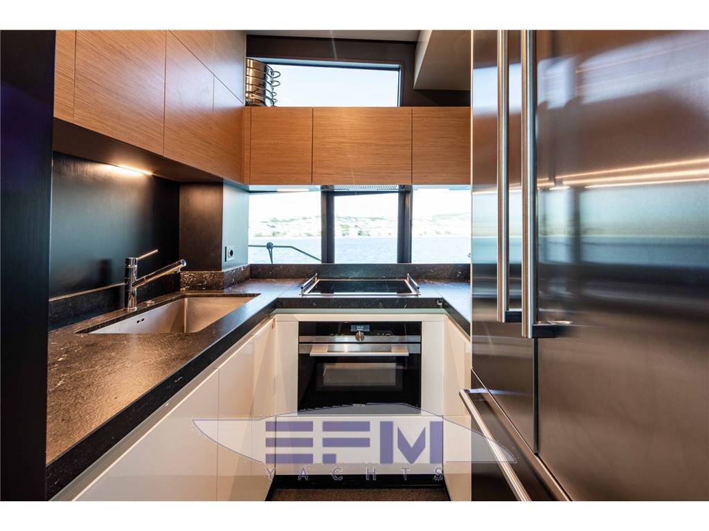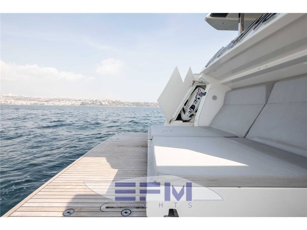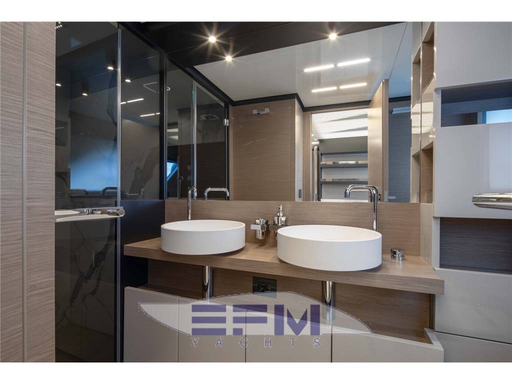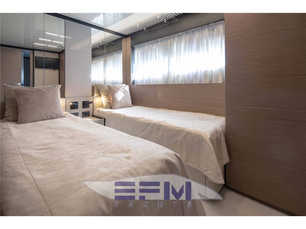 Notas internasAccommodation for up to eight guests across four elegant staterooms, each designed with meticulous attention to detail. The yacht also includes quarters for up to three crew members (including the captain) throughout one captain’s cabin and one twin crew cabin ensuring exceptional service and a seamless experience on board Crew cabin (for 3 person) and bathroom instead of storage LAYOUT Guests 8 Cabins 4 Heads 4 Crew 3 Cabin 2 Head 1 Notas de la instrumentaciónBridge EquipmentSimrad touch full upgrade: 3 x sim rad platinum chartplotter on lower helm, 2 sim rad chartplotter on flybridge, Depthsounder, Radar, Log-Speedomete,r Autopilot, Compass, GPS, VHF Stabilisers Seakeeper16 + fin Air conditioning Tropical (salon + cabins + 2 crew cabins) Watermaker Idromar 180 l/h Bow thruster Side Power Stern Thruster Side Power Boilers 2 Fuel Separators Racor Generators 2 x Cummins 19kW Generator hours 1700 Anchors and chains Delta 40kg+30 kg 150 m + 40m Passarelle Opacmare Swimming platform H+B technics GMDSS Equipment : Antenna tv sat kvh tv6 with receiver in salon A ntenna tv sat kvh tv6 empty dome for roll-bar symmetry Racor filter for generator (2) Smoke separator for generator (4-19 kw) Watermaker: 180 l/h idromar Fixed control station with cover Shore fresh water intake Electric searchlight: big rectangular Stabilizers: zero speed fins Stabilizers: seakeeper ng 9 Predisposition for crane on flybridge Control unit op12 for simrad autopilot Cctv: indoor color tv camera (2) - engine room Cctv: outdoor color tv camera - cockpit Tvcc: switch for tvcc cameras Notas de armamentoINTERIOR FIXED FURNITURESide -by-side refrigerator without ice-dispenser with inverter - diff. Copilot seat Blackout roll in vip cabin Parquet in main deck Moquette lower deck French bed in the starboard guest cabin INTERIOR LOOSE FURNITURE (ROOM BY ROOM) T v 55’’ salon + home cinema T v 55’’ salon + home cinema Tv 22’’ guest (stbd) Tv 22’’ guest (port) Hi-fi stereo fm/cd/dvd w/loudspeakers Galley equipment: fridge, freezer, oven, hob, dishwasher Wine fridge for 6 bottles Dinner table for 8 persons in Saloon EXTERIOR FIXED FURNITURE (DECK BY DECK) Fore led lights Lights in staircase to aft platform Lights in staircase to flybridge Lights in staircase to lower deck Dimmer for lights in cockpit Cooler drawer Sidedeck courtesy lights Teak flybridge and sidedecks Teak lifting platform Underwater light (4) Fixed glass roof EXTERIOR LOOSE FURNITURE (DECK BY DECK) Garbage bin in cockpit Teak table at bow with stainless steel base Wetbar at flybridge (grill gaggenau + sink + fridge 50l) Manual bimini at the bow with 4 carbon poles Bimini with 4 poles aft flybridge Privacy screen in cockpit and sides Bow hi/low table on flybridge Sofas with table on flybridge Table in cockpit Transforming stern into sunbeds at bathing platform Audio control panel and speakers at bathing platform Storage for seabobs in sidedecks at bathing platform Shower at bathing platform 2 Sun loungers at aft flybridge Tender Williams SportJet 395 Toys Paddle boards |